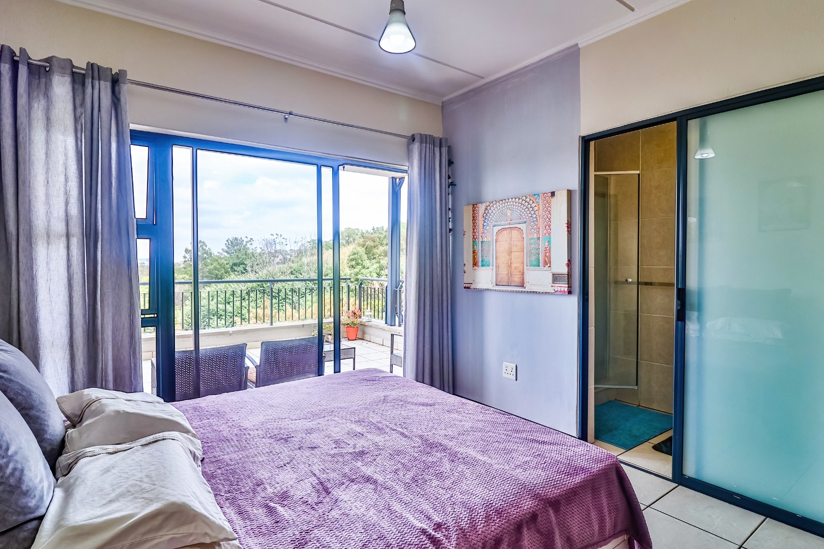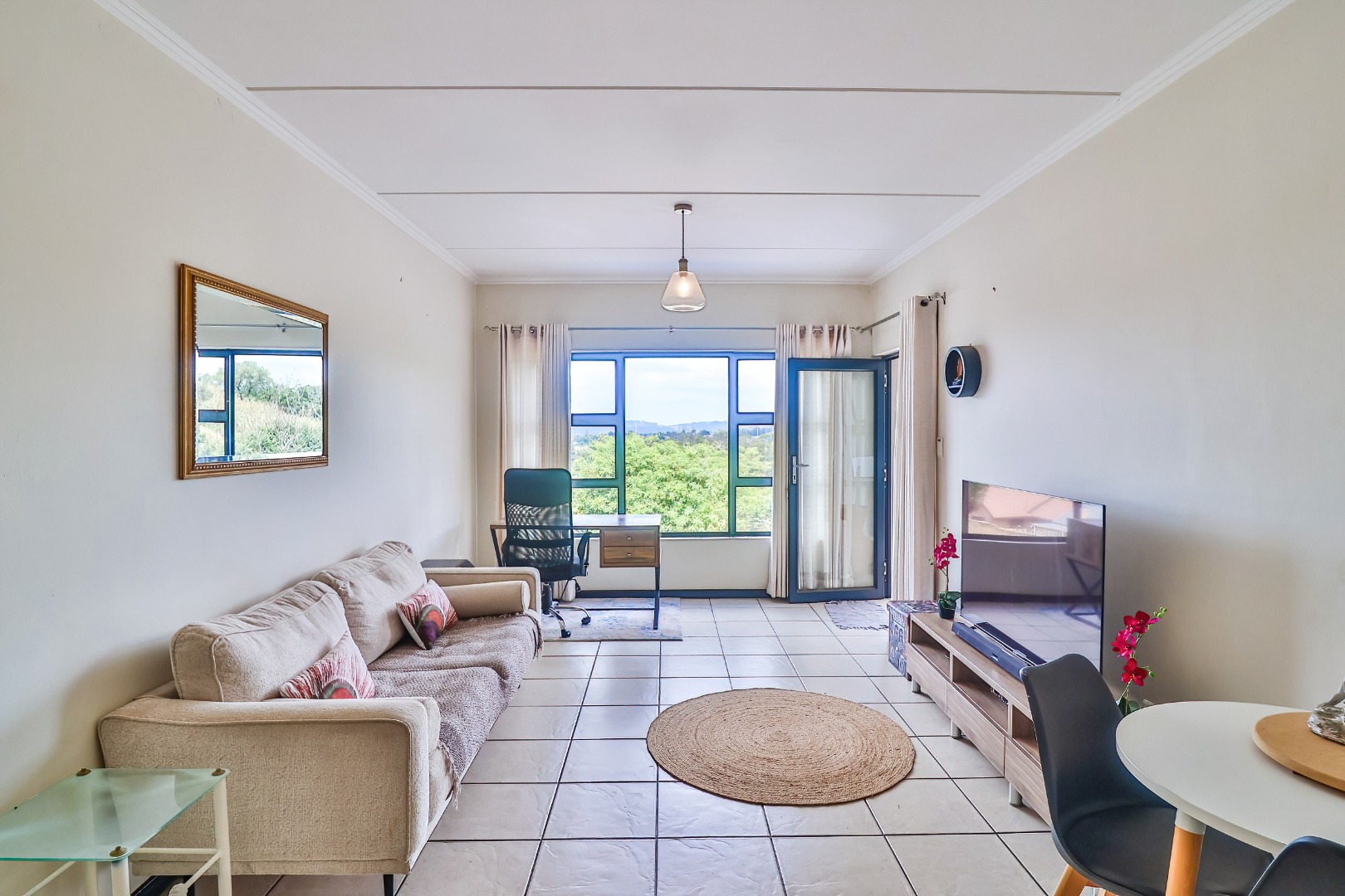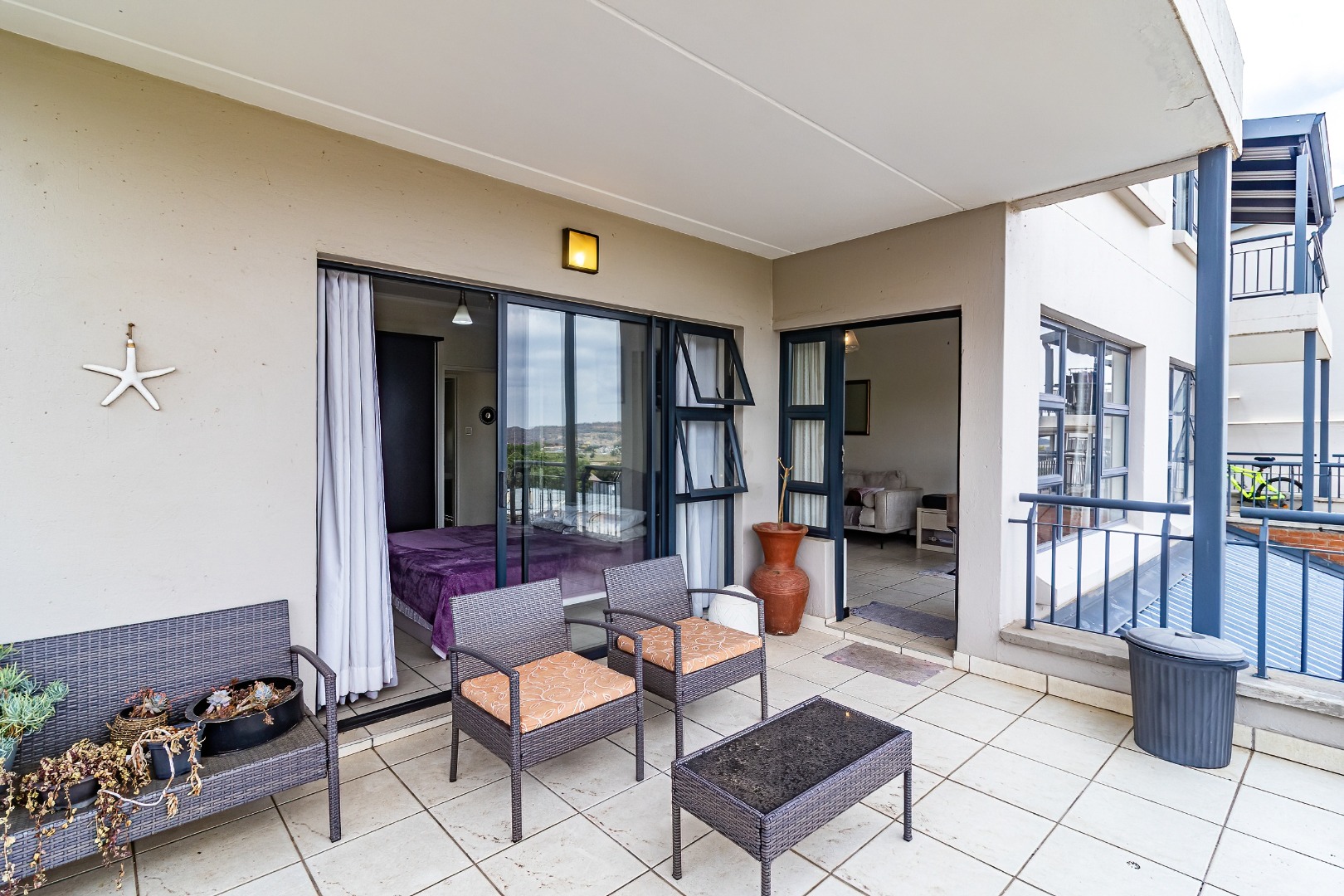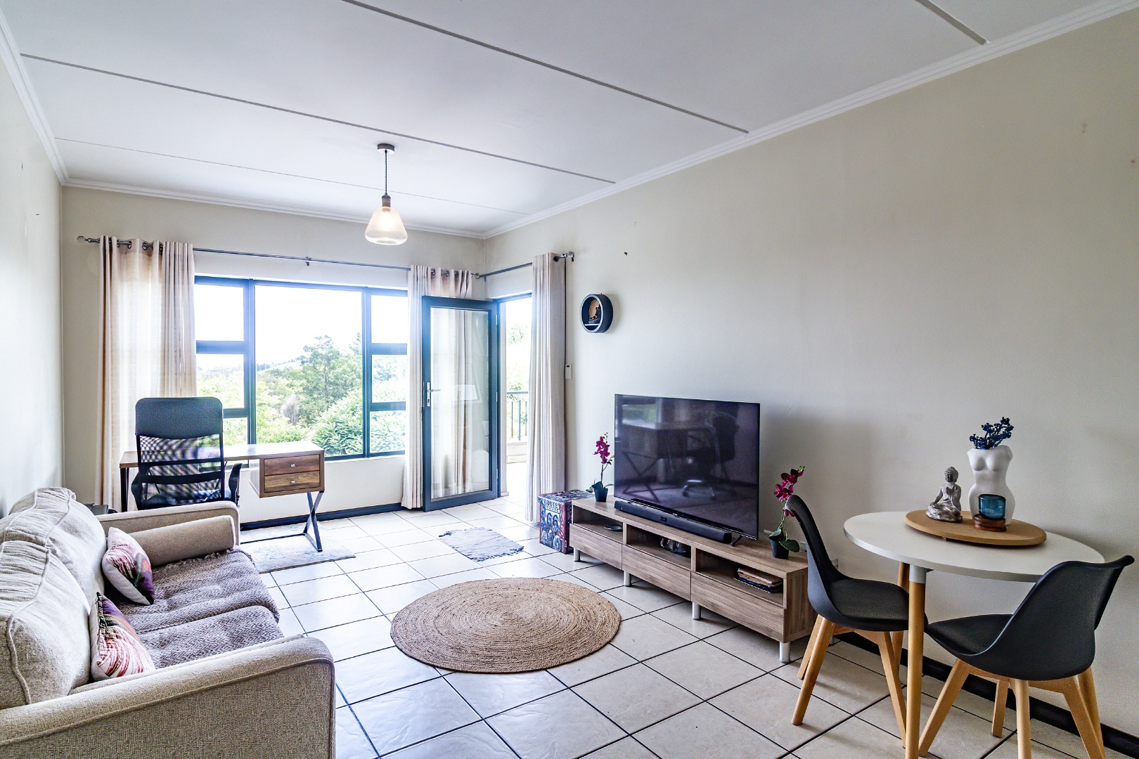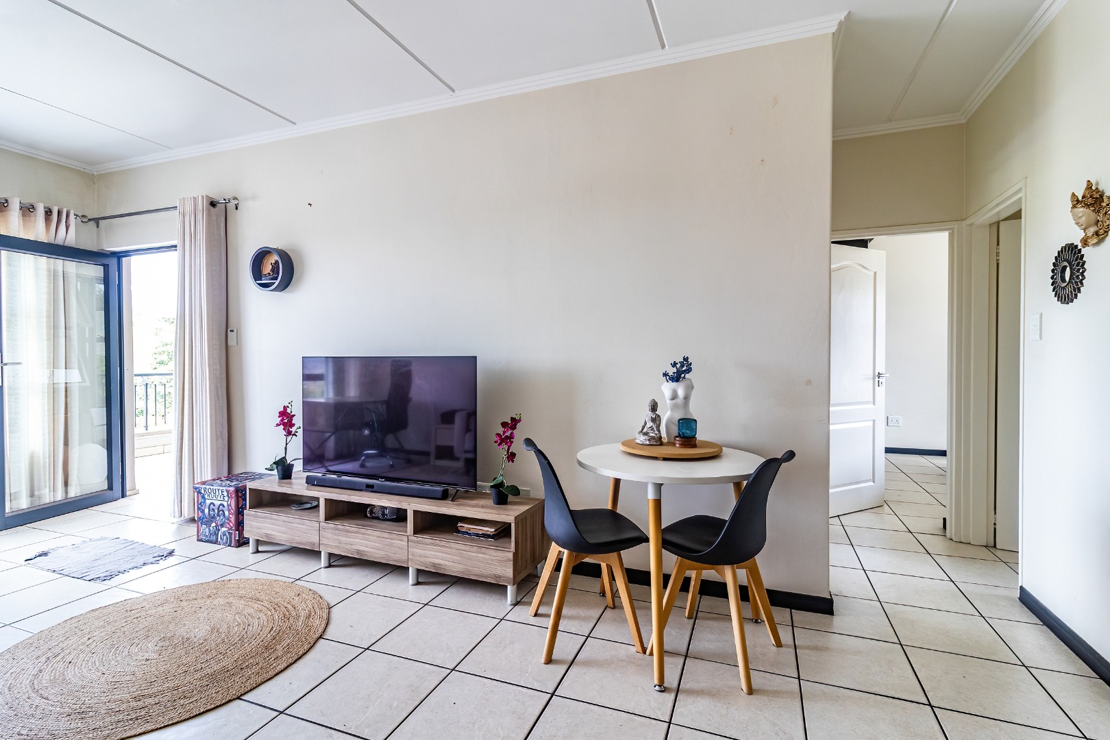 Both bedrooms feature built-in cupboards; the main bedroom includes an en-suite bathroom for added privacy. The second bathroom services the guest/second bedroom with modern finishes. The living area leads out to a generous balcony where you can relax with views over the pool/green area (assuming typical orientation) — ideal for sundowners or quiet mornings.