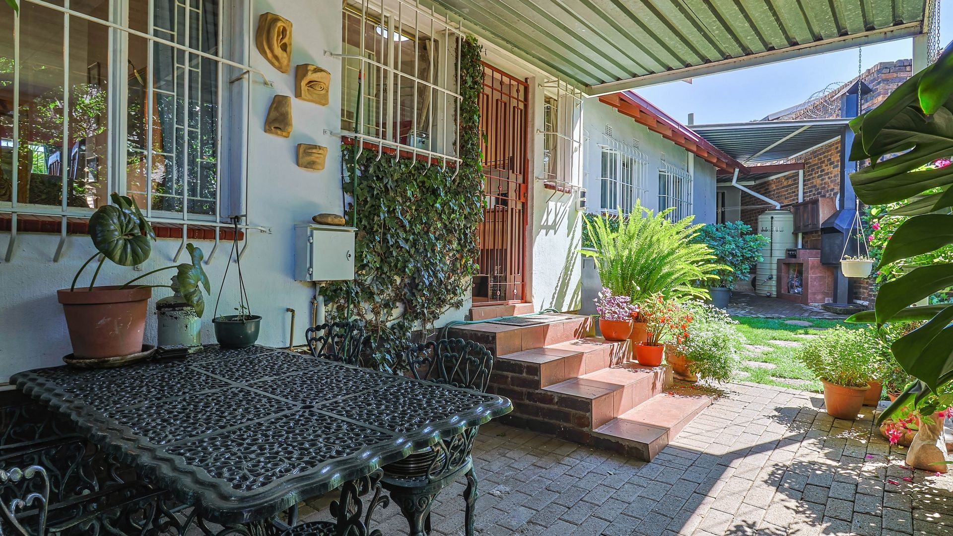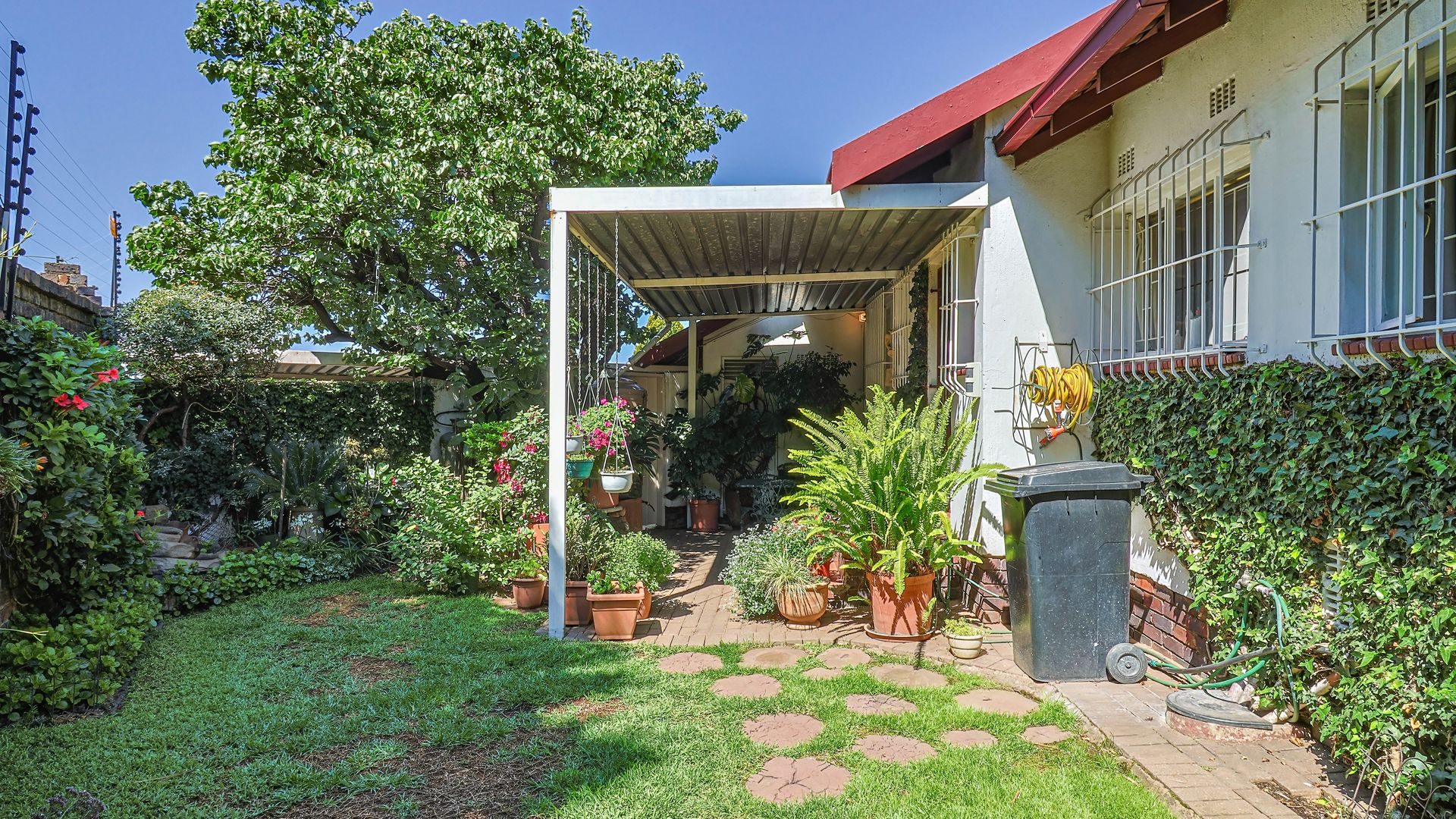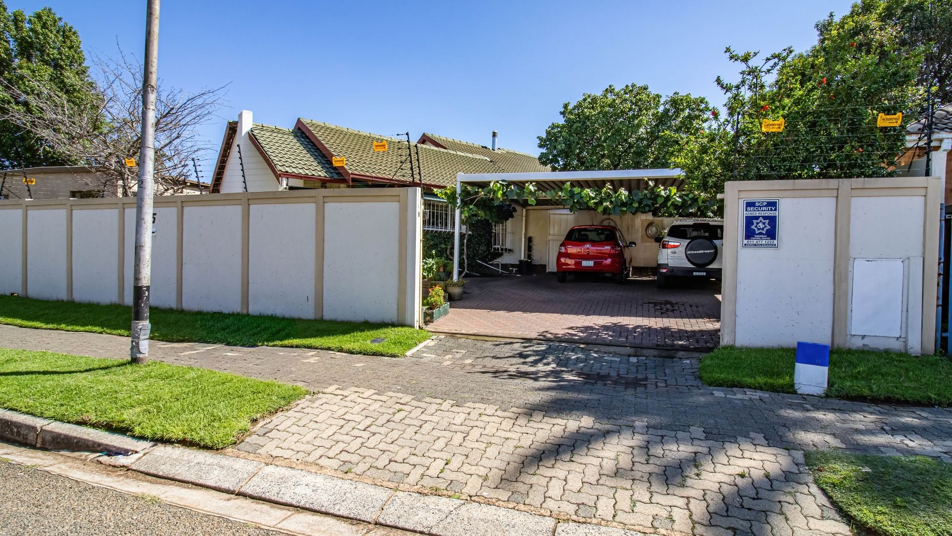 This charming 3-bedroom, 2-bathroom residence in Sophiatown, Johannesburg, offers a welcoming kerb appeal with its green tiled roof, well-maintained front garden, and paved driveway. The property boasts a carport with natural vine coverage, providing sheltered parking for three vehicles, complemented by an additional parking space, totalling three secure spots. Enhanced security features include a high perimeter wall with electric fencing and security bars on windows, ensuring peace of mind.