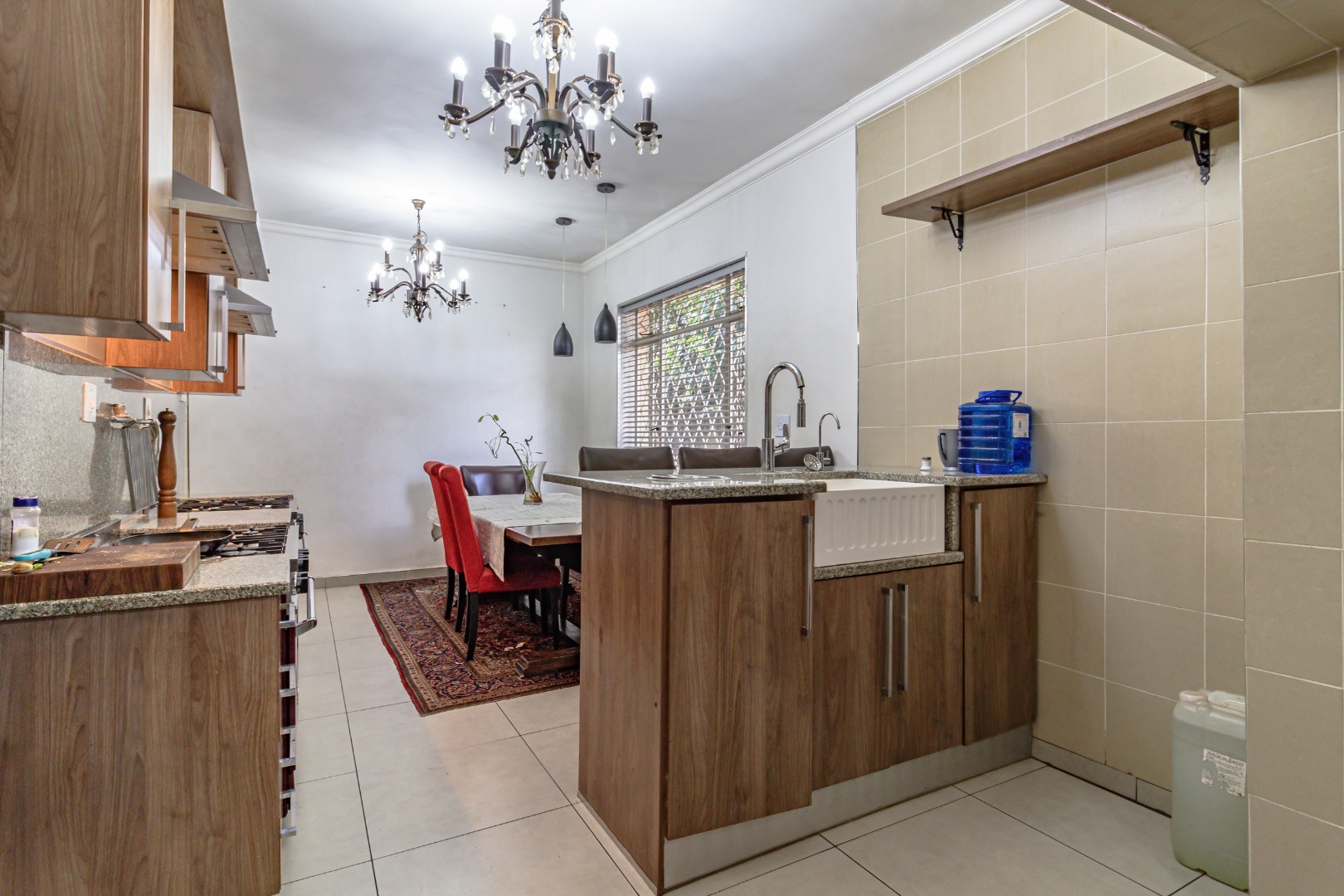 The open-plan layout seamlessly connects the dining area and kitchen, which features two 6-plate gas stoves and ample cupboard space—perfect for those who love to cook and entertain.