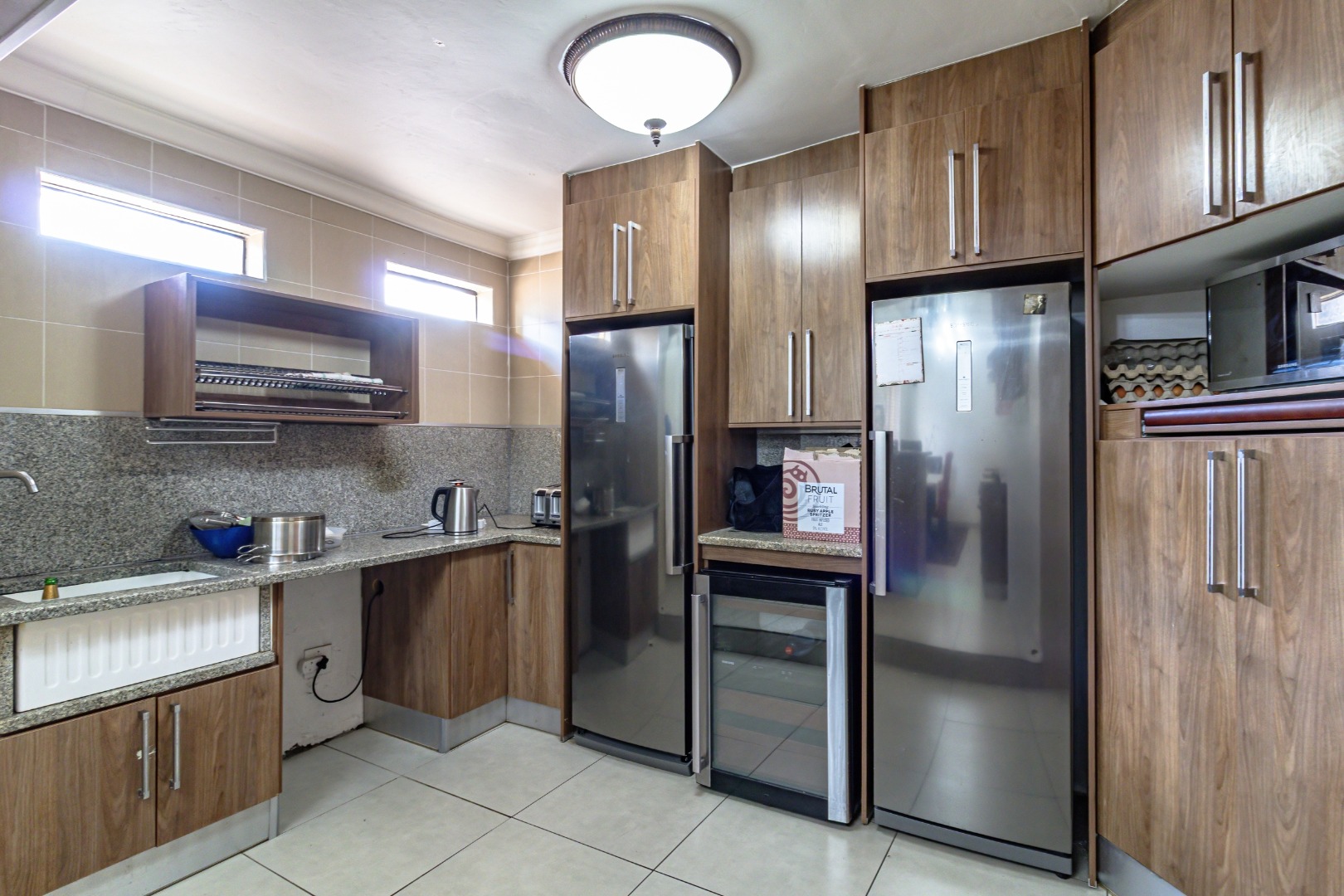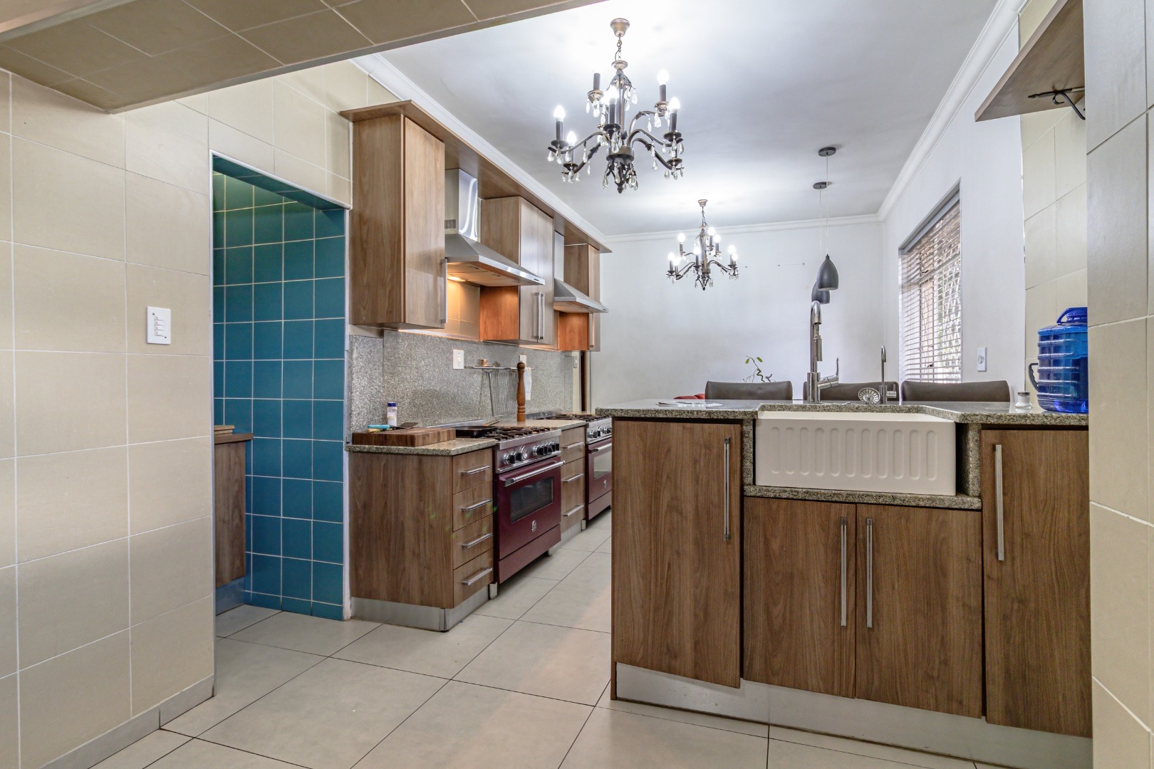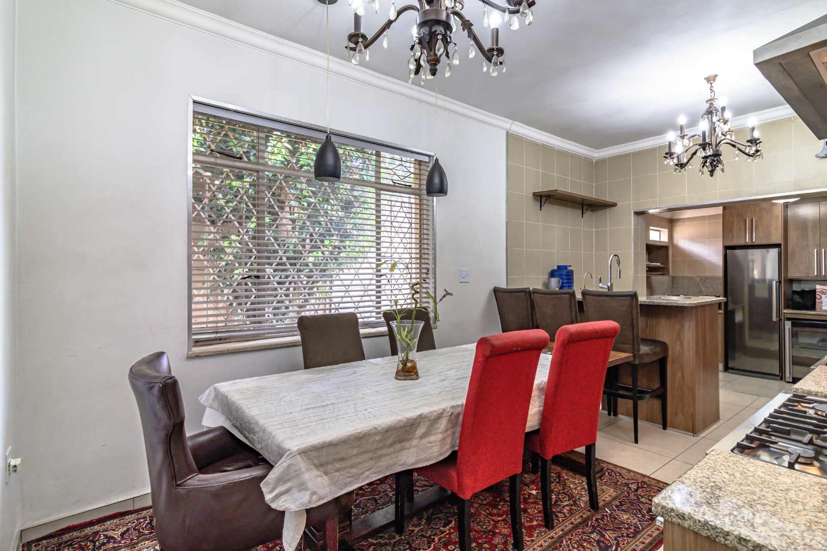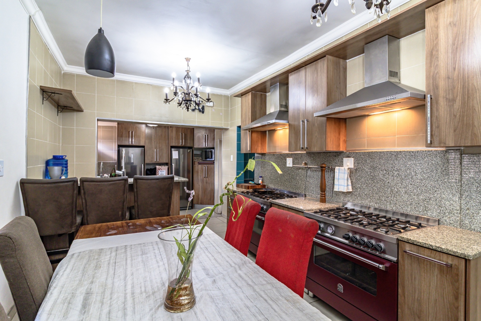 The open-plan layout seamlessly connects the dining area and kitchen, which features two 6-plate gas stoves and ample cupboard space—perfect for those who love to cook and entertain.