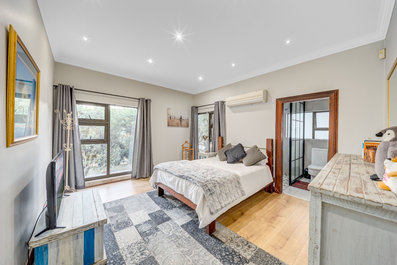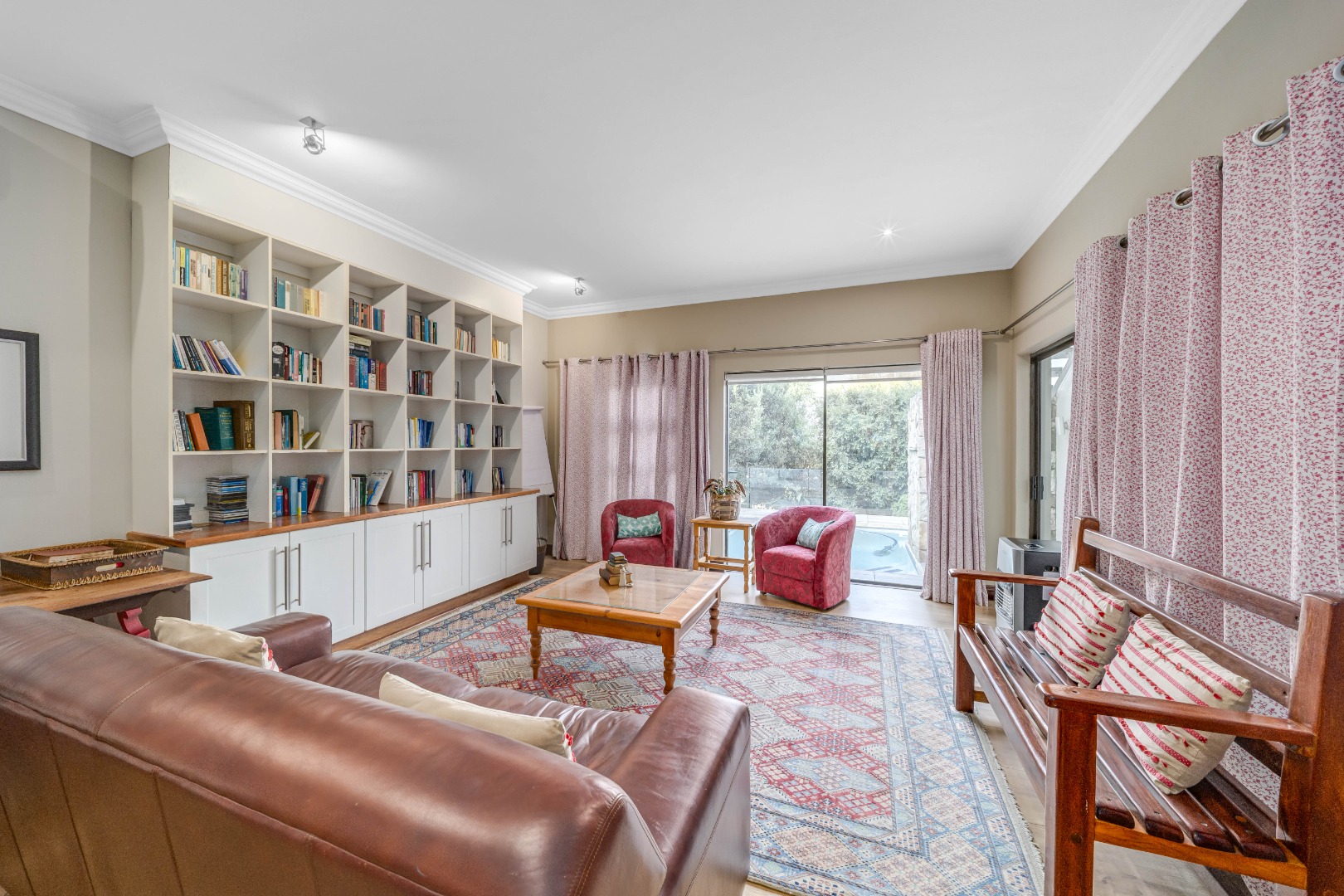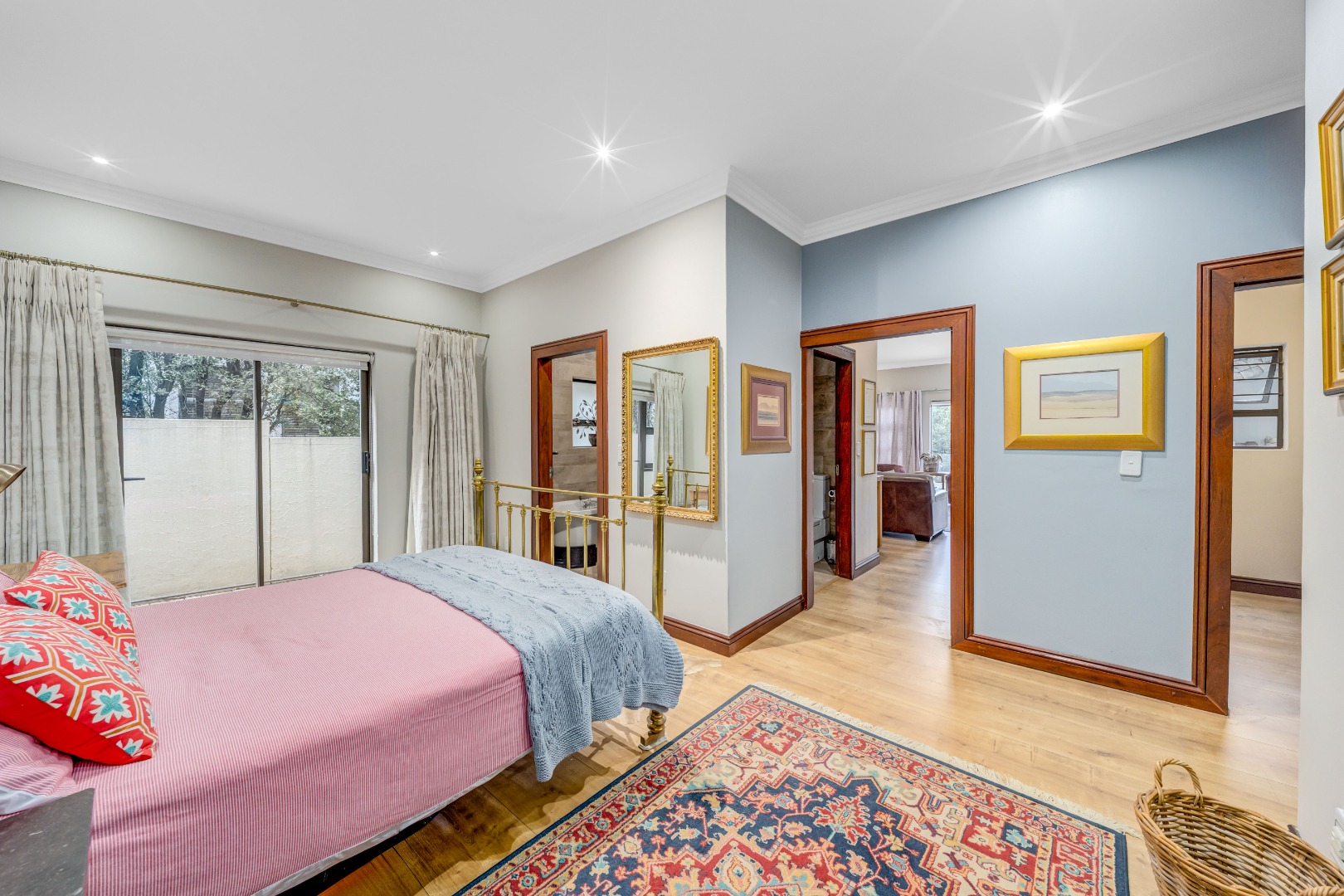 The lower level offers four spacious en-suite bedrooms arranged around a relaxed pajama lounge, flowing to a covered patio, manicured garden, and inviting swimming pool—ideal for family living or guests.