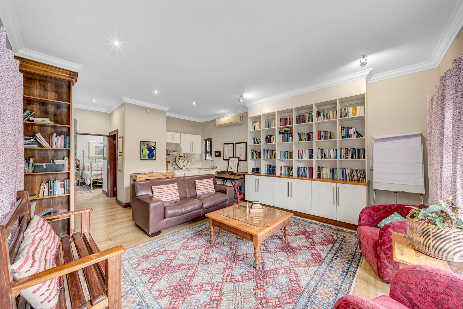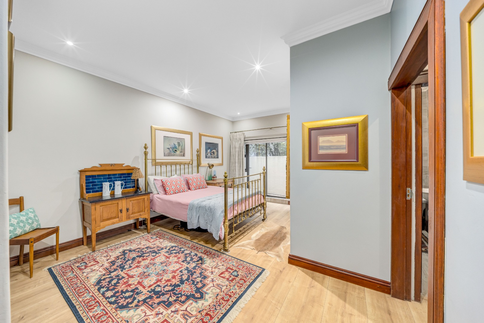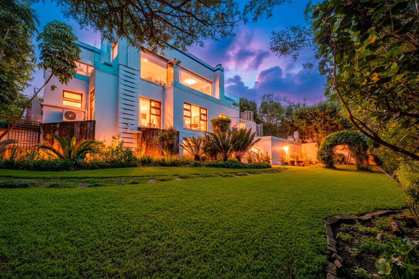 The lower level offers four spacious en-suite bedrooms arranged around a relaxed pajama lounge, flowing to a covered patio, manicured garden, and inviting swimming pool—ideal for family living or guests.