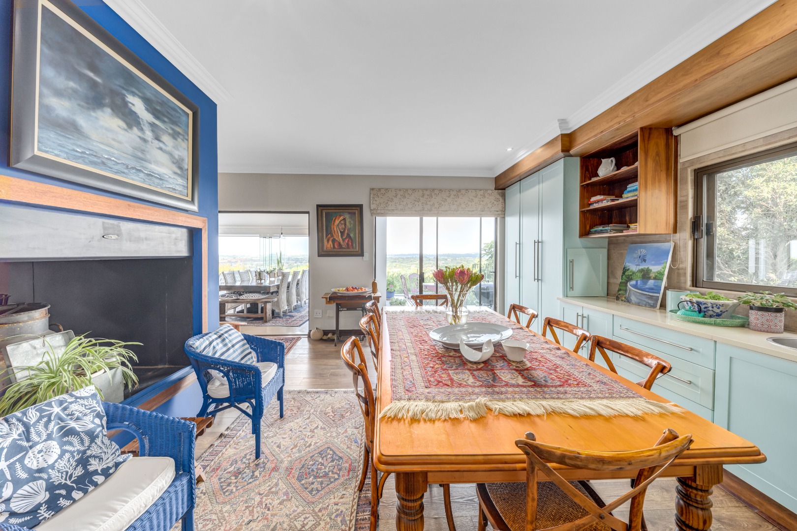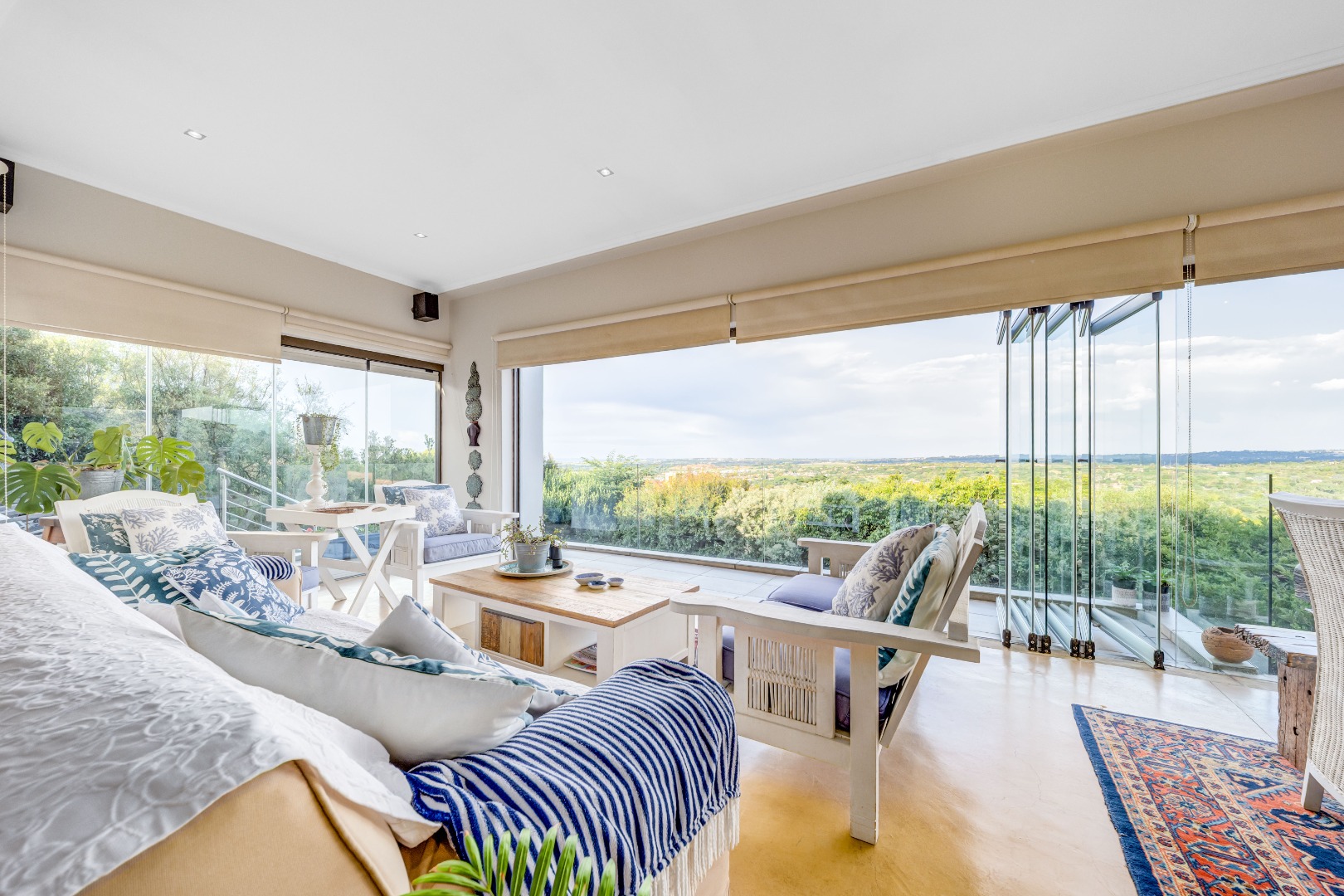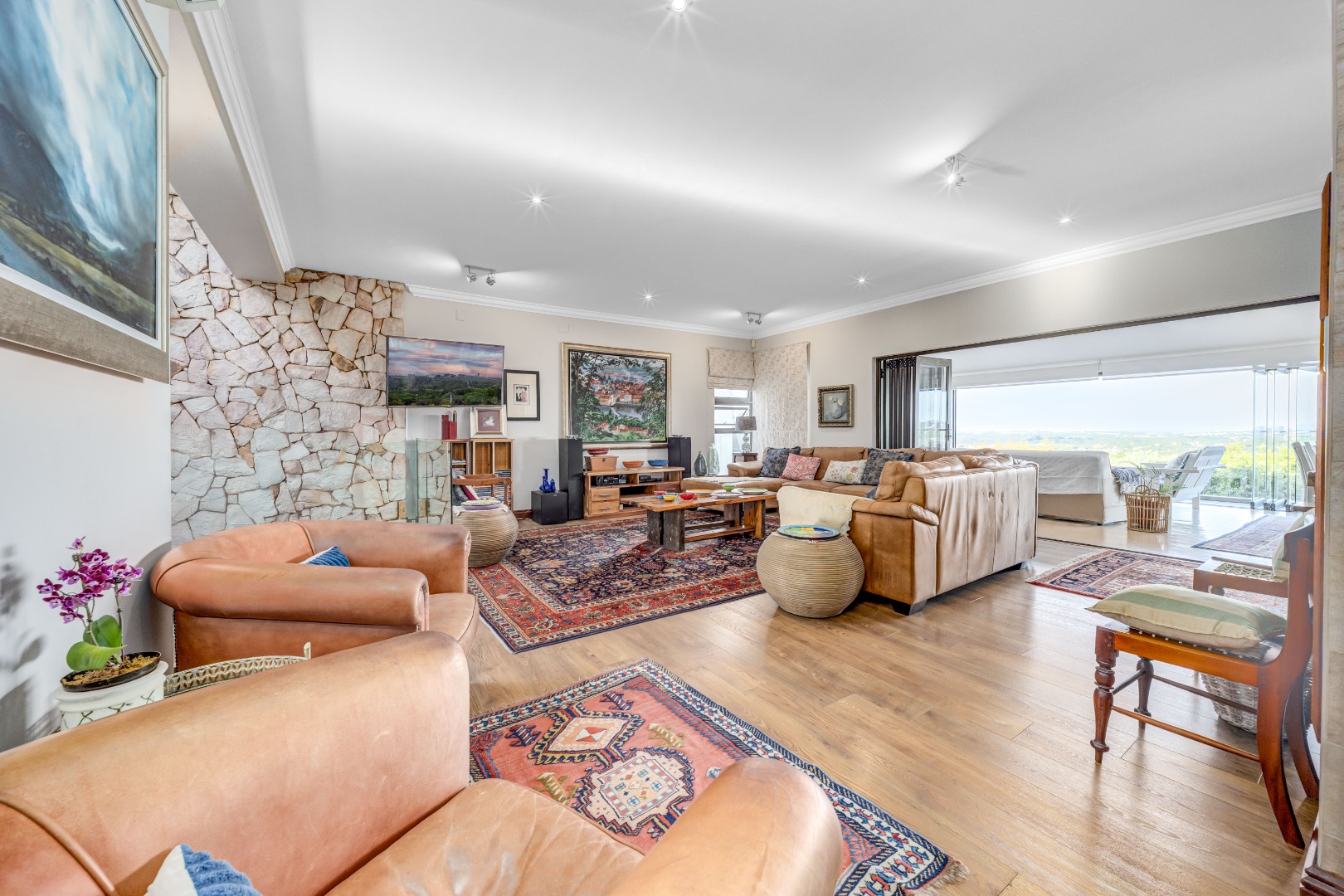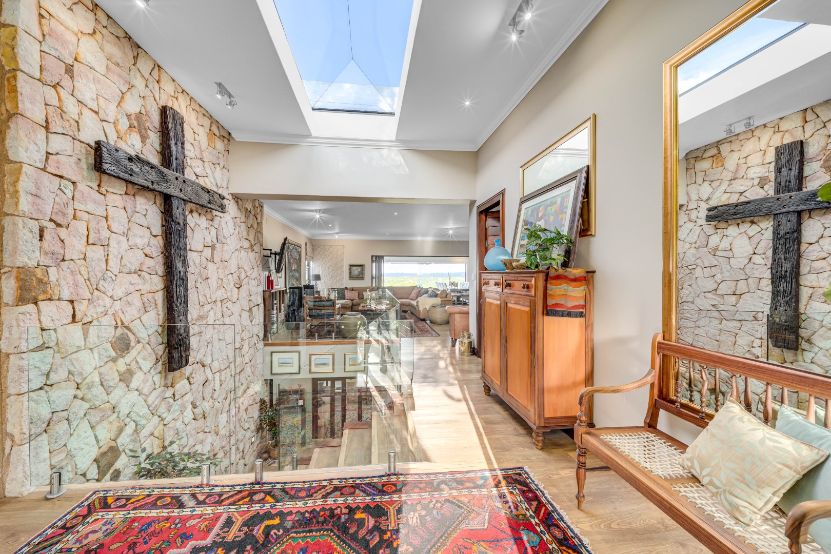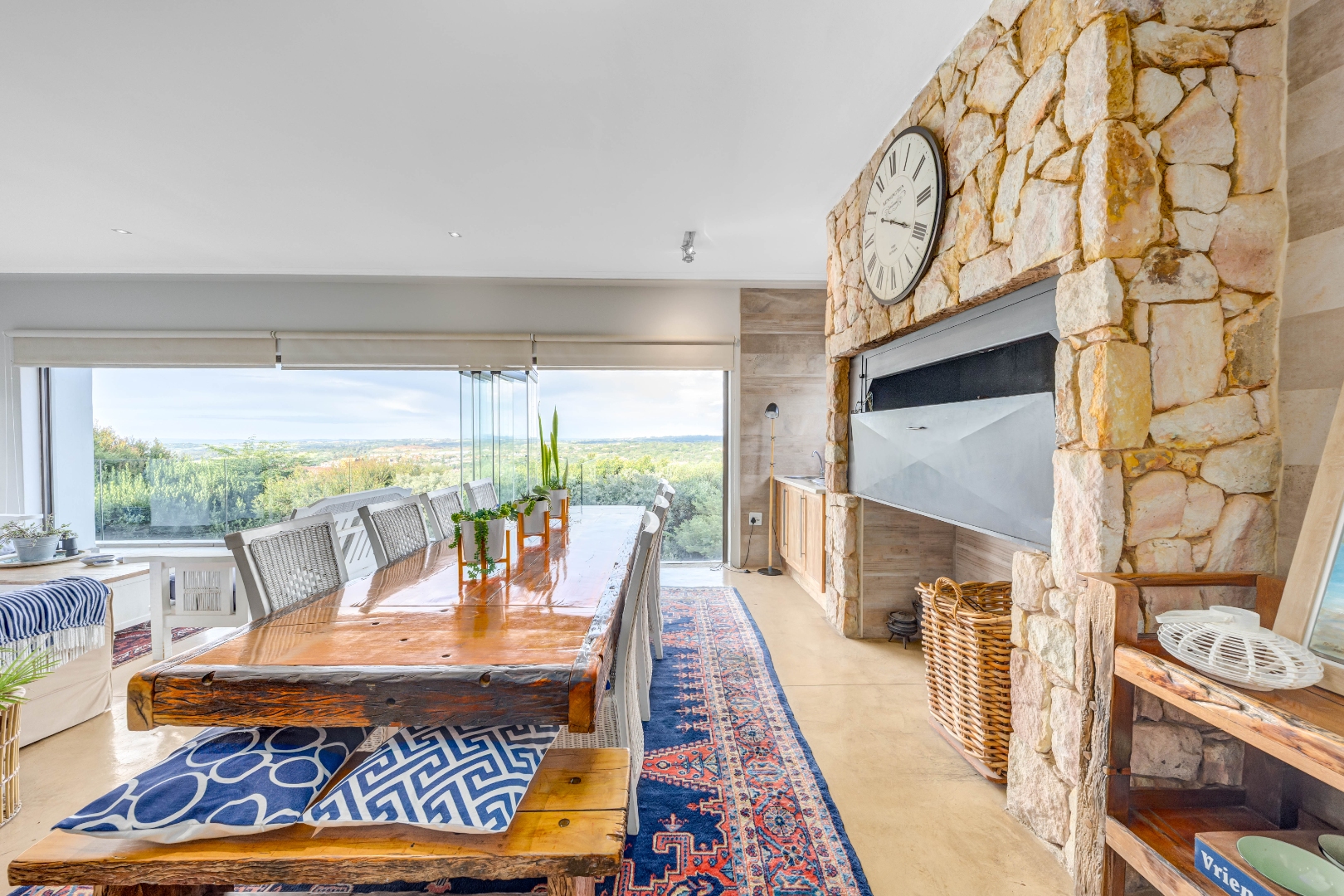 Street-level access leads into an expansive open-plan lounge, dining room, and designer kitchen, centred around a striking feature fireplace. Stacker doors open onto a large covered patio, which can be enclosed with frameless glass stack windows—creating a versatile indoor–outdoor entertainment space complete with a built-in braai and breathtaking estate views.