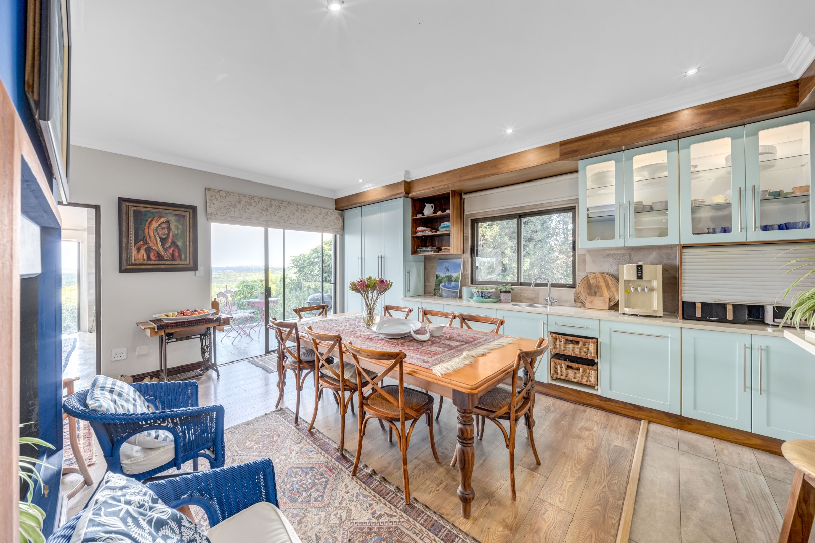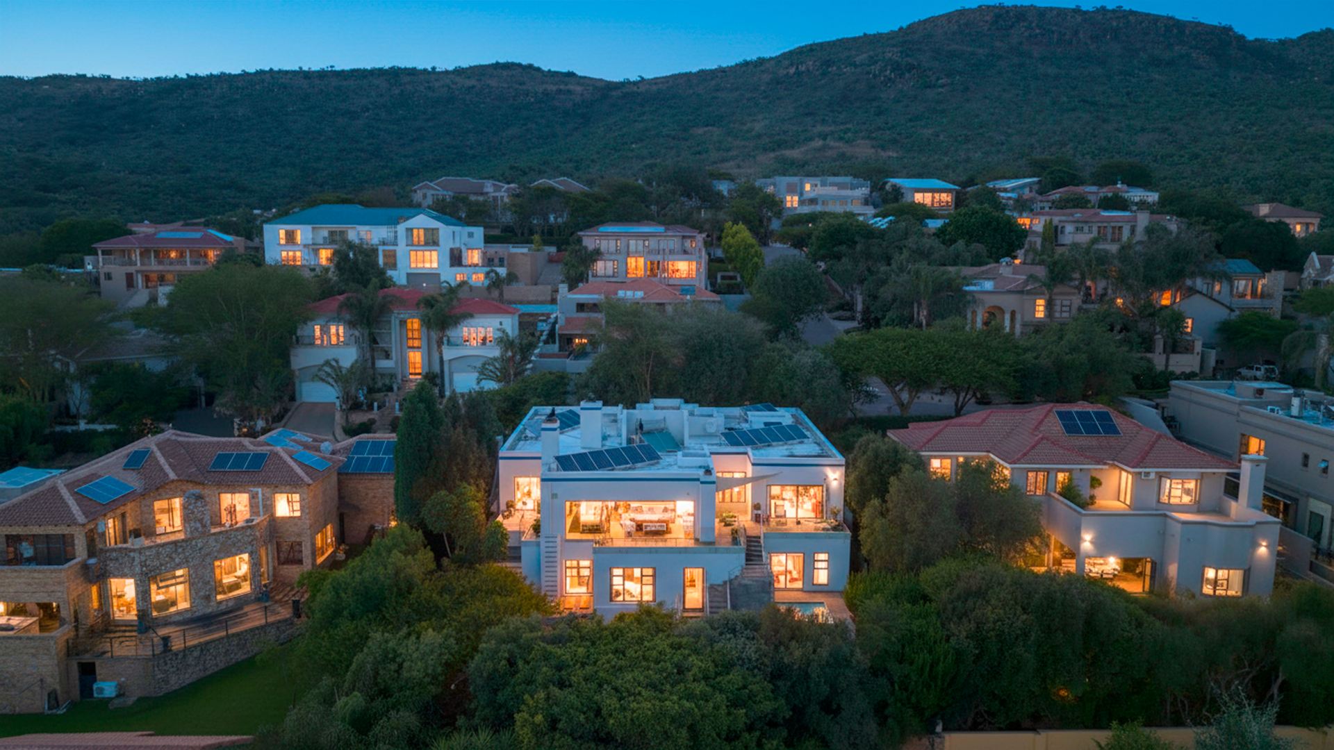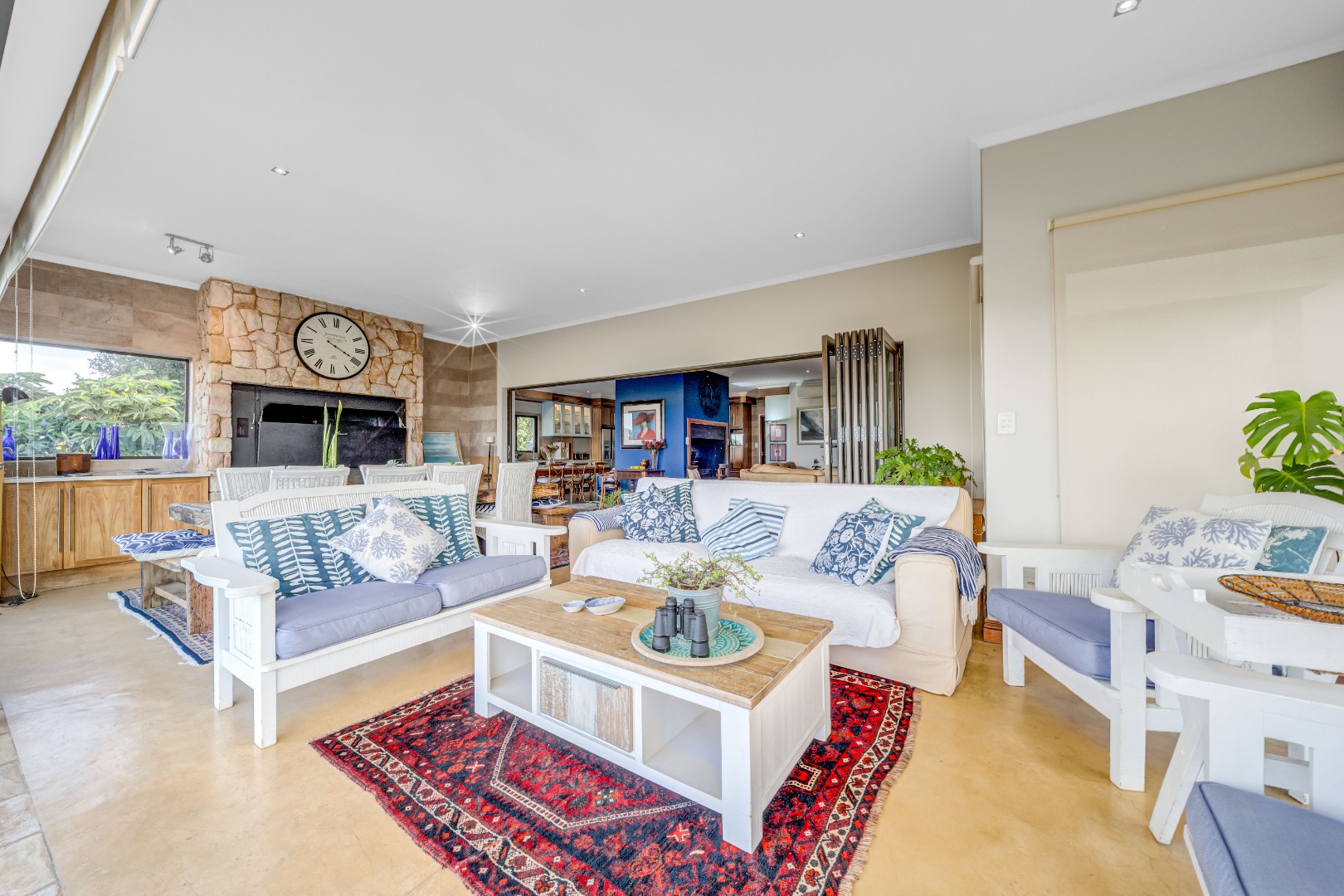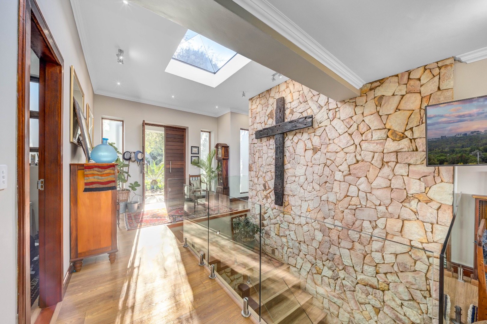 Street-level access leads into an expansive open-plan lounge, dining room, and designer kitchen, centred around a striking feature fireplace. Stacker doors open onto a large covered patio, which can be enclosed with frameless glass stack windows—creating a versatile indoor–outdoor entertainment space complete with a built-in braai and breathtaking estate views.