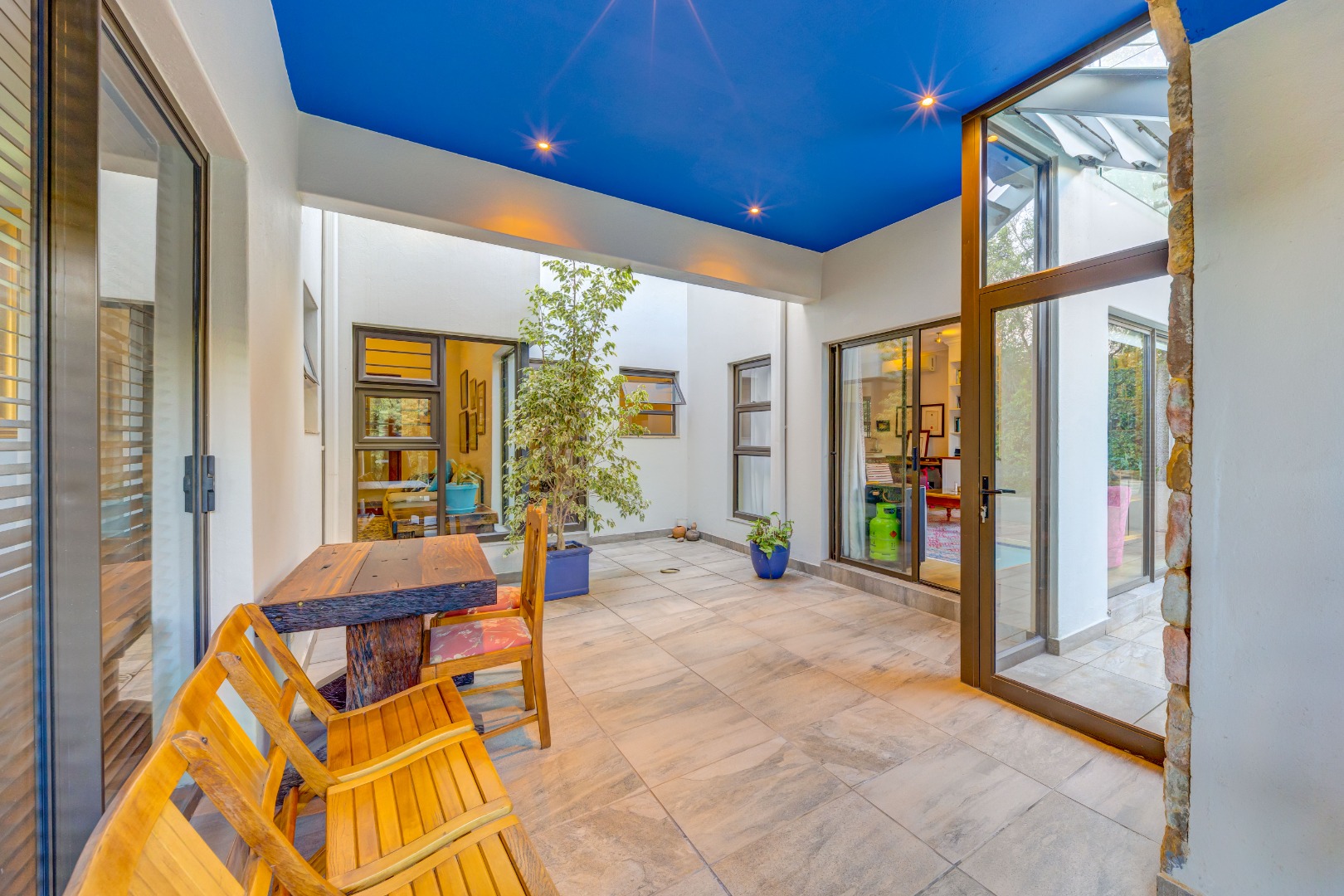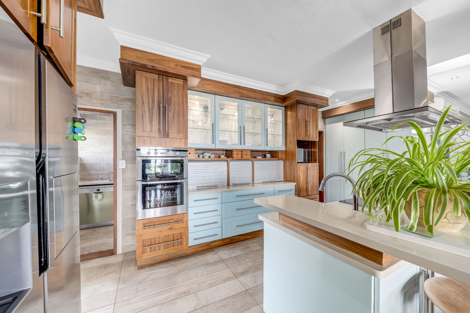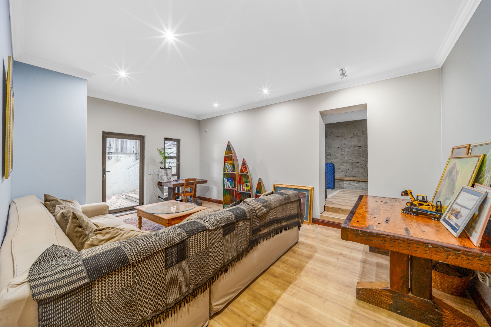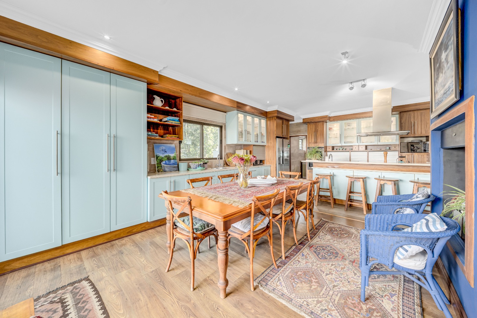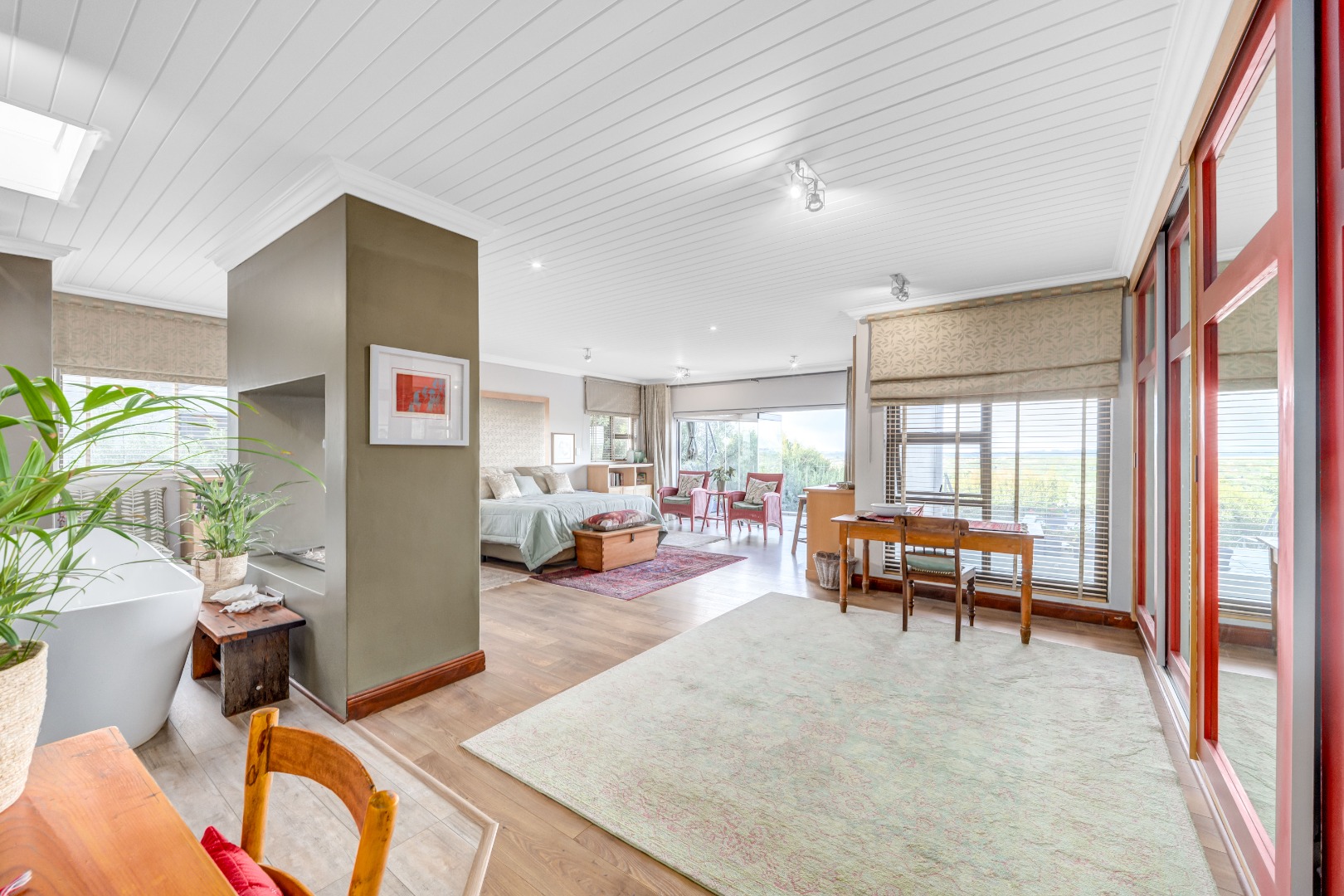 Street-level access leads into an expansive open-plan lounge, dining room, and designer kitchen, centred around a striking feature fireplace. Stacker doors open onto a large covered patio, which can be enclosed with frameless glass stack windows—creating a versatile indoor–outdoor entertainment space complete with a built-in braai and breathtaking estate views.