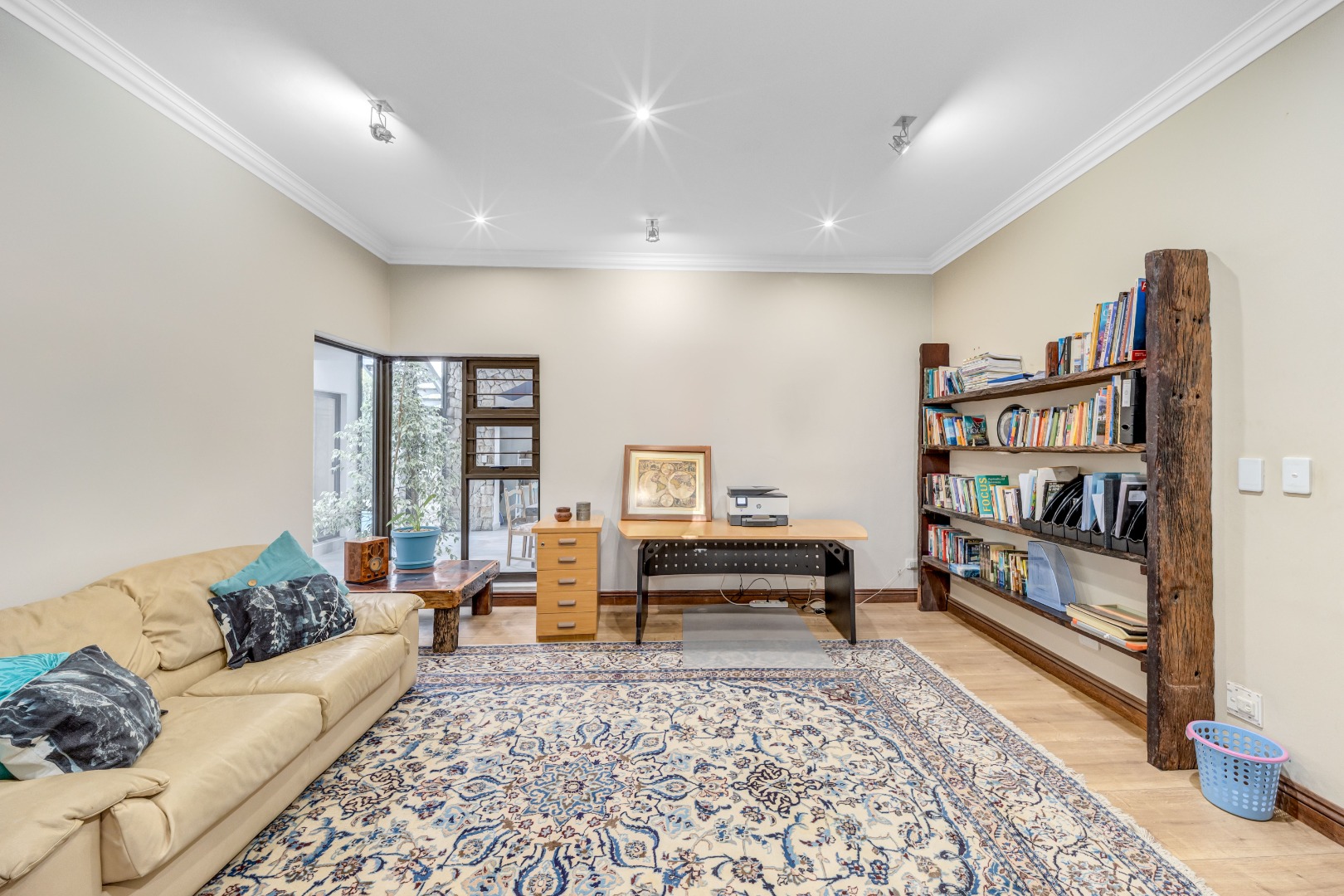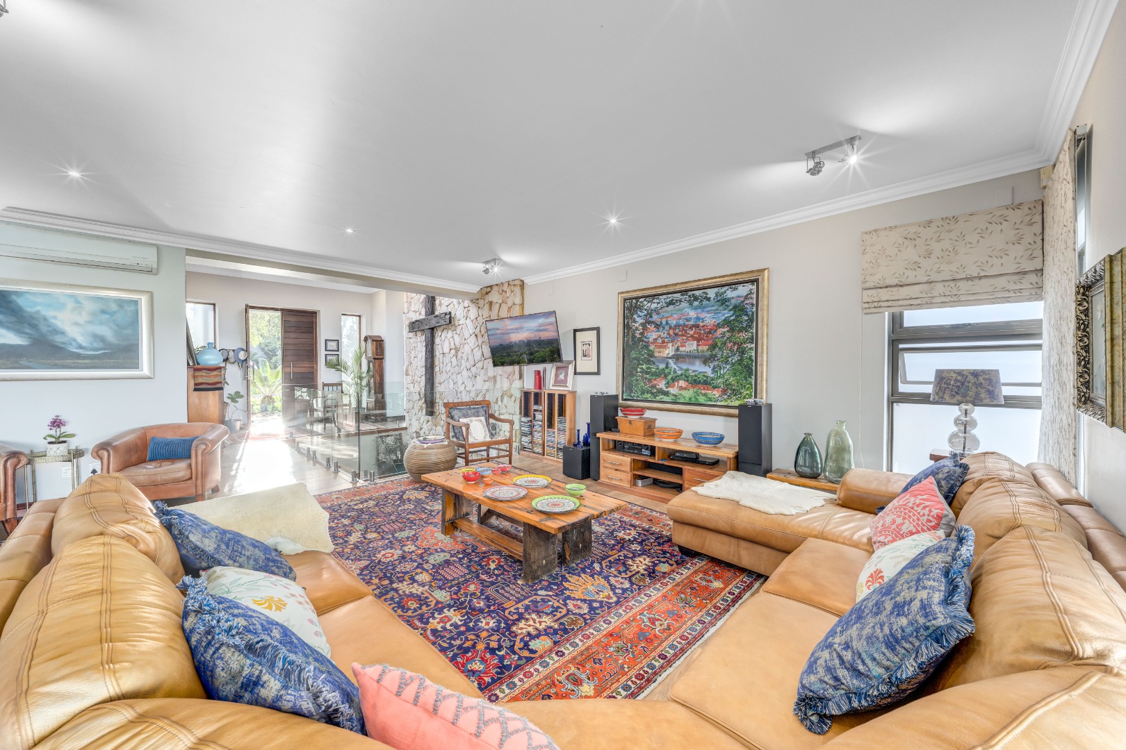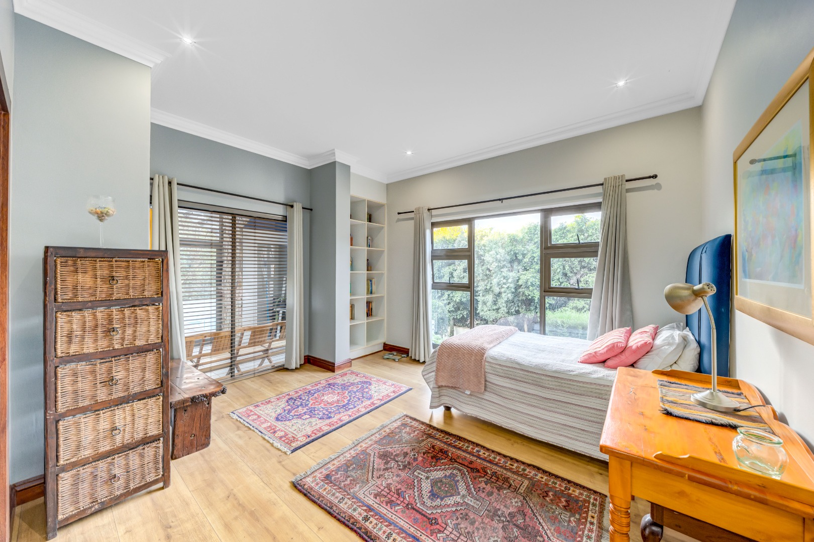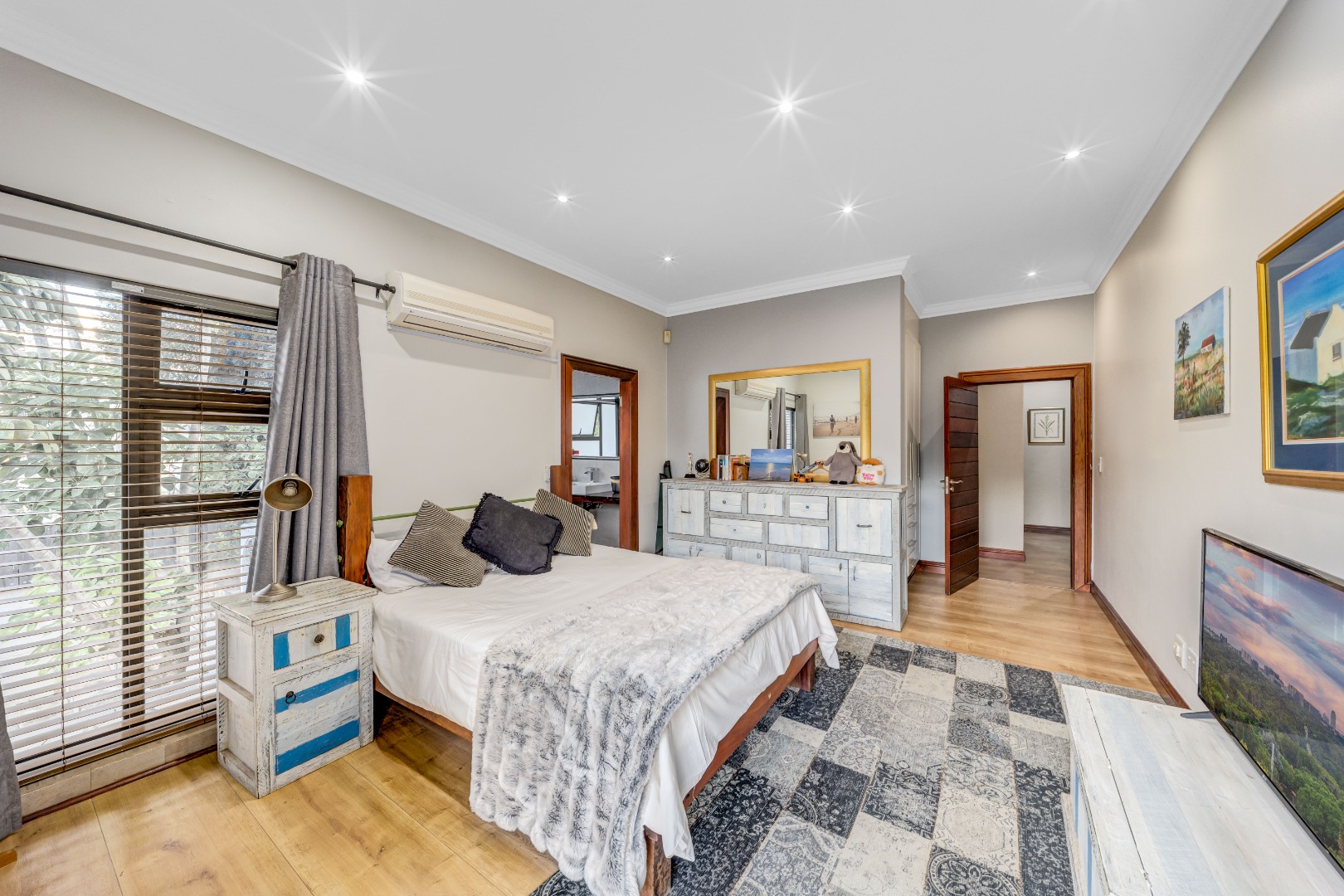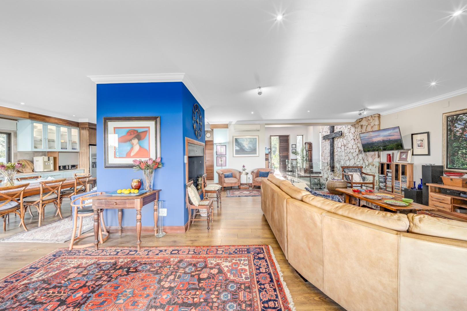 The lower level offers four spacious en-suite bedrooms arranged around a relaxed pajama lounge, flowing to a covered patio, manicured garden, and inviting swimming pool—ideal for family living or guests.