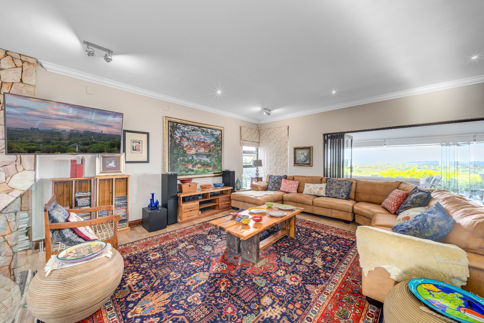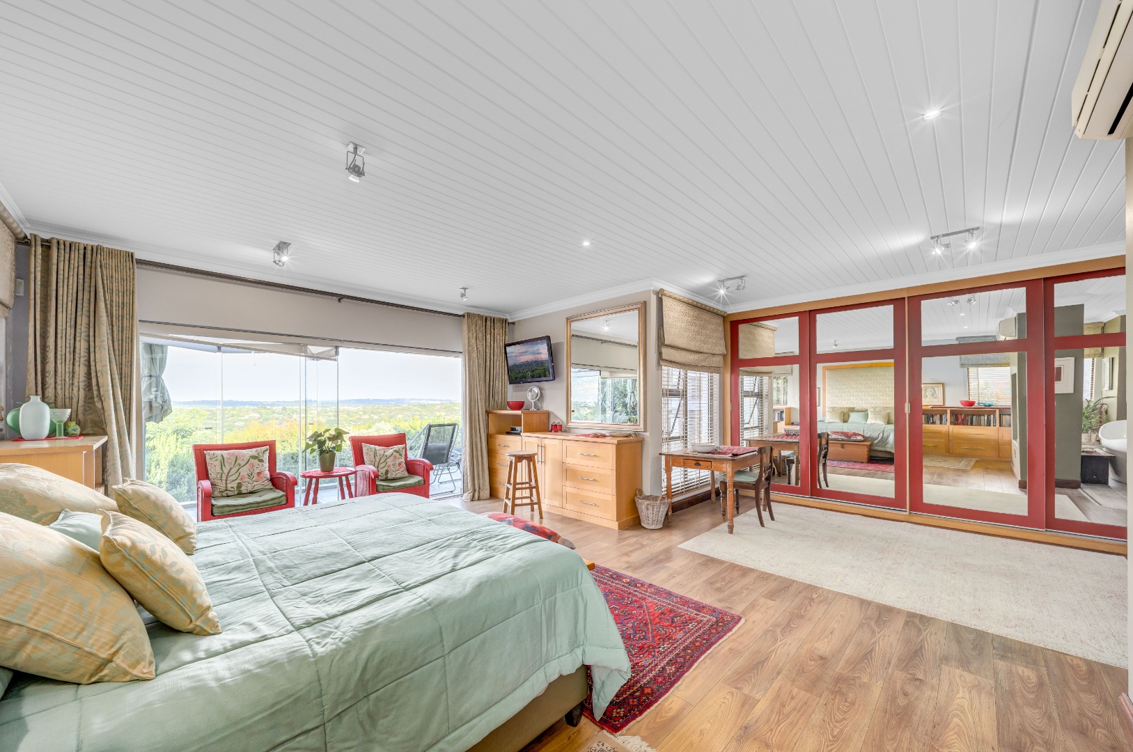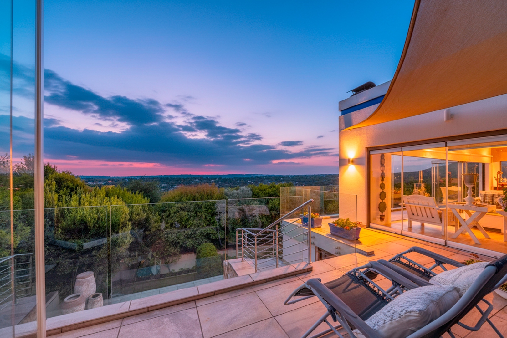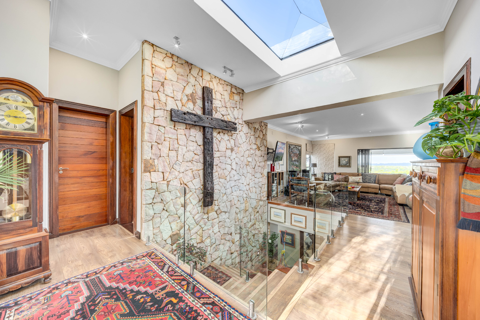 Street-level access leads into an expansive open-plan lounge, dining room, and designer kitchen, centred around a striking feature fireplace. Stacker doors open onto a large covered patio, which can be enclosed with frameless glass stack windows—creating a versatile indoor–outdoor entertainment space complete with a built-in braai and breathtaking estate views.