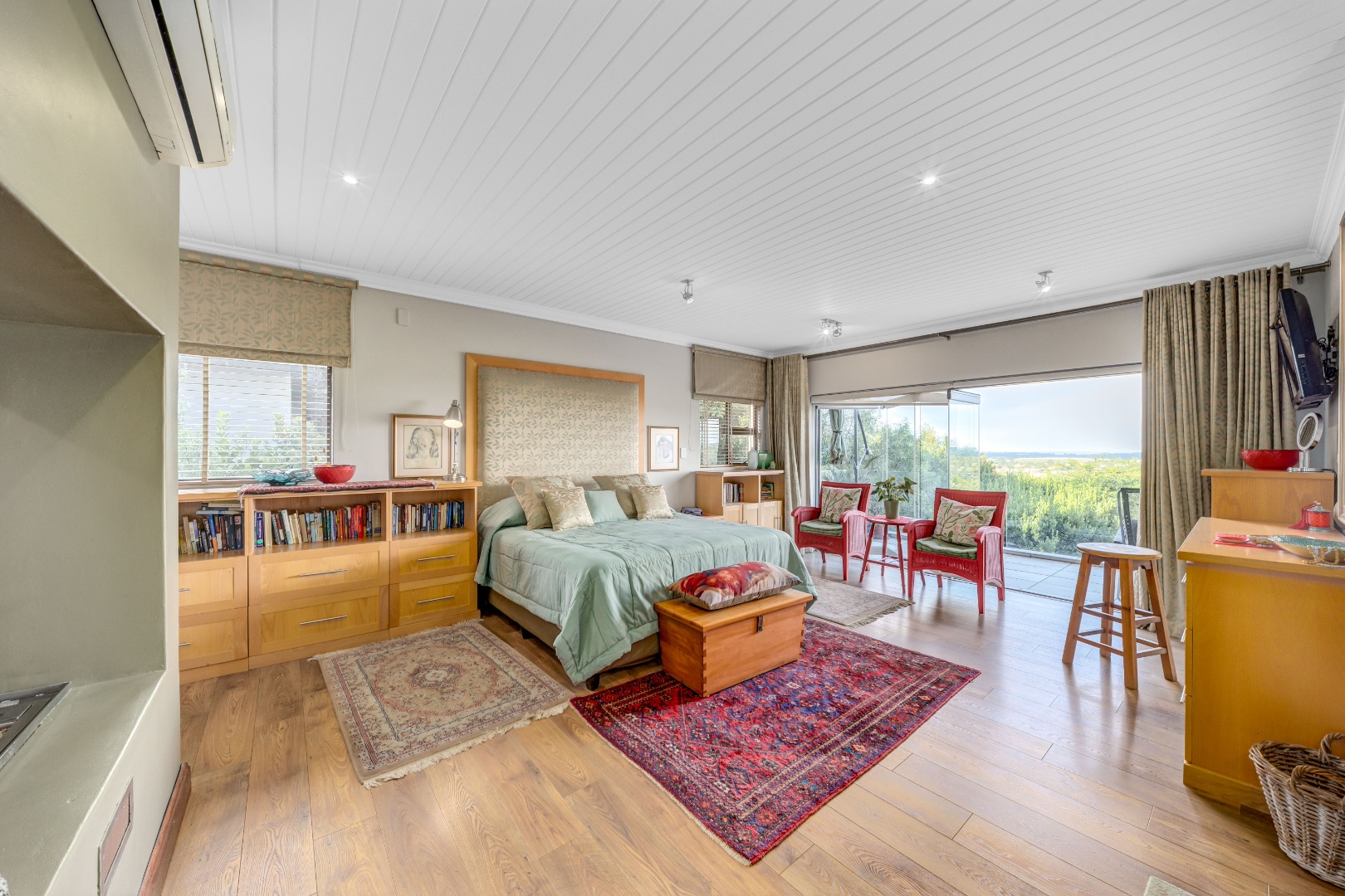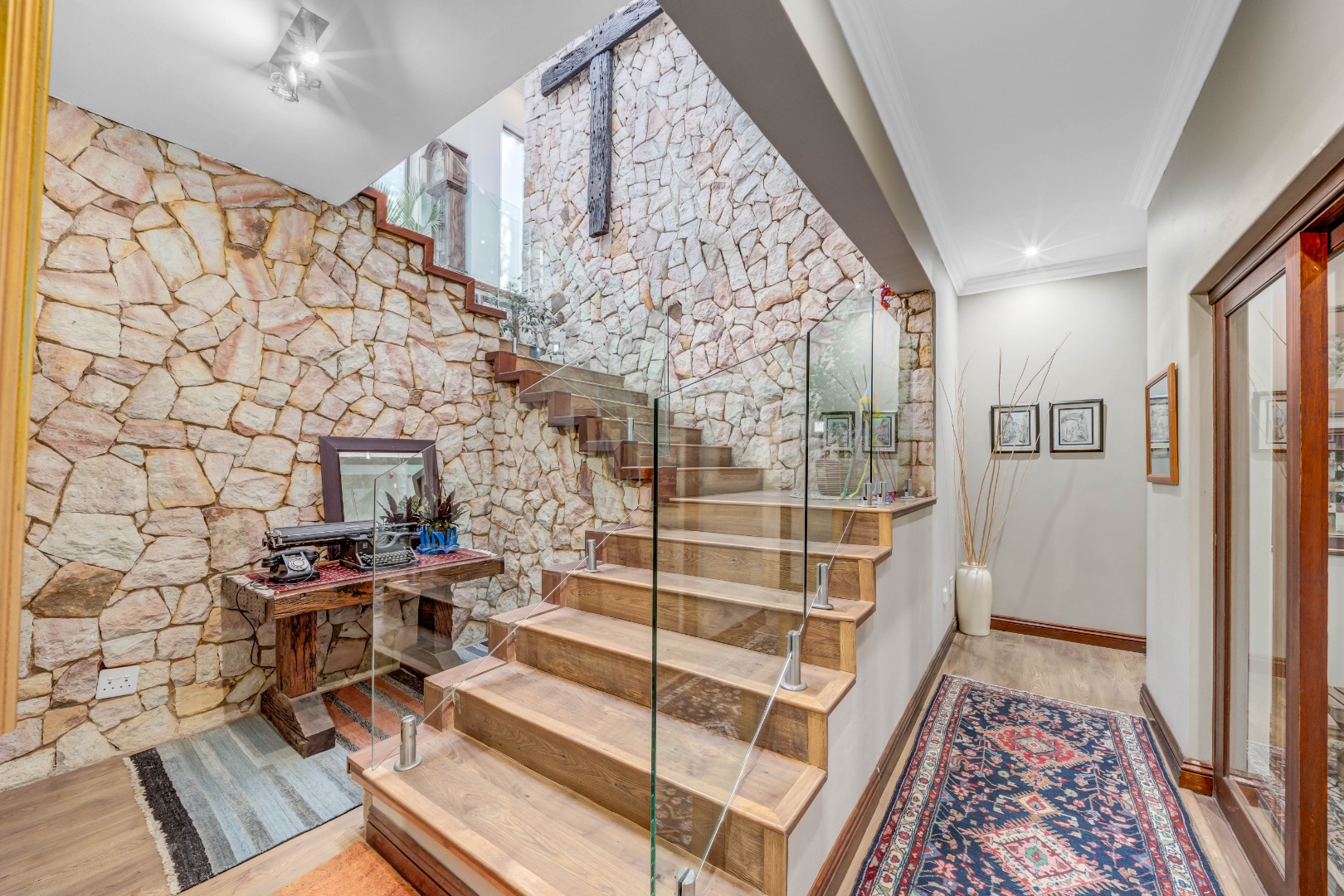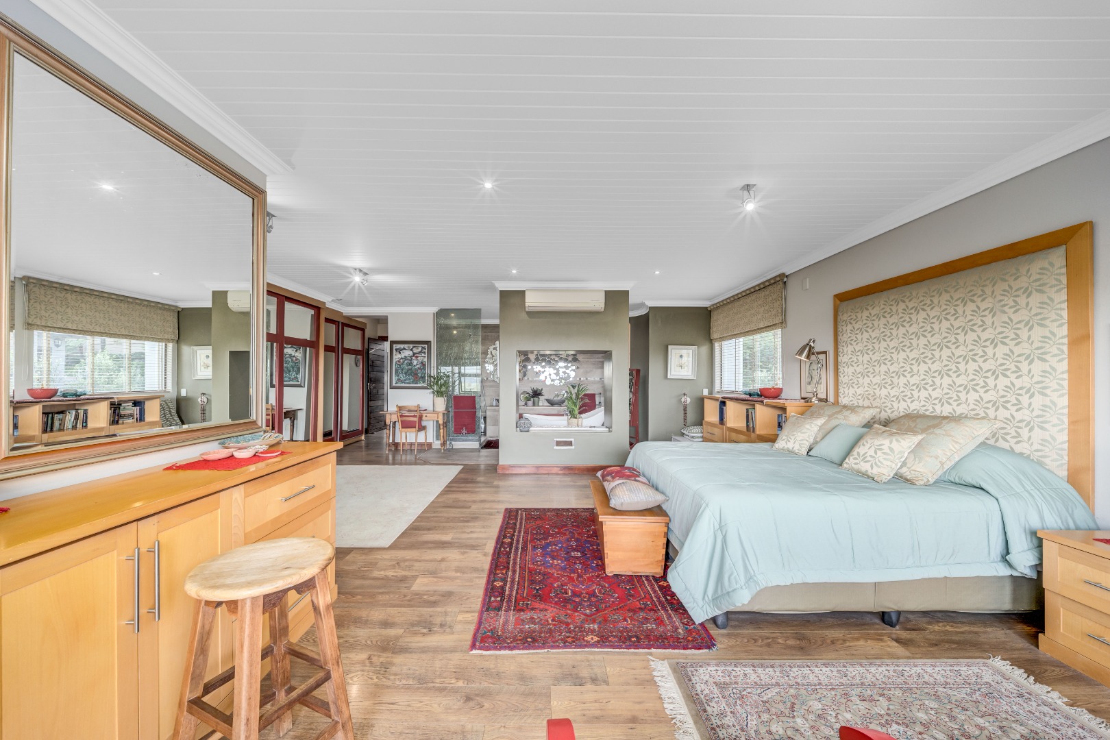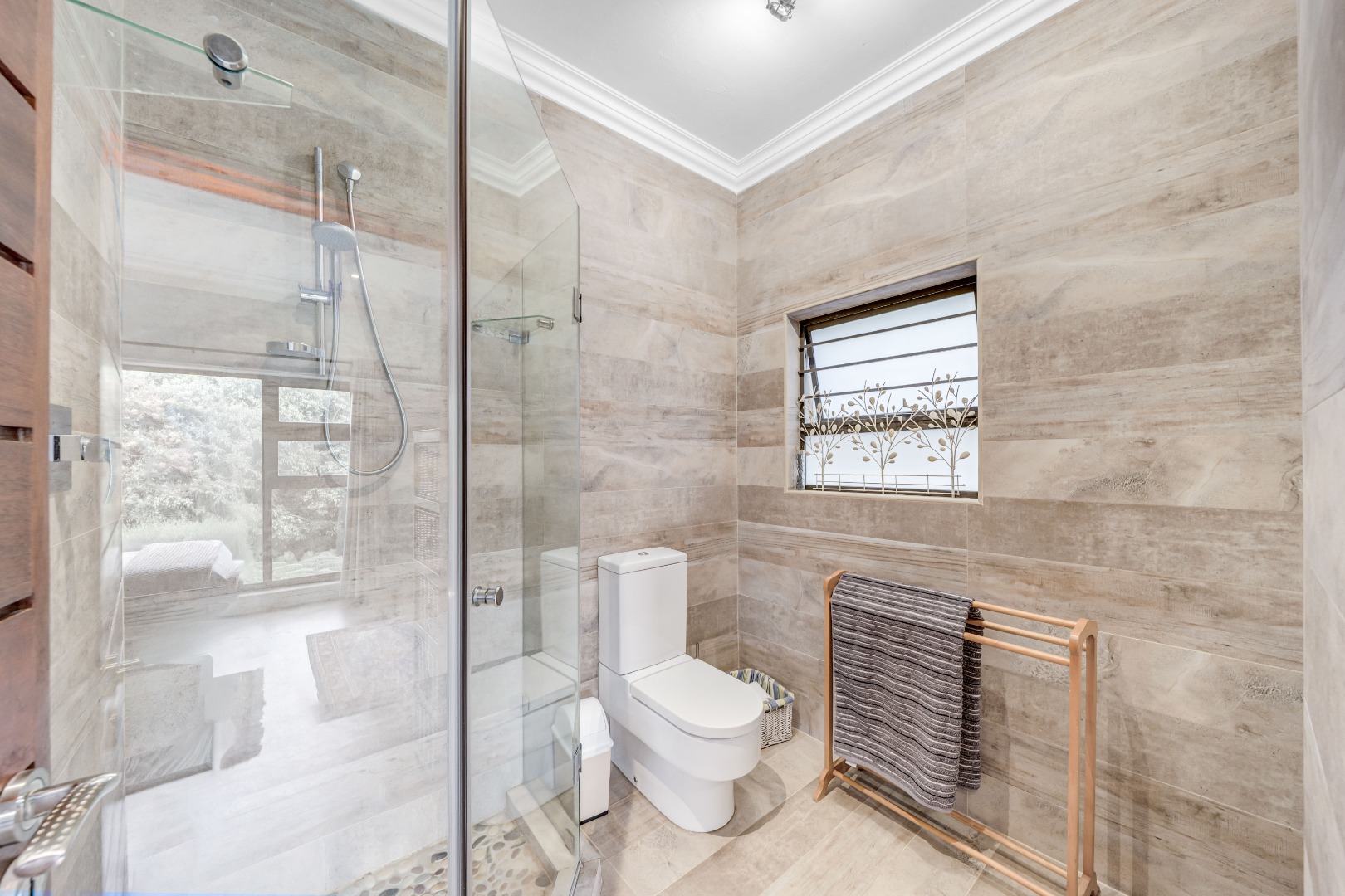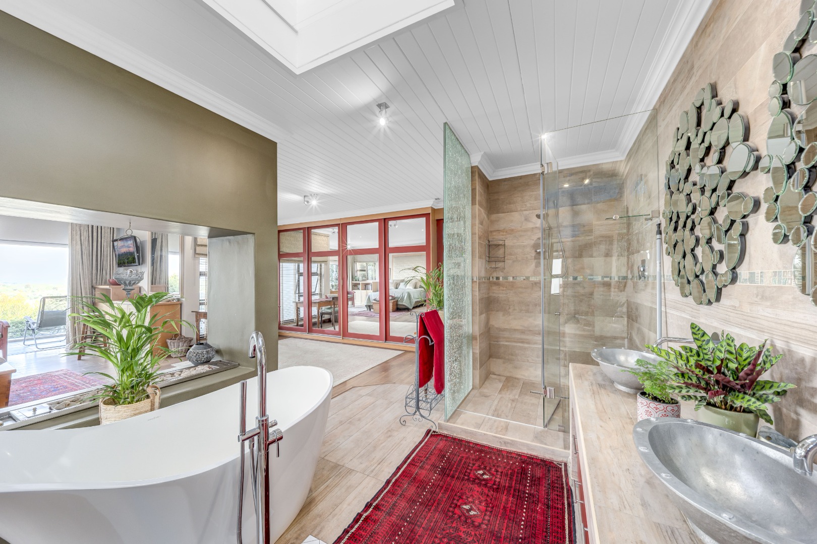 Street-level access leads into an expansive open-plan lounge, dining room, and designer kitchen, centred around a striking feature fireplace. Stacker doors open onto a large covered patio, which can be enclosed with frameless glass stack windows—creating a versatile indoor–outdoor entertainment space complete with a built-in braai and breathtaking estate views.