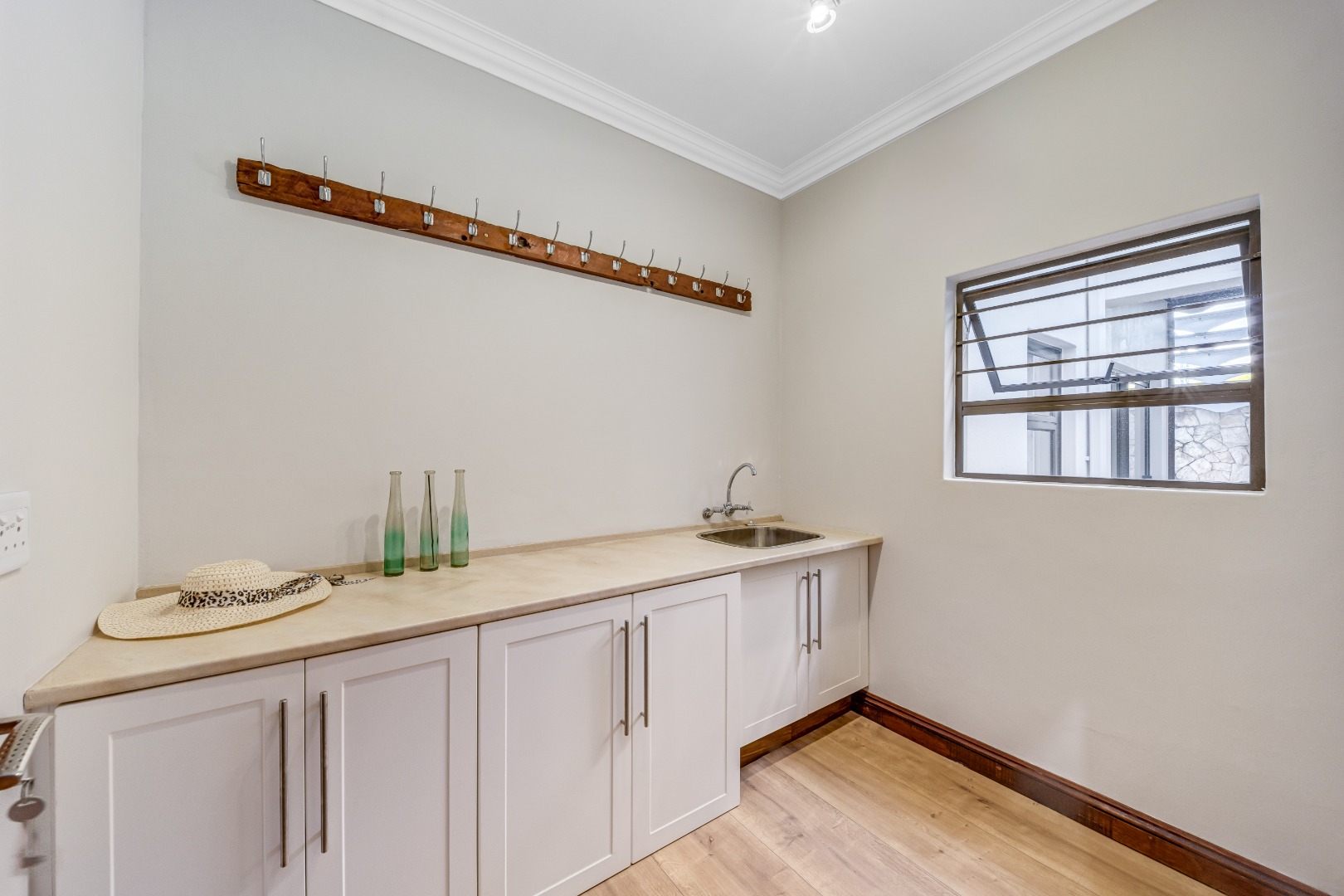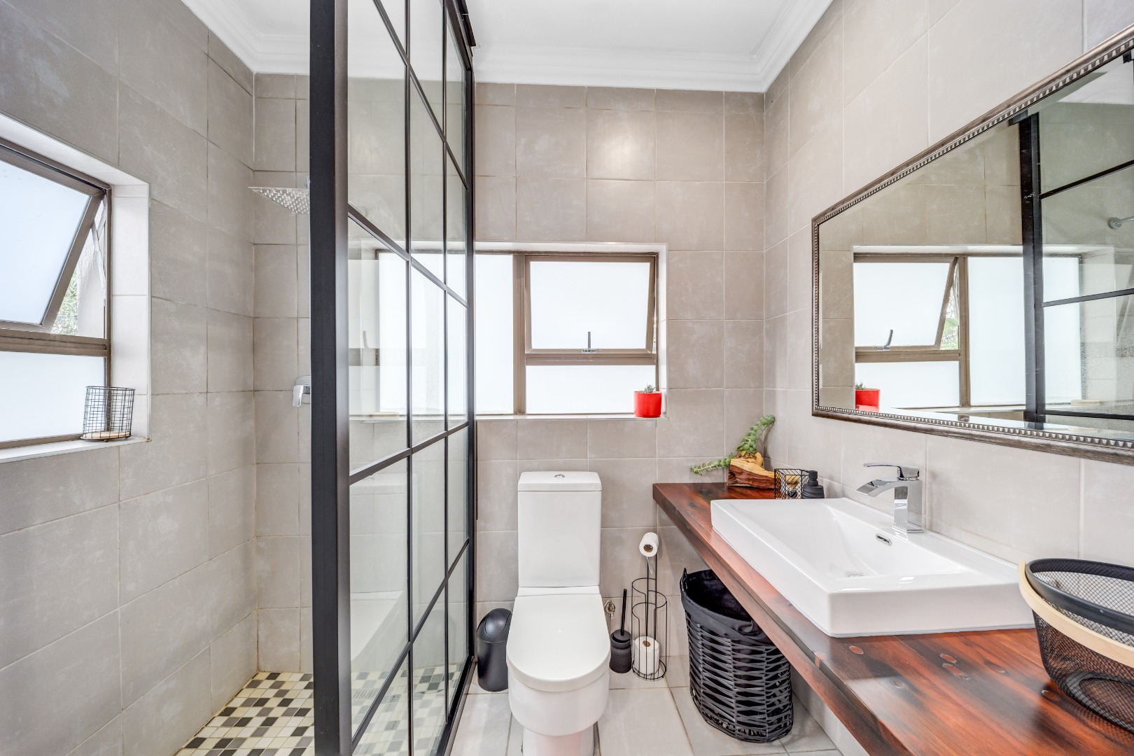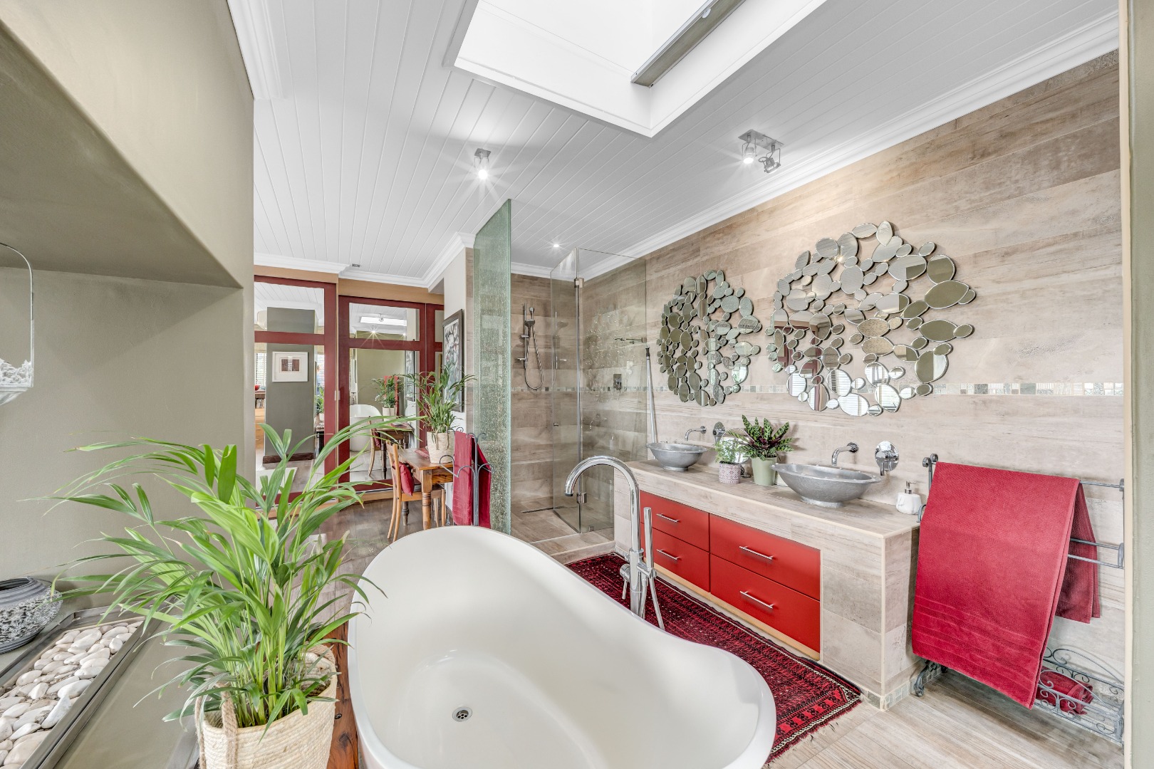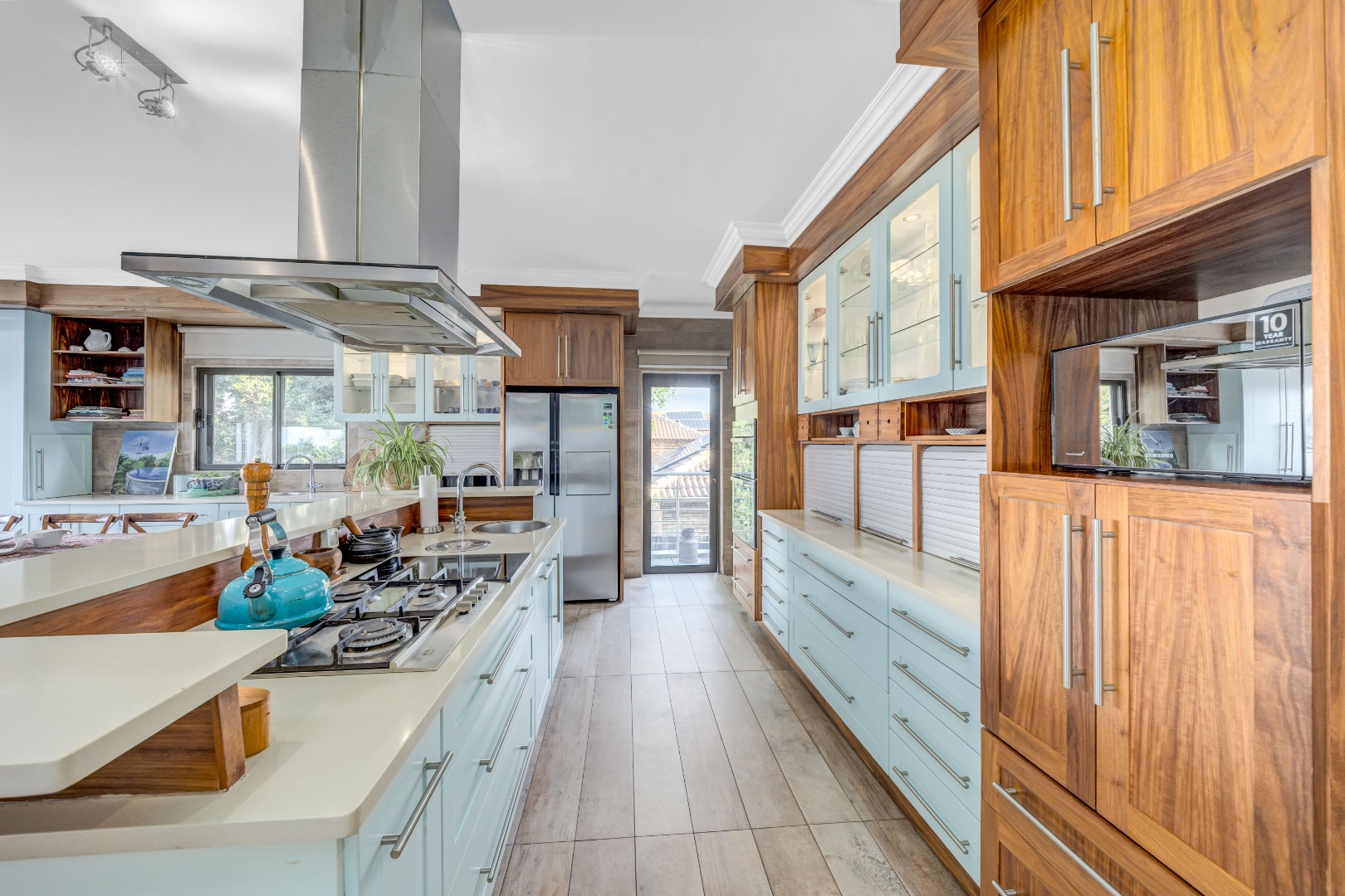 Street-level access leads into an expansive open-plan lounge, dining room, and designer kitchen, centred around a striking feature fireplace. Stacker doors open onto a large covered patio, which can be enclosed with frameless glass stack windows—creating a versatile indoor–outdoor entertainment space complete with a built-in braai and breathtaking estate views.