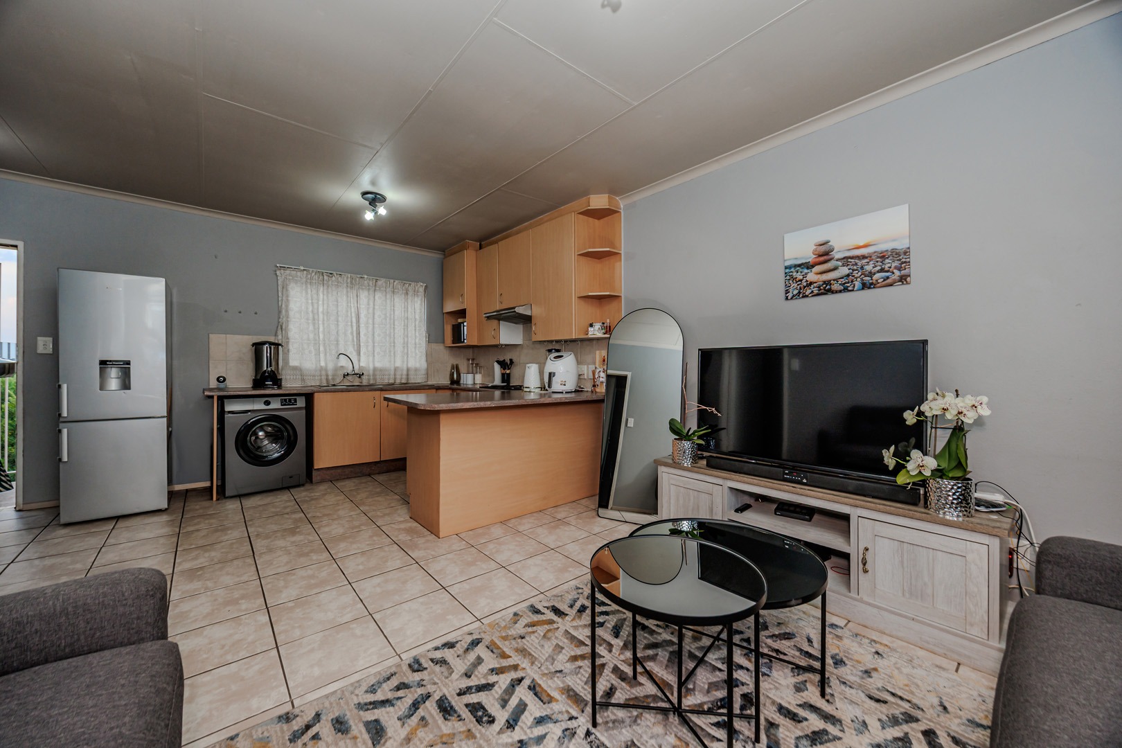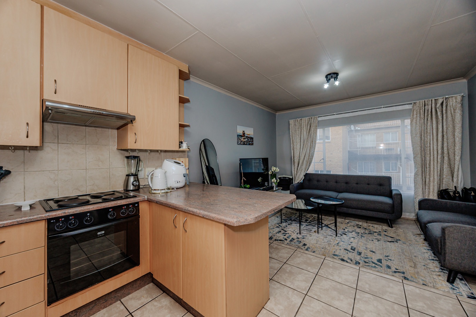 The open-plan living area seamlessly integrates a modern kitchen, featuring elegant light wood cabinetry, integrated appliances, and a practical breakfast bar, all set against durable tiled flooring. A serene bedroom offers a tranquil retreat, complete with a contemporary upholstered headboard and bespoke built-in wardrobes, complemented by plush carpeting.