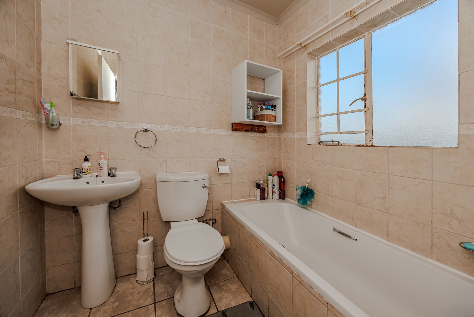 The pristine bathroom boasts full tiling and a relaxing bathtub, ensuring comfort and style.