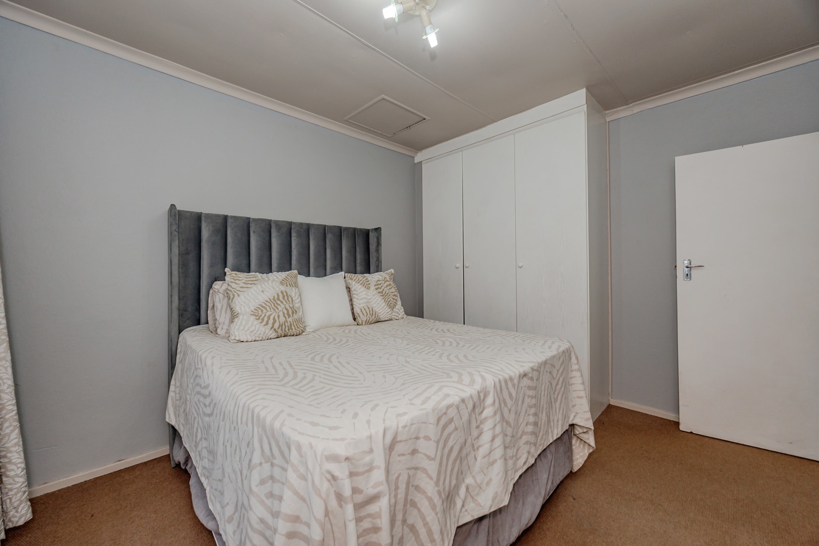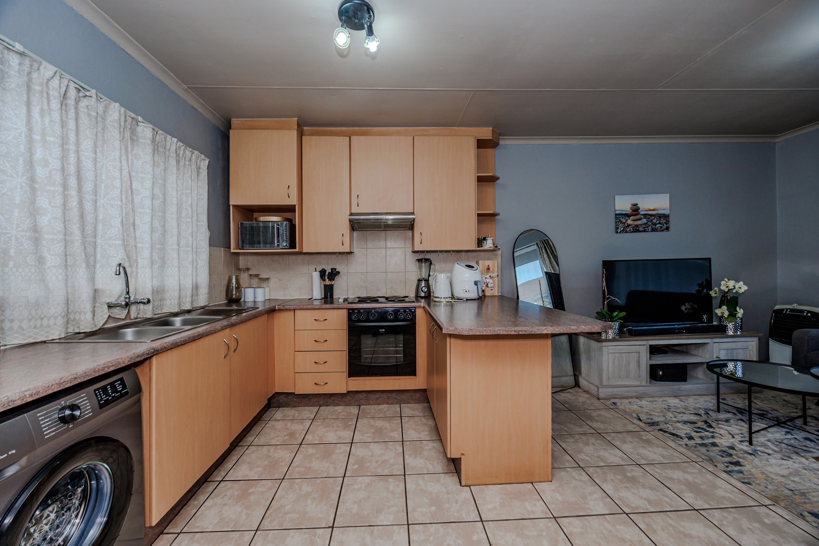 The open-plan living area seamlessly integrates a modern kitchen, featuring elegant light wood cabinetry, integrated appliances, and a practical breakfast bar, all set against durable tiled flooring. A serene bedroom offers a tranquil retreat, complete with a contemporary upholstered headboard and bespoke built-in wardrobes, complemented by plush carpeting.