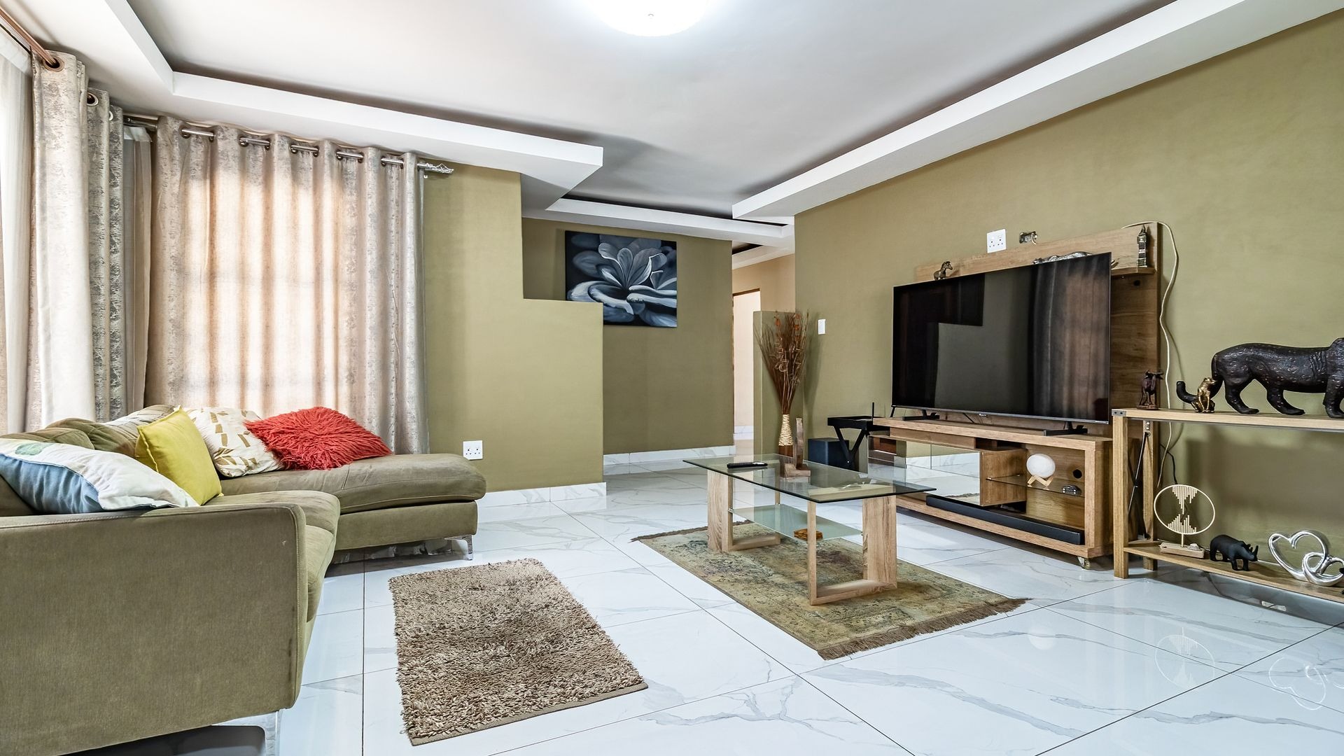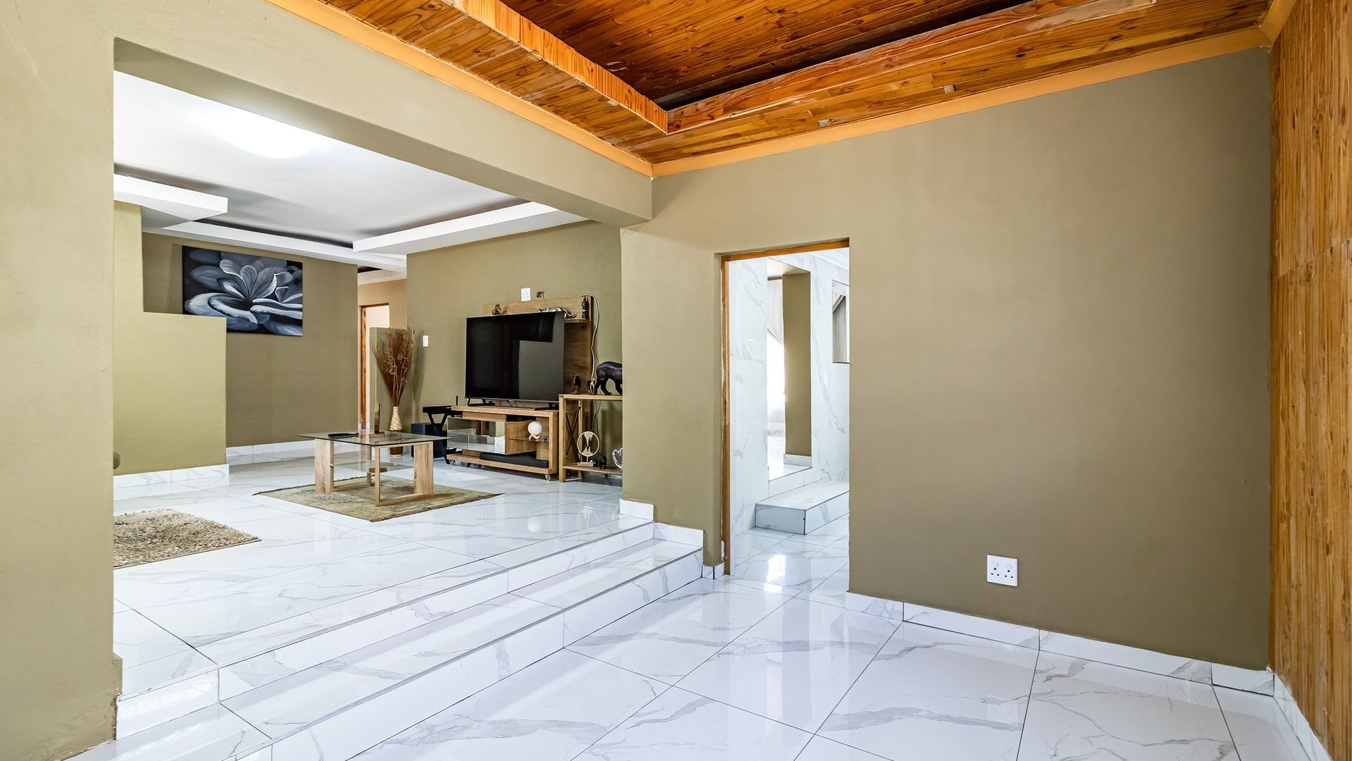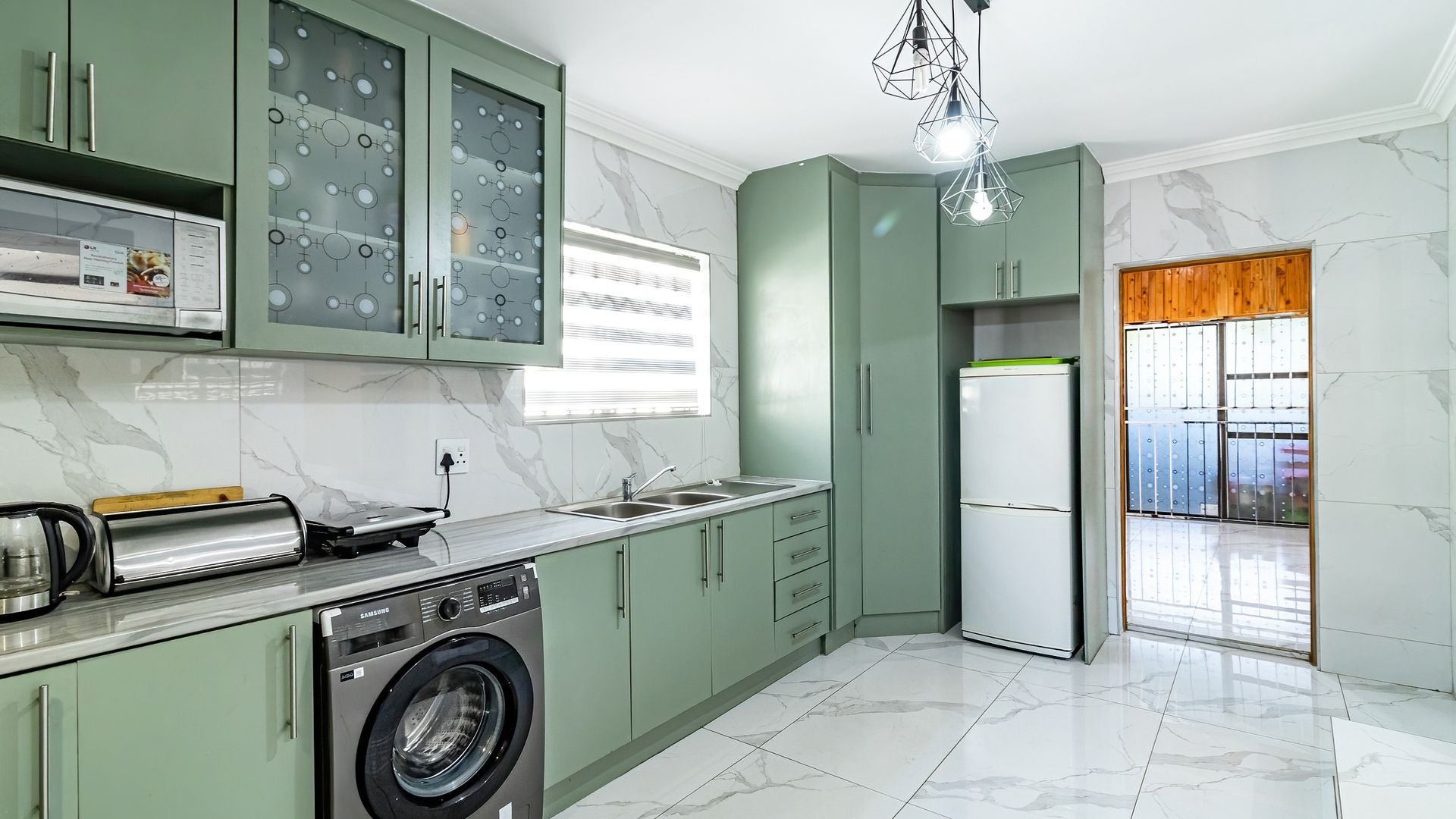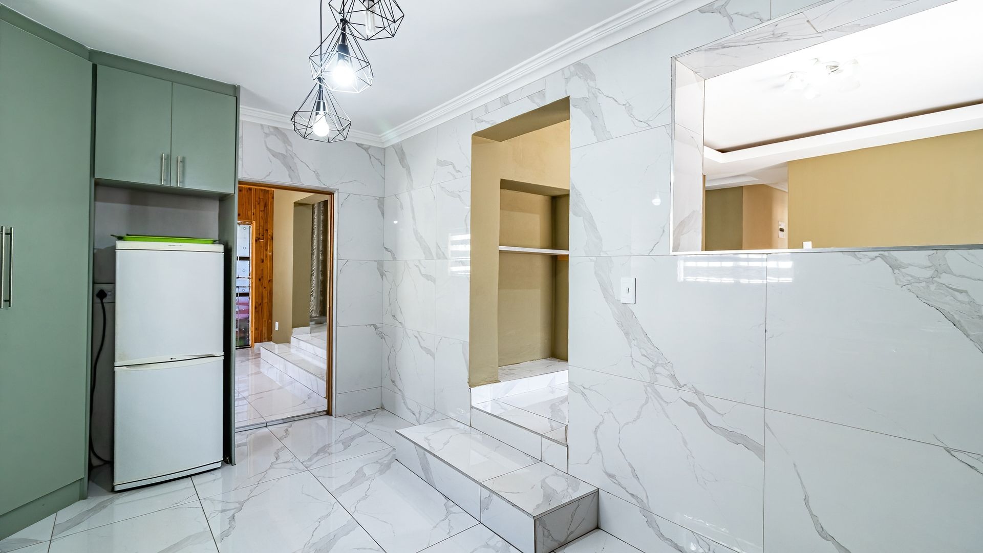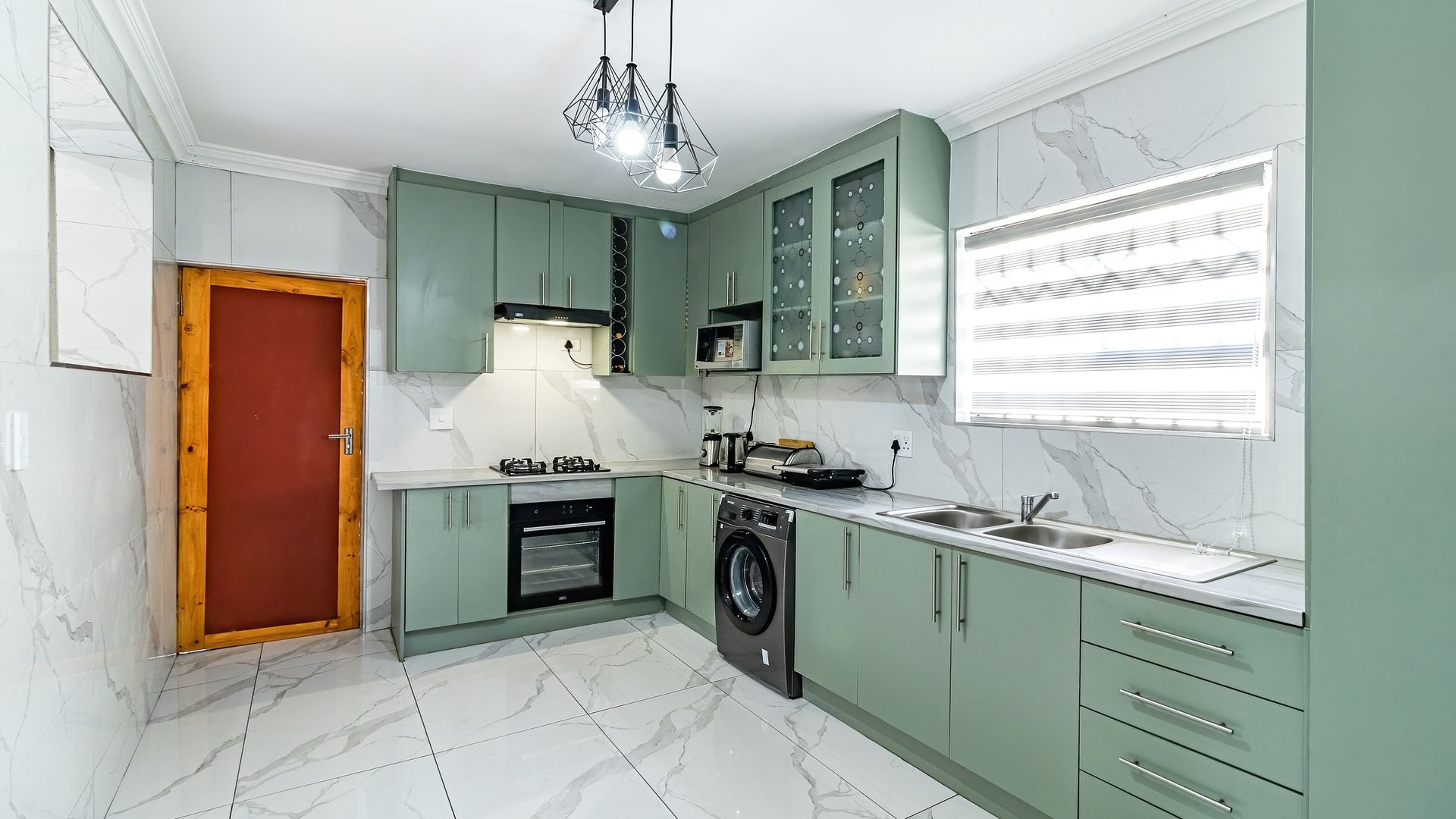 Step inside to contemporary living spaces designed for comfort and style. The spacious lounge and dining areas feature stylish large-format marble-look floor tiles and modern recessed ceilings with integrated lighting, creating a bright and airy ambiance. Unique wooden accent walls and a distinctive multi-level design add character and define separate zones. The modern kitchen is a highlight, equipped with contemporary blue and sage green cabinetry, a gas stove, and oven. Stylish geometric pendant lighting and a convenient pass-through window enhance functionality and flow.