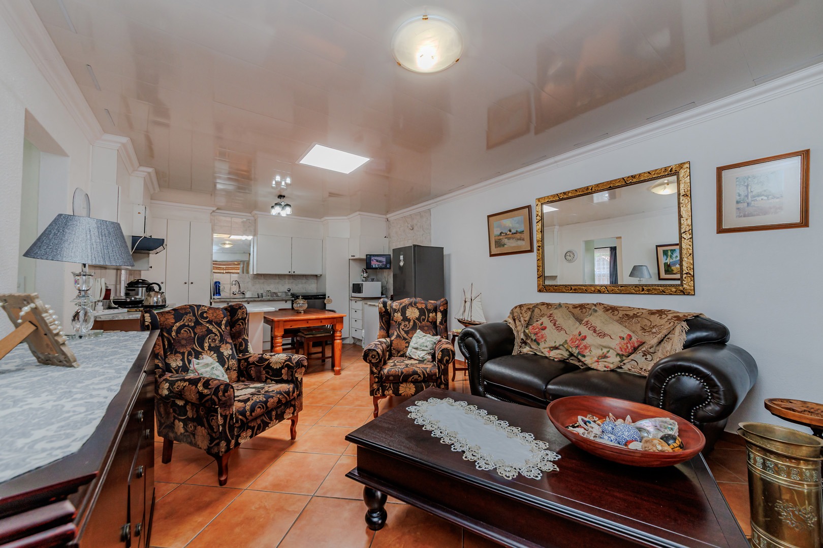 The light-filled open-plan living area flows onto a spacious patio with built-in braai,