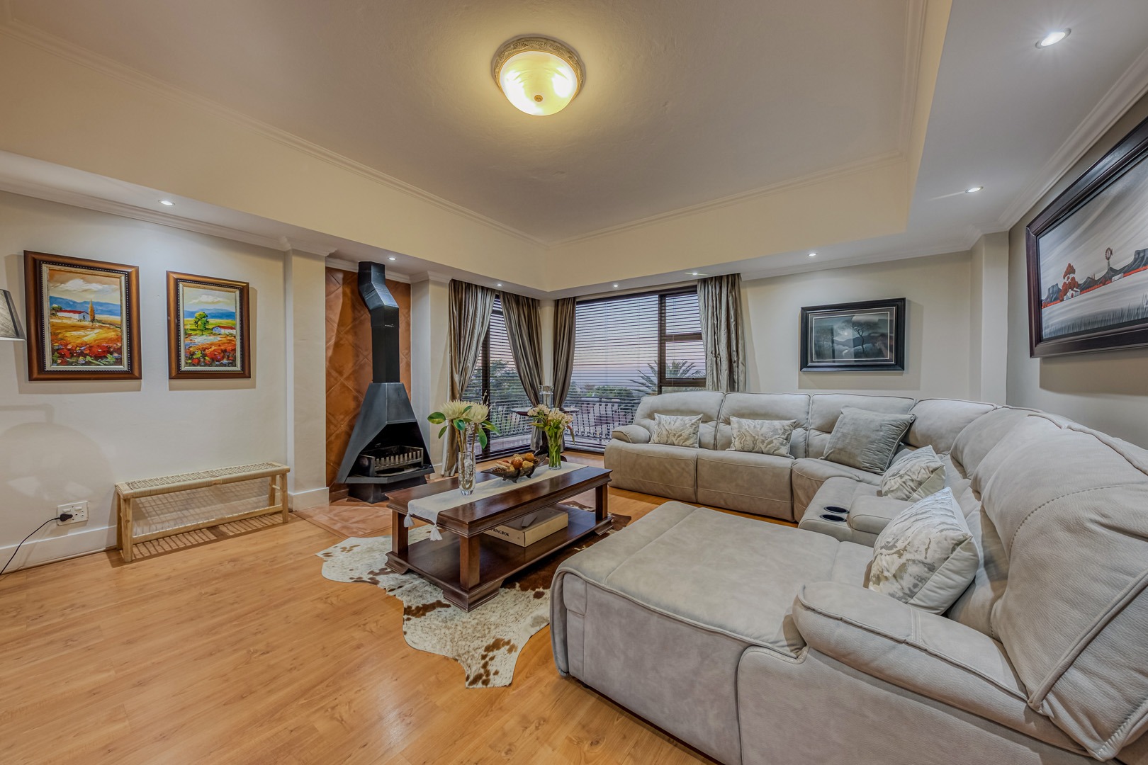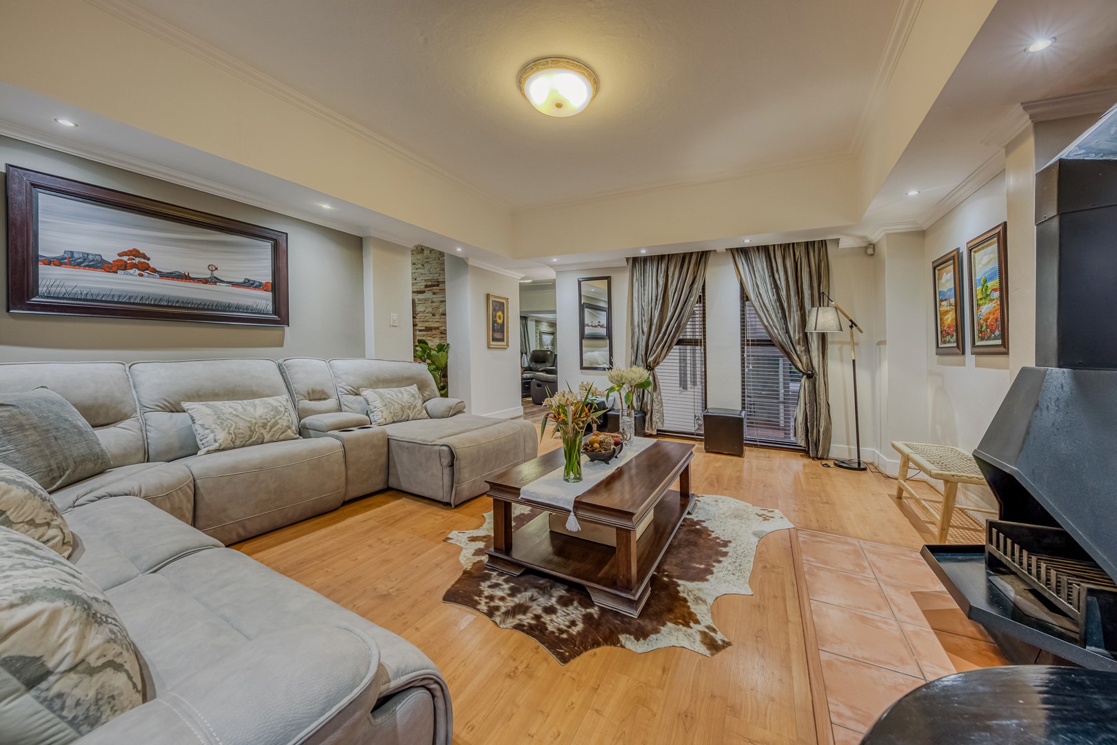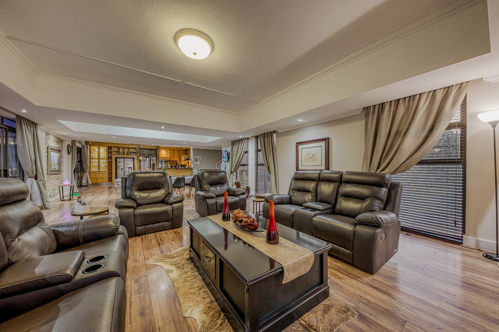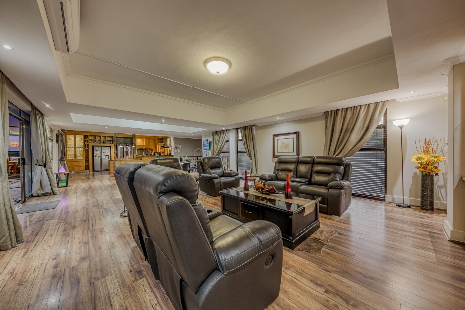 The kitchen is a showpiece on its own – equipped with a gas stove, dedicated scullery, separate laundry, and a walk-in pantry. Large open-plan living areas flow effortlessly, featuring a warm wood-burning fireplace and inverter air-conditioning units in key areas for year-round comfort. All curtains remain – an added bonus for the new owners.
