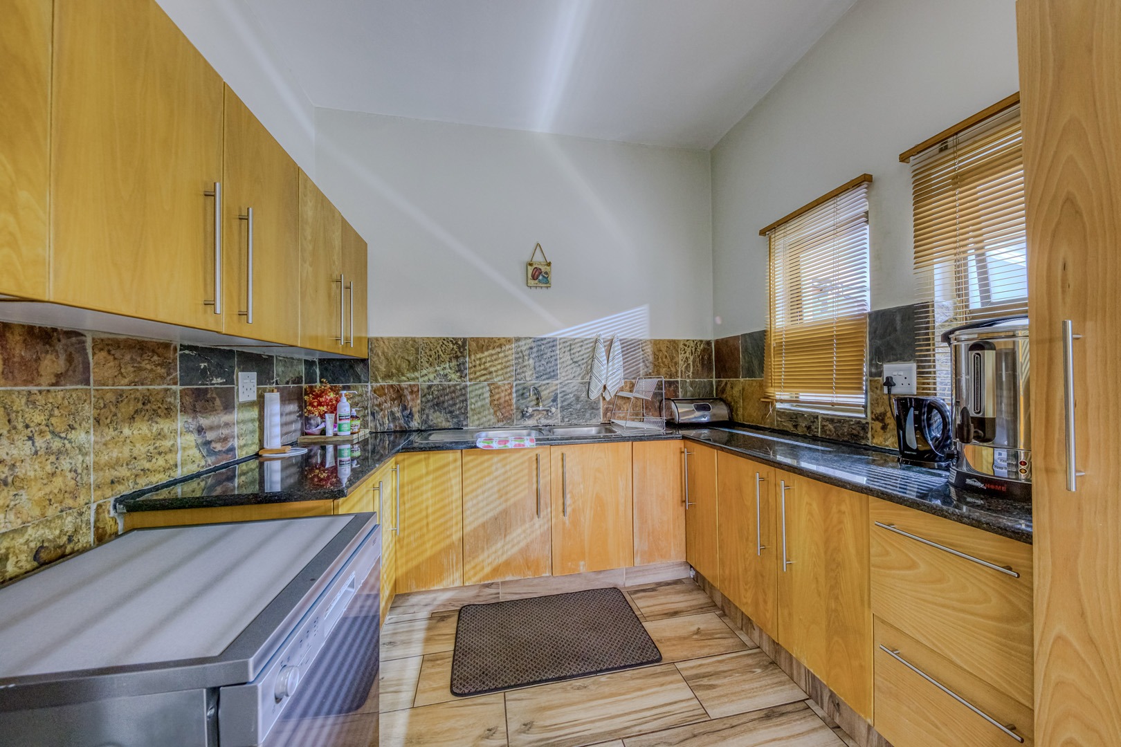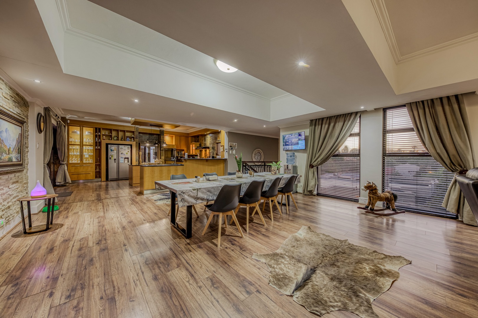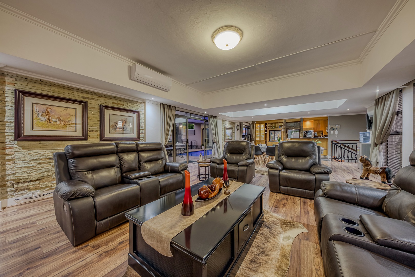 The kitchen is a showpiece on its own – equipped with a gas stove, dedicated scullery, separate laundry, and a walk-in pantry. Large open-plan living areas flow effortlessly, featuring a warm wood-burning fireplace and inverter air-conditioning units in key areas for year-round comfort. All curtains remain – an added bonus for the new owners.