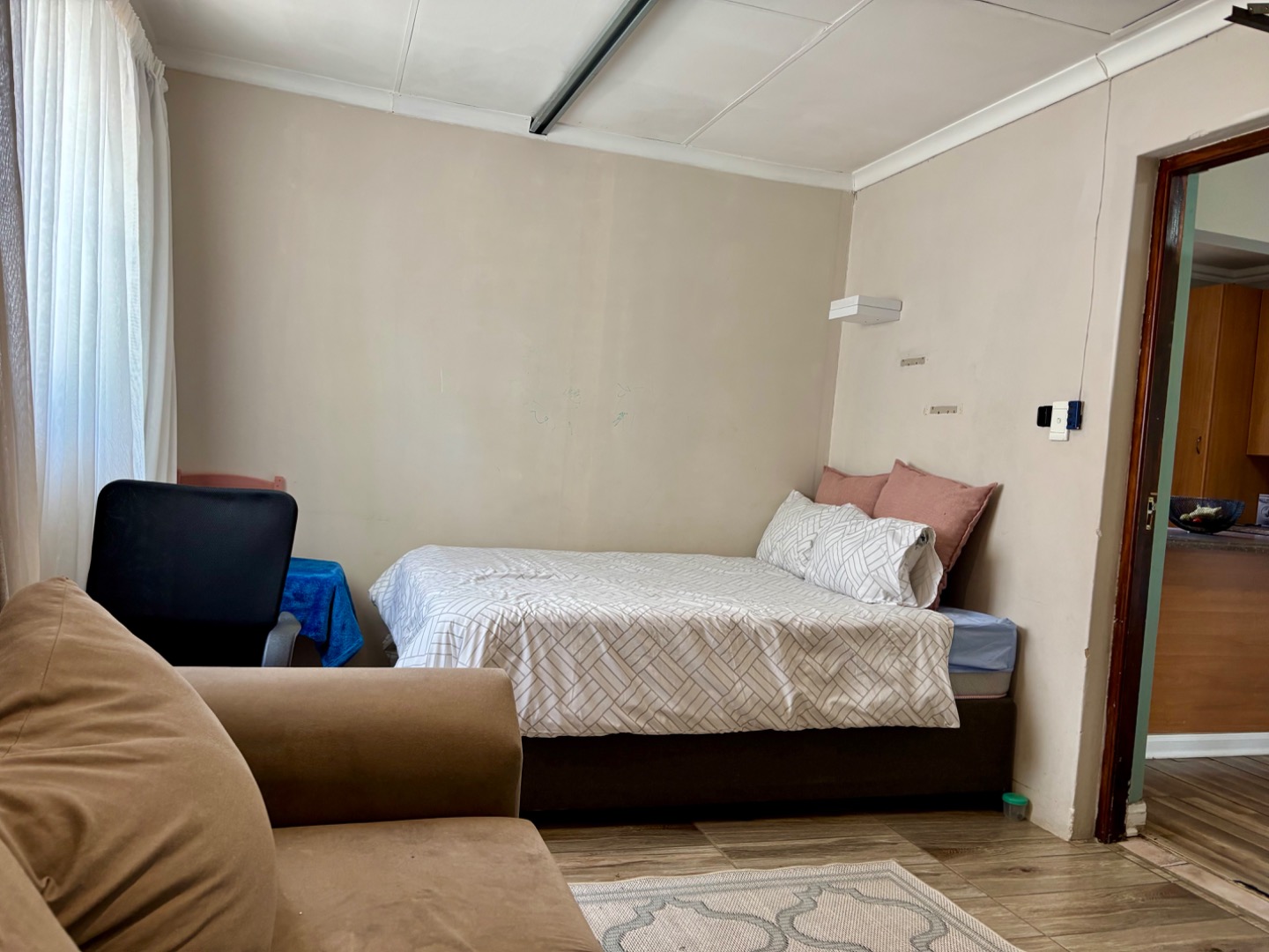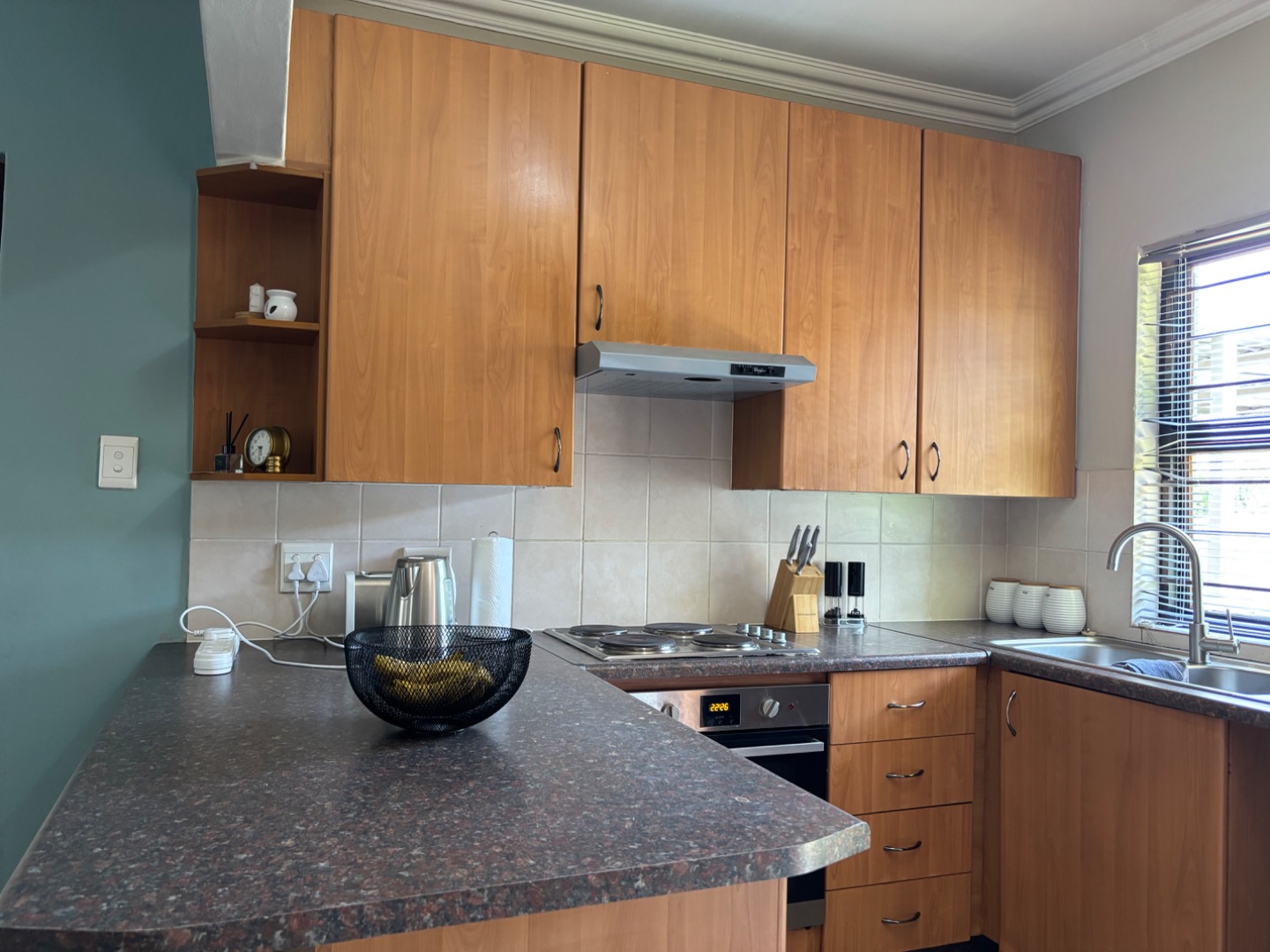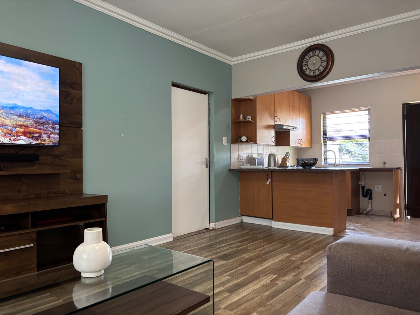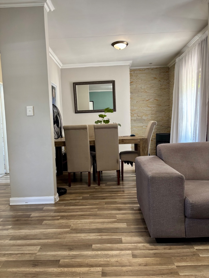 The interior boasts an open-plan layout, seamlessly connecting the lounge, dining area, and kitchen. Modern laminate flooring extends throughout the living spaces, complemented by large windows that invite ample natural light. The functional kitchen features warm-toned wooden cabinets, dark speckled countertops, a neutral tile backsplash, and is equipped with a stove, oven, and extractor fan, catering to everyday culinary needs. Space for 3 appliances plus a fridge/freezeer.