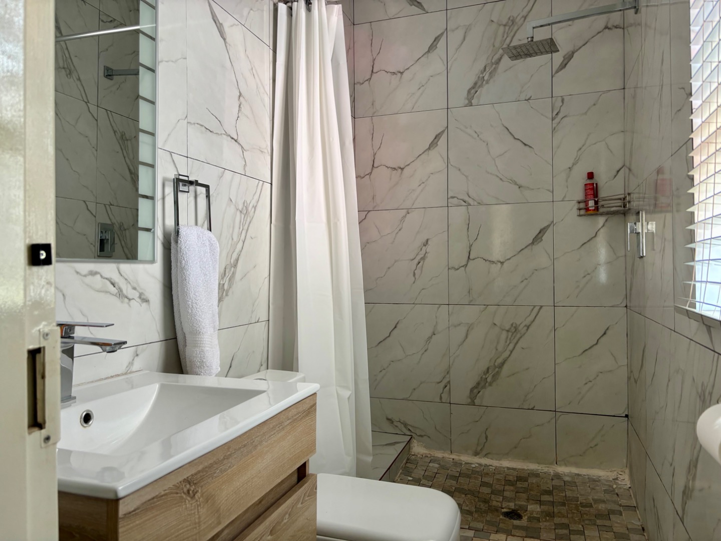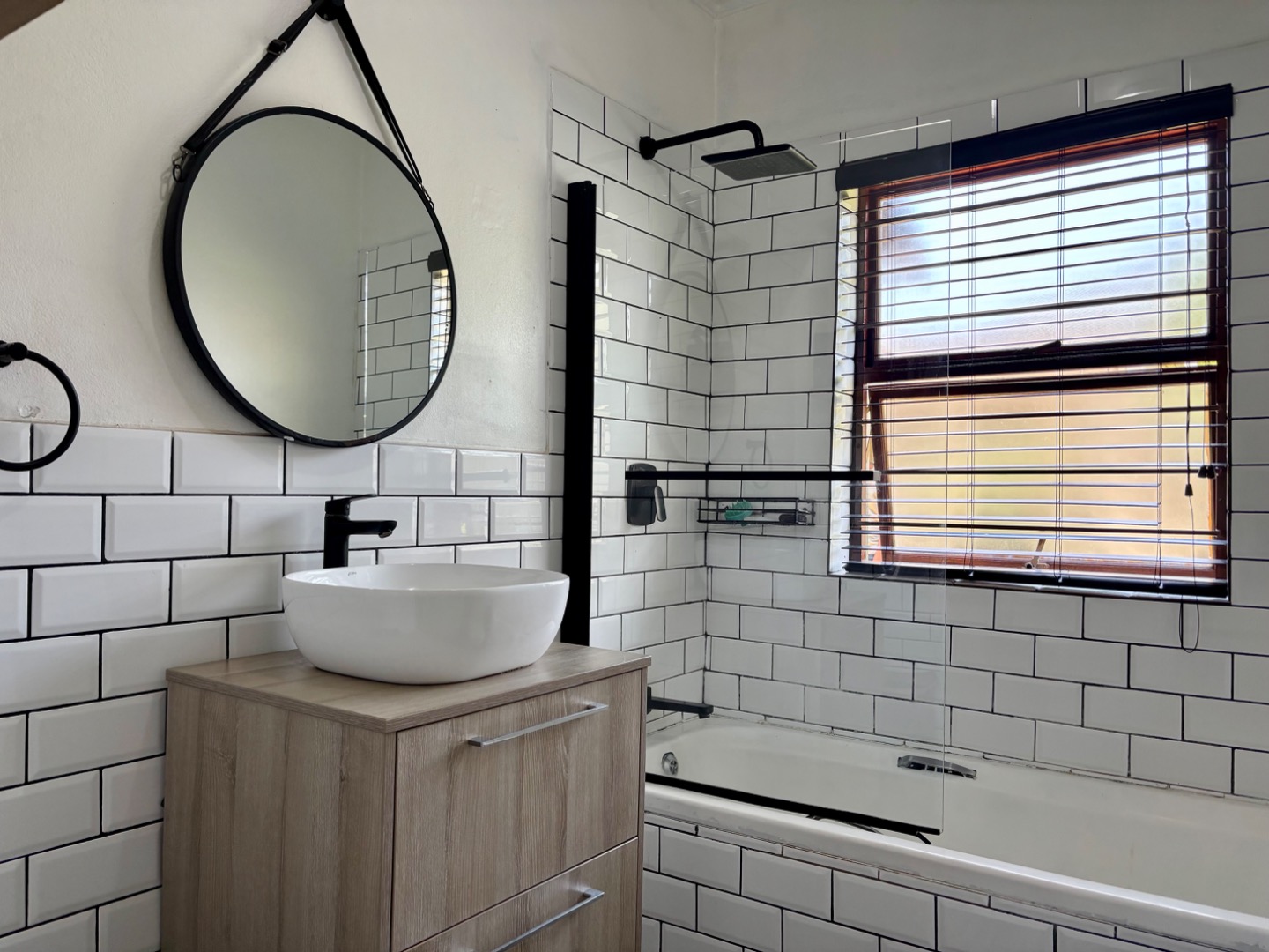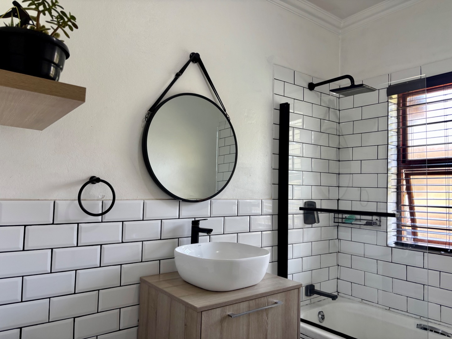 Bedroom 2 can host a double bed, while the 3rd bedroom is found off the lounge offering a large pad for a student or young adult with the single garage being converted into a full bedroom. Both these bedrooms are served by the additional full bathroom with the most beautiful modern finishes including floating wooden basin cupboard with large double drawers, railway white tiles, black matt taps and shower head.