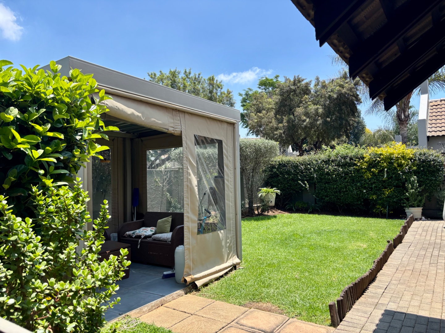 Step outside to a well-maintained garden featuring lush green lawns, mature landscaping, and paved pathways. The property offers versatile outdoor living with a functional outdoor enclosure and a dedicated gazebo area with tent canvasses which can completely close up even on the sides in winter while opening up completely in summer time, perfect for relaxation or entertaining guests.