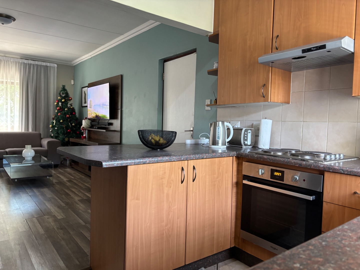 The interior boasts an open-plan layout, seamlessly connecting the lounge, dining area, and kitchen. Modern laminate flooring extends throughout the living spaces, complemented by large windows that invite ample natural light. The functional kitchen features warm-toned wooden cabinets, dark speckled countertops, a neutral tile backsplash, and is equipped with a stove, oven, and extractor fan, catering to everyday culinary needs. Space for 3 appliances plus a fridge/freezeer.