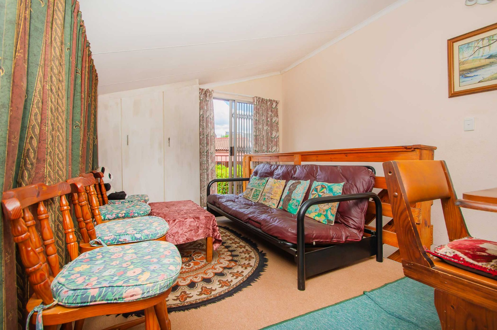 As you take the stairs up to the loft area, you’ll be surprized by the space and lovely views it offers. With built-in cupboards and a sliding door leading onto a balcony, this is perfect for use as the 2nd bedroom or as an extra lounge/entertainment area.