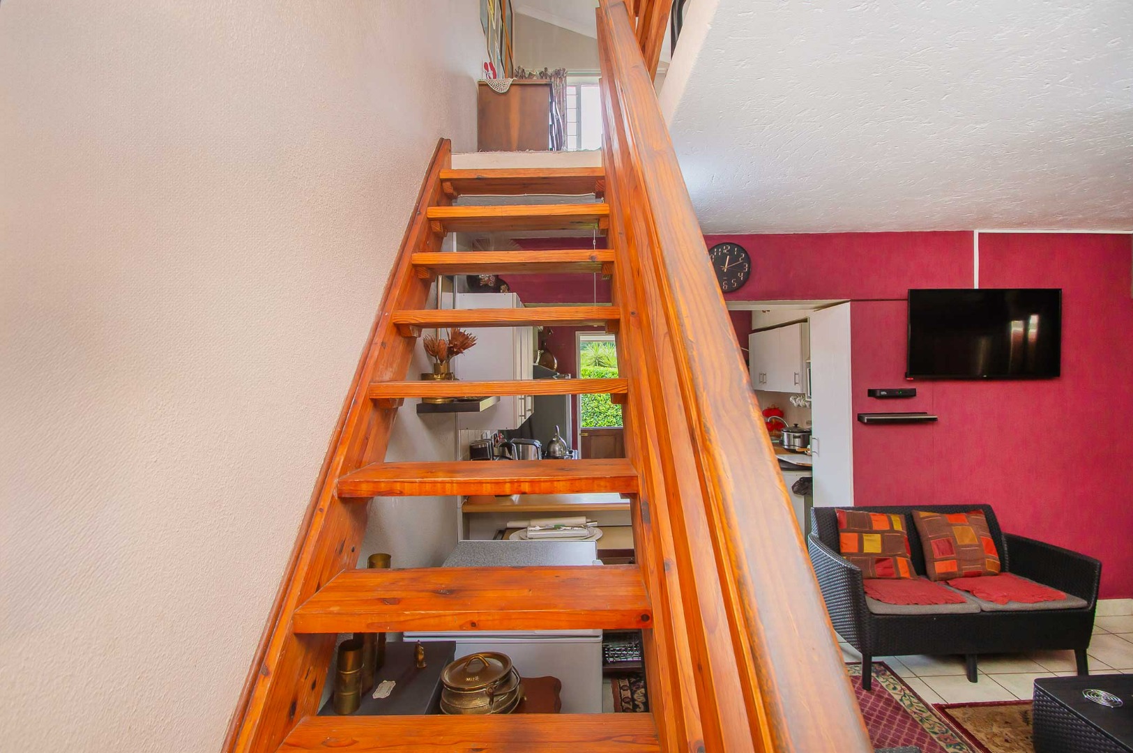 As you take the stairs up to the loft area, you’ll be surprized by the space and lovely views it offers. With built-in cupboards and a sliding door leading onto a balcony, this is perfect for use as the 2nd bedroom or as an extra lounge/entertainment area.