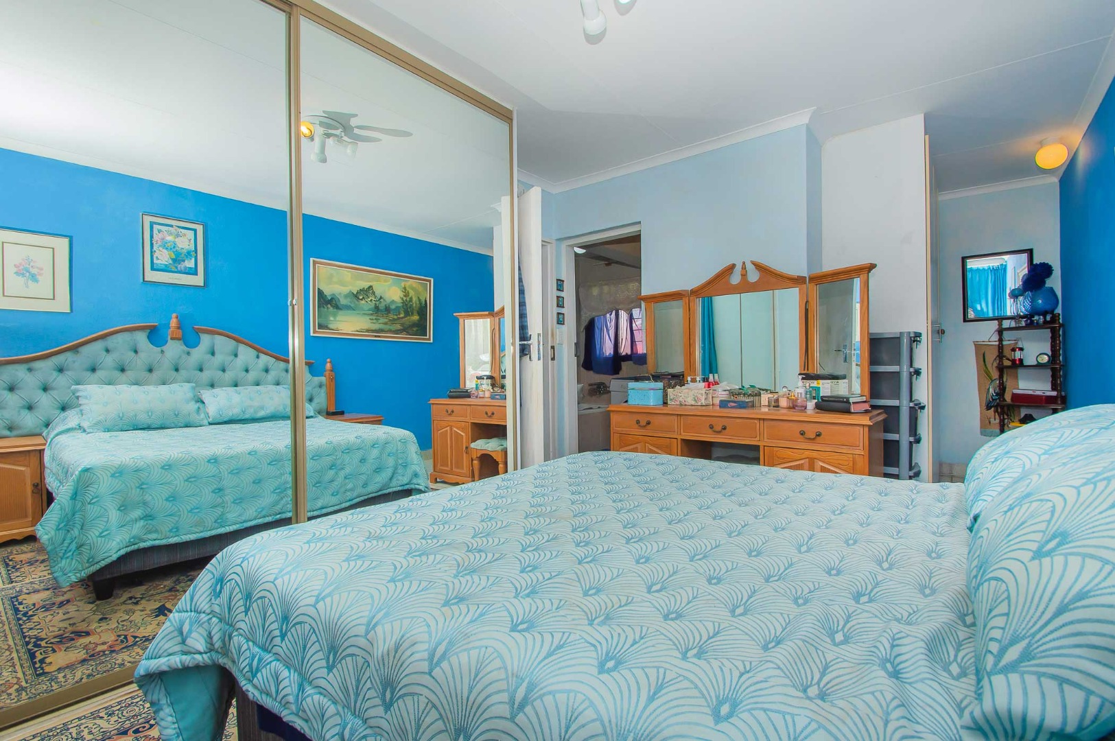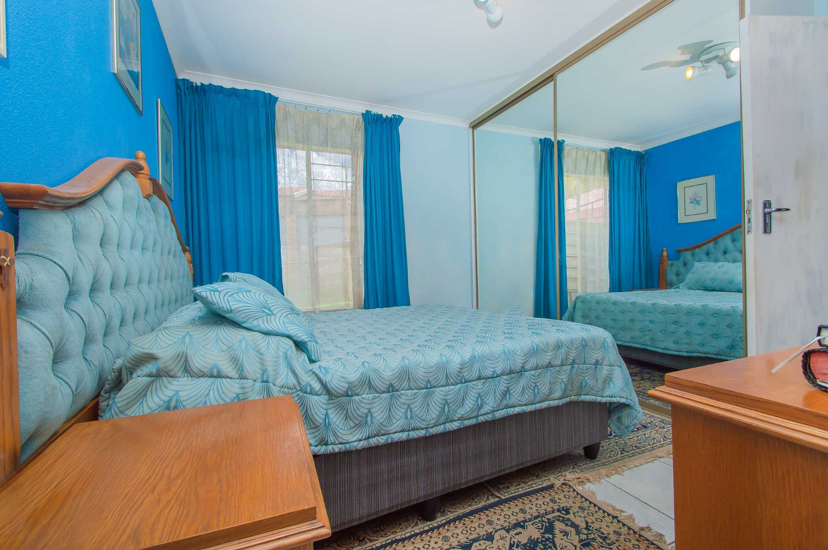 The main bedroom downstairs is very large. There are built-in-cupboards with mirrored doors as well as extra cupboards on the side for added comfort.