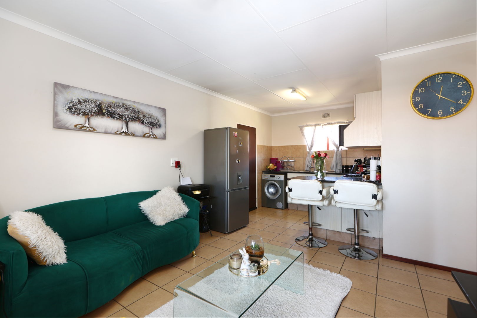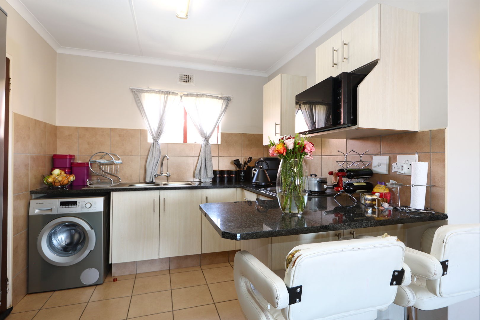 The heart of this home is its modern kitchen, featuring sleek, light-wood-look cabinetry, dark granite countertops, and a convenient breakfast bar for casual dining. It comes well-equipped with an integrated stove and oven, and includes dedicated under-counter space for a washing machine, ensuring functionality and style. Tiled flooring extends throughout the main living spaces, providing a clean and low-maintenance finish.