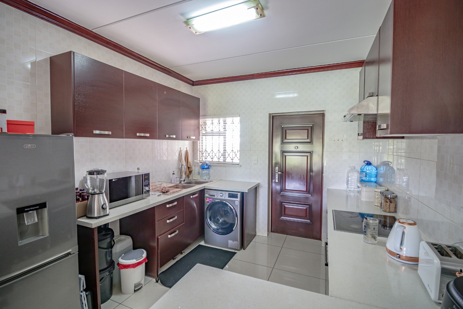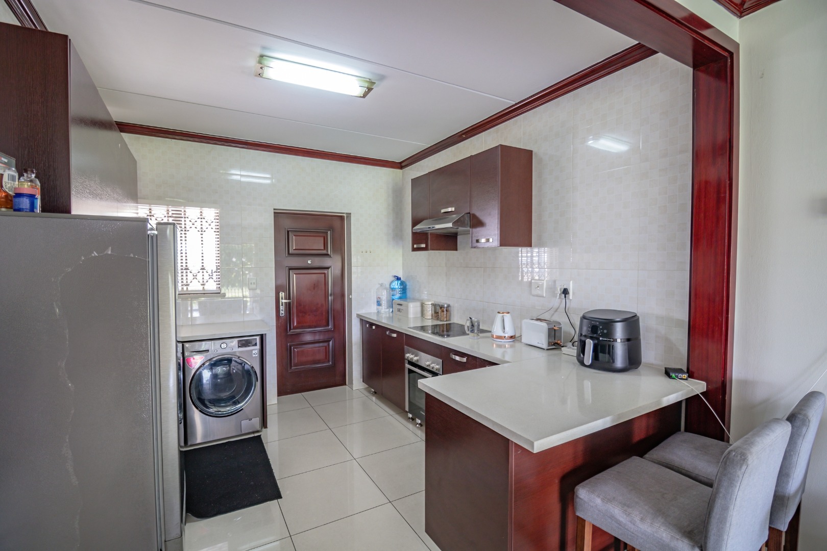 The modern kitchen is beautifully finished with Caesarstone countertops, ample cupboard space, and provision for one wet appliance, making it both functional and stylish.