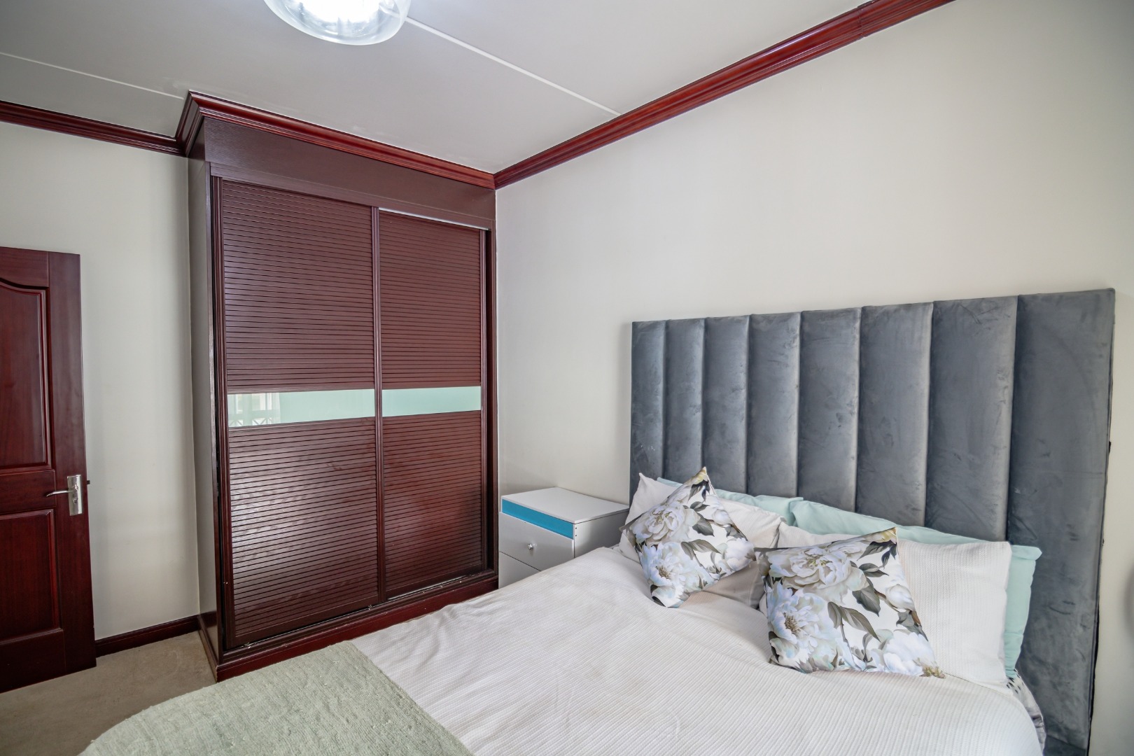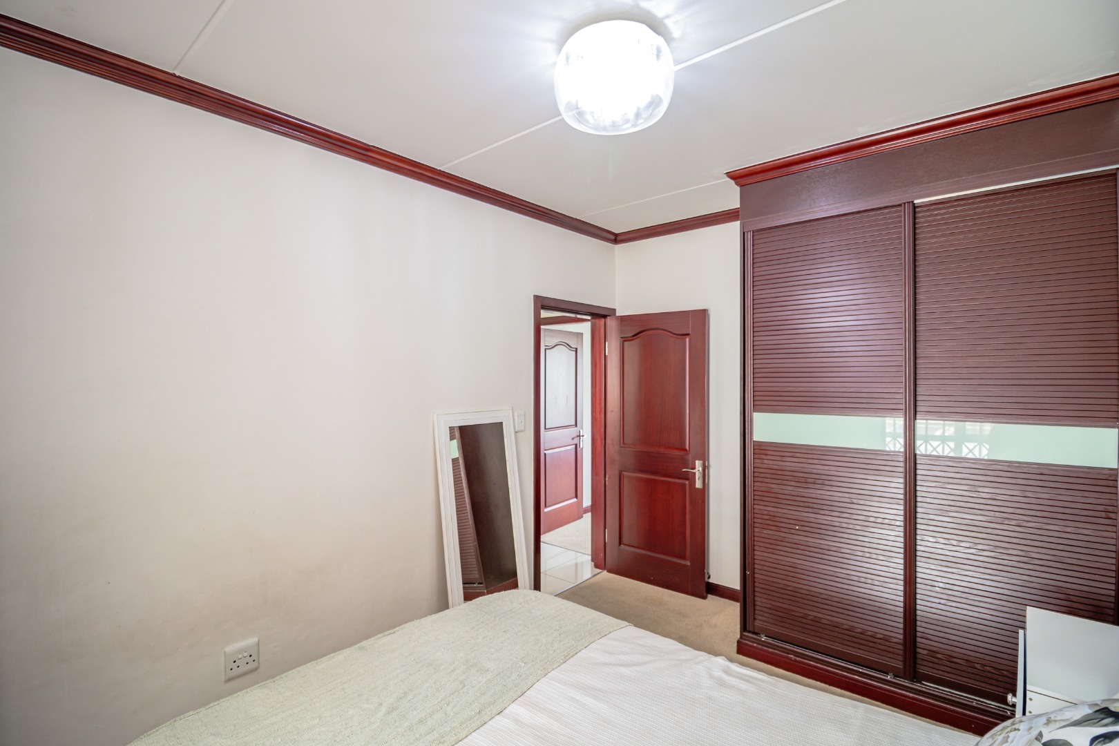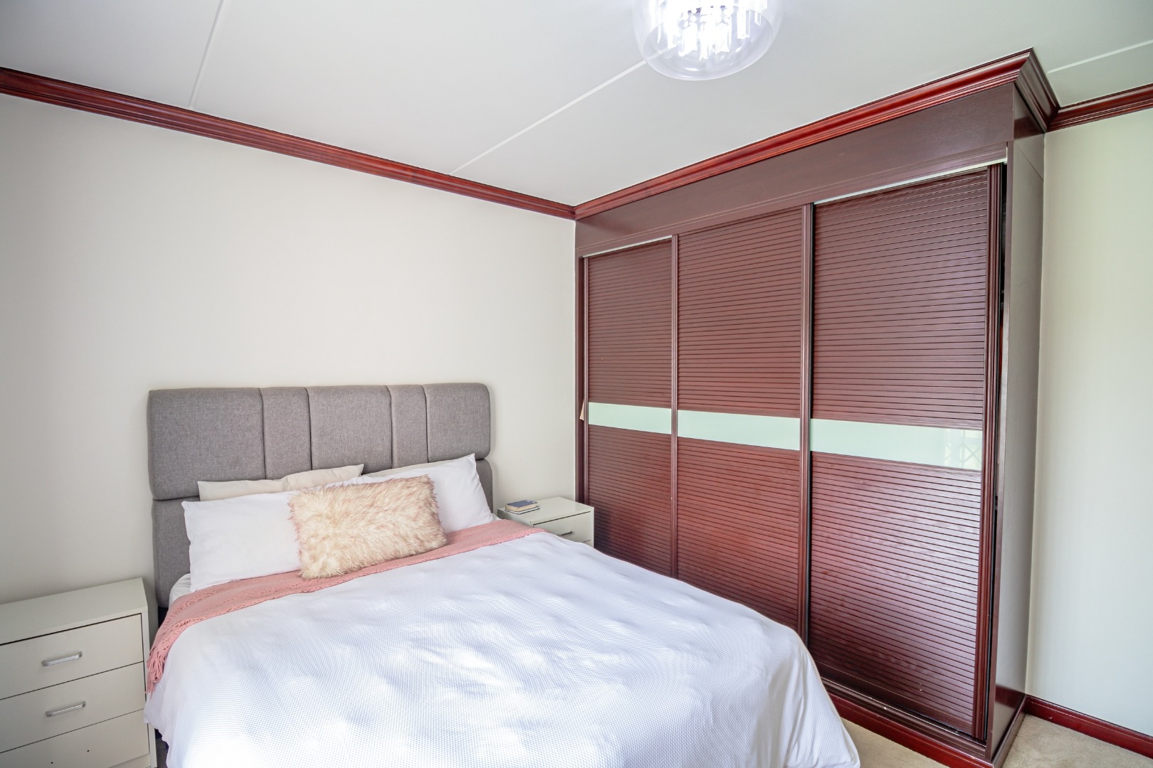 The apartment features two generously sized, carpeted bedrooms, both fitted with stunning built-in cupboards, with the main bedroom being notably spacious.