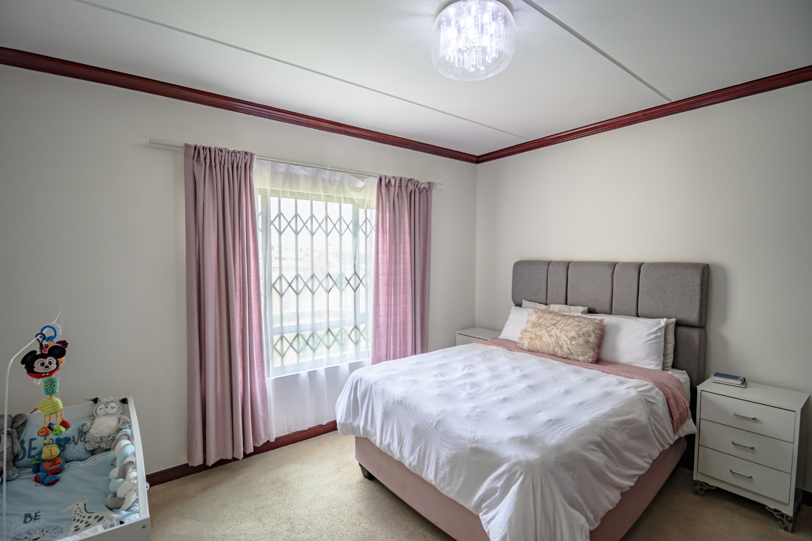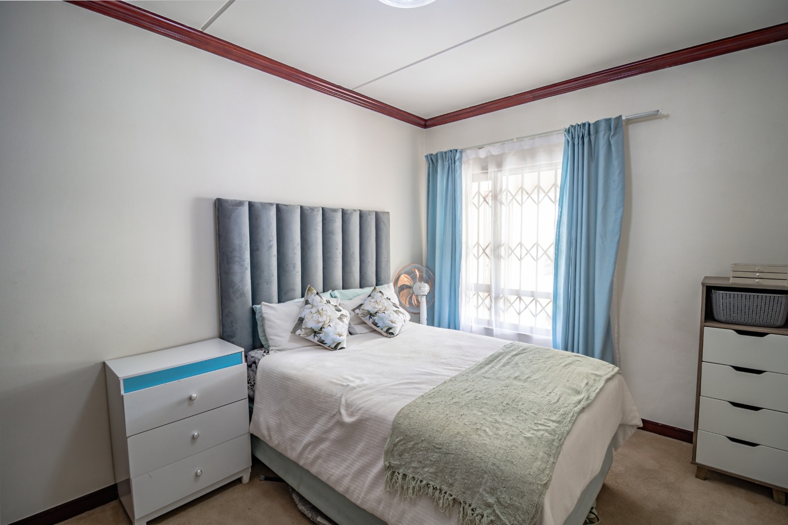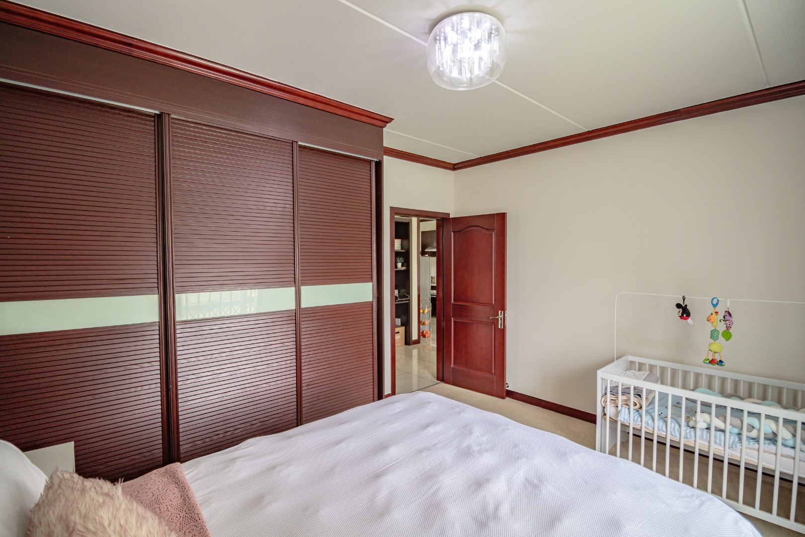 The apartment features two generously sized, carpeted bedrooms, both fitted with stunning built-in cupboards, with the main bedroom being notably spacious.