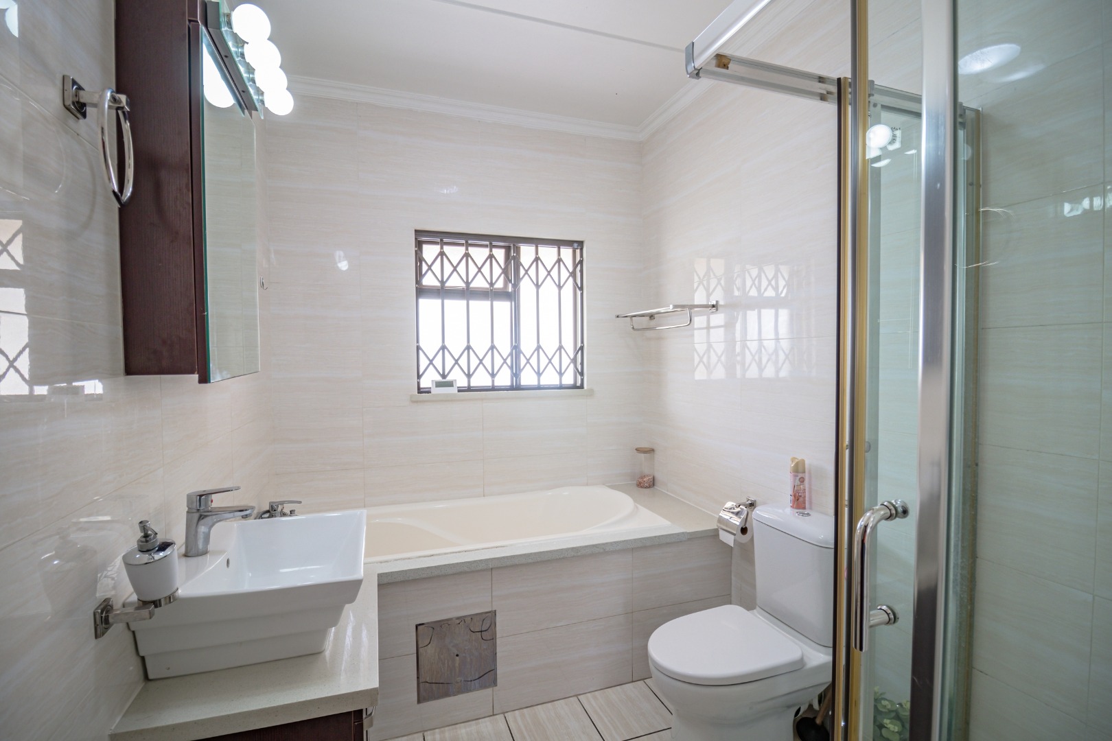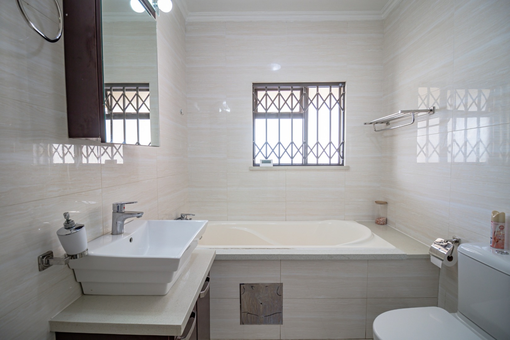 The full bathroom is exceptionally spacious and includes a shower, bathtub, hand basin, and toilet, offering both comfort and practicality.