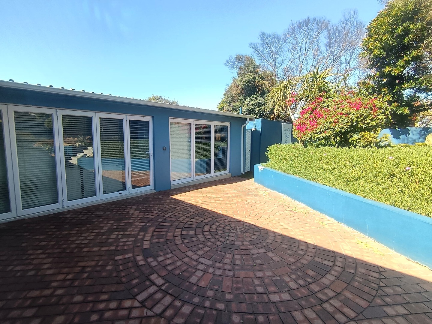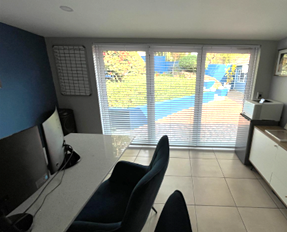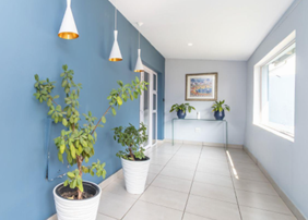 The office layout includes four private offices, two of which open onto a landscaped garden through stacking doors – creating a seamless indoor-outdoor working environment. The property also offers male and female restrooms and low-maintenance tiled flooring throughout.