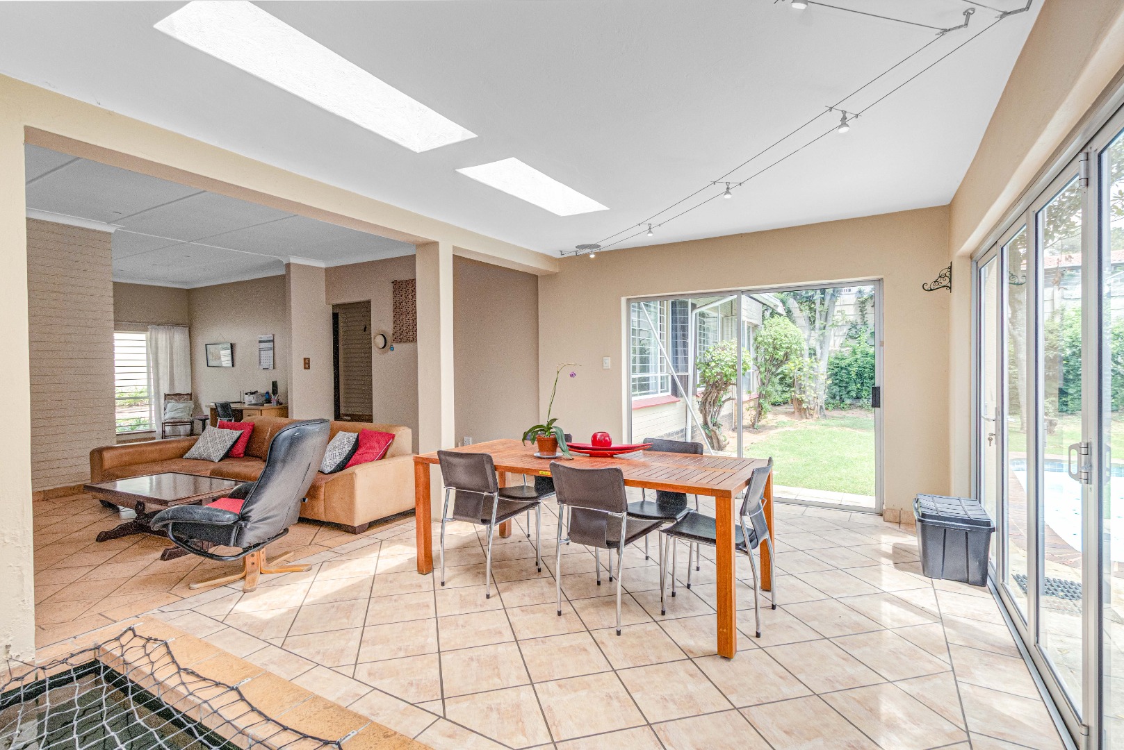 Glass sliding doors opening onto a spacious patio, ideal for entertaining