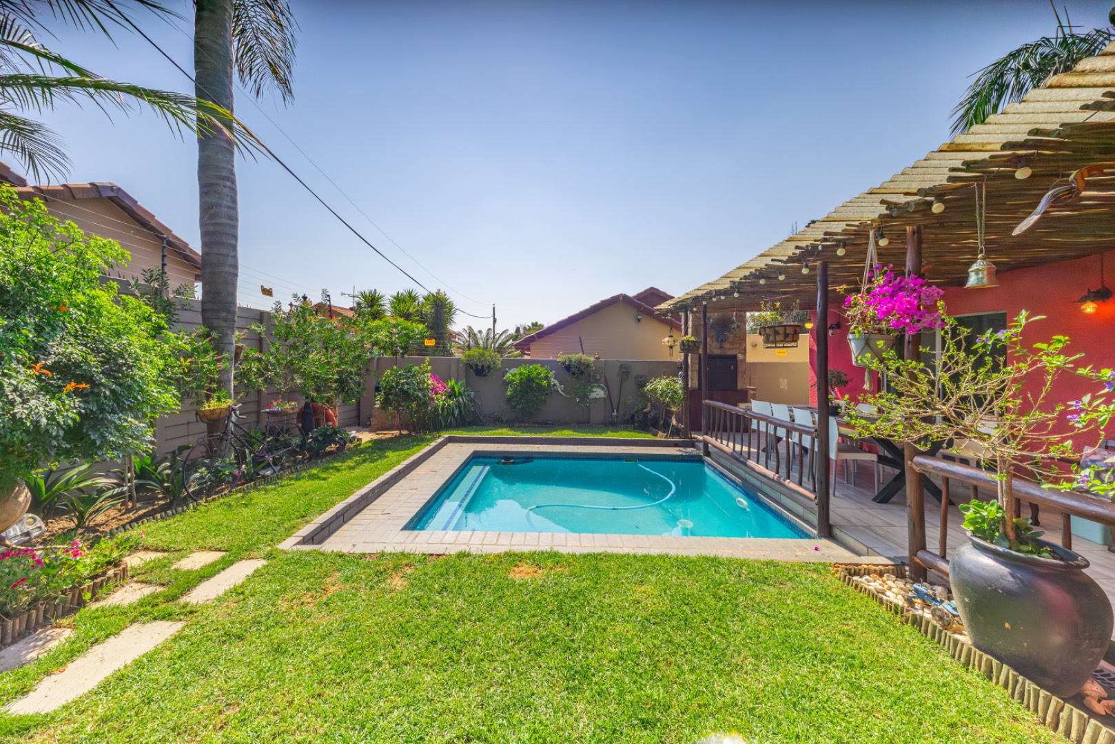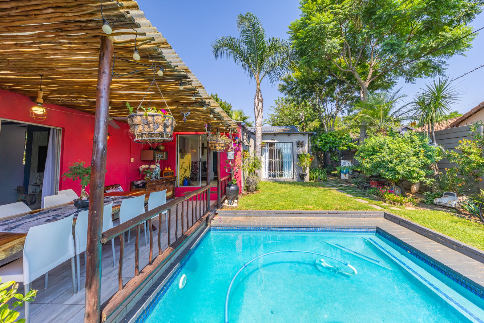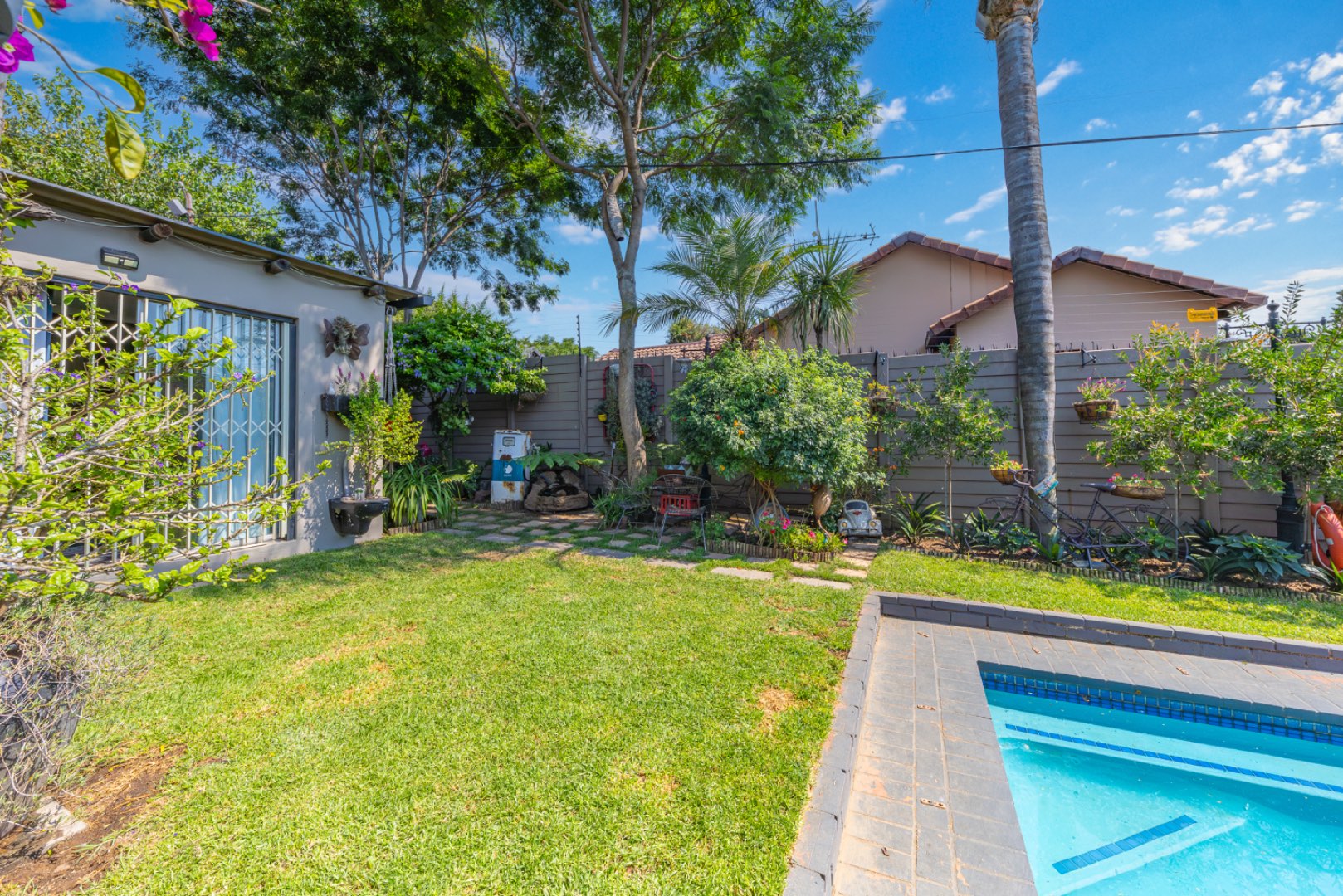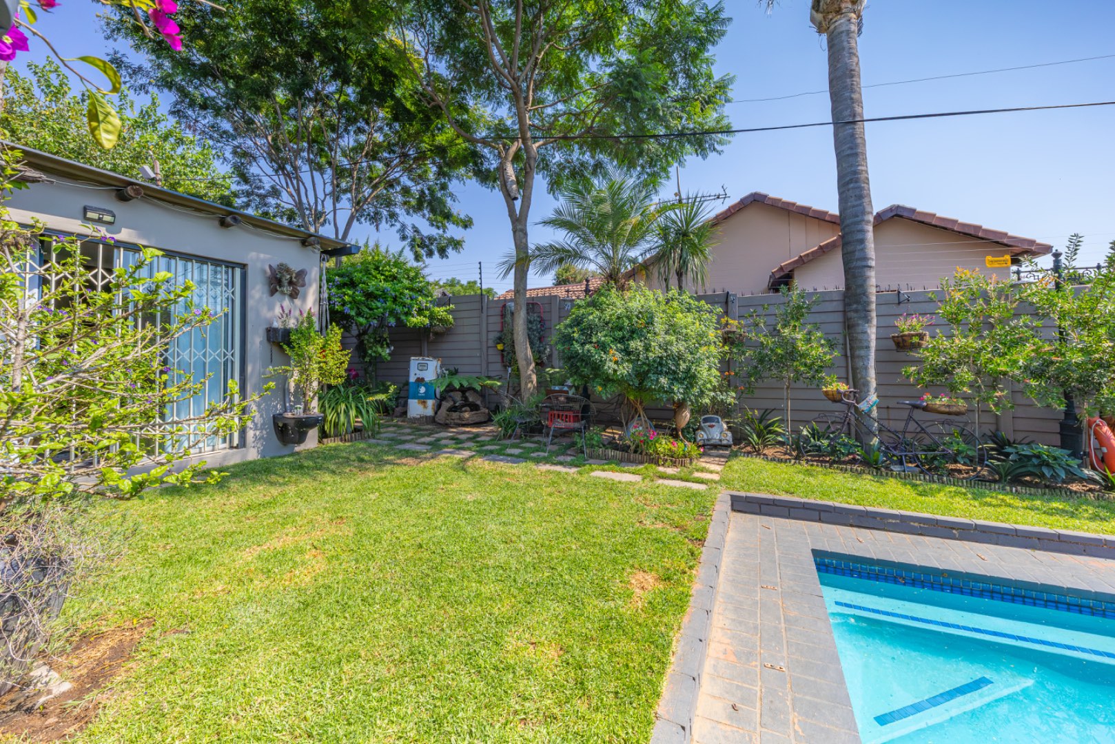 Step outside to enjoy a sparkling swimming pool, ideal for warm summer days and entertaining guests.