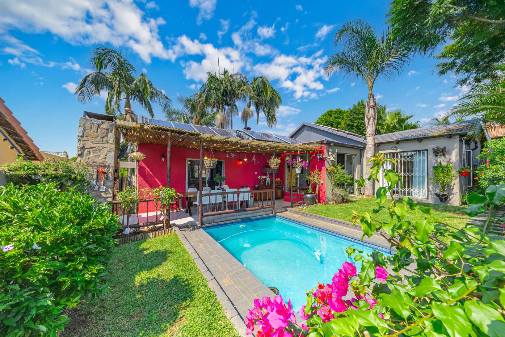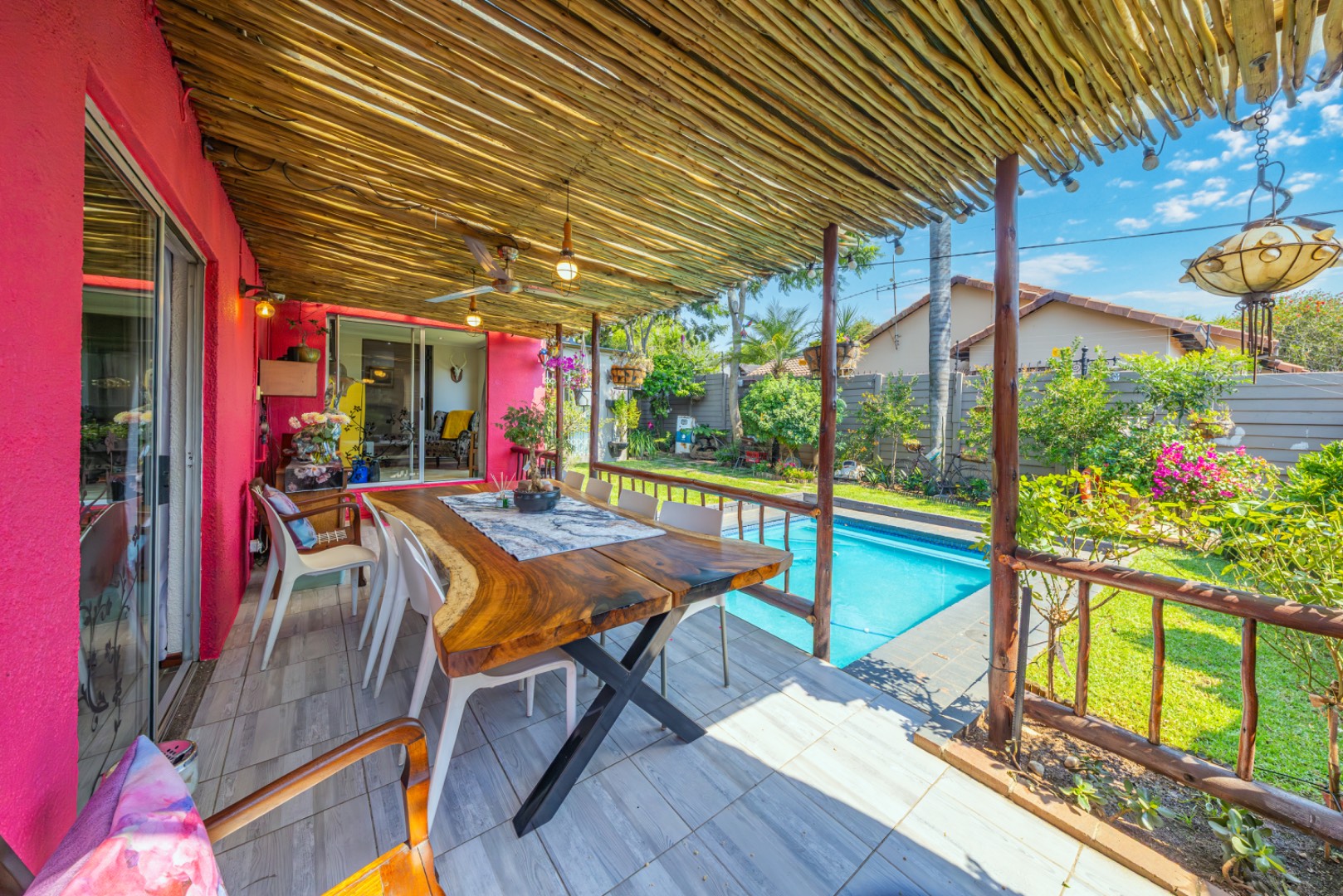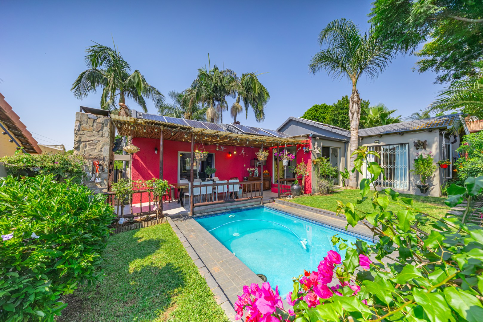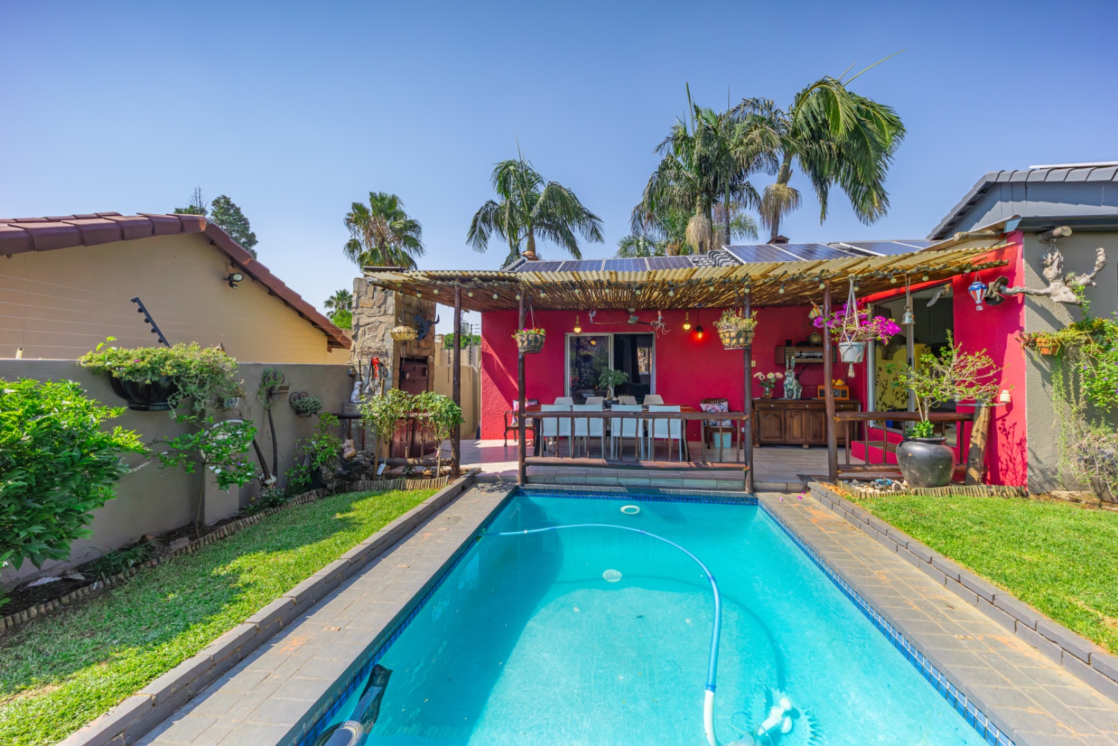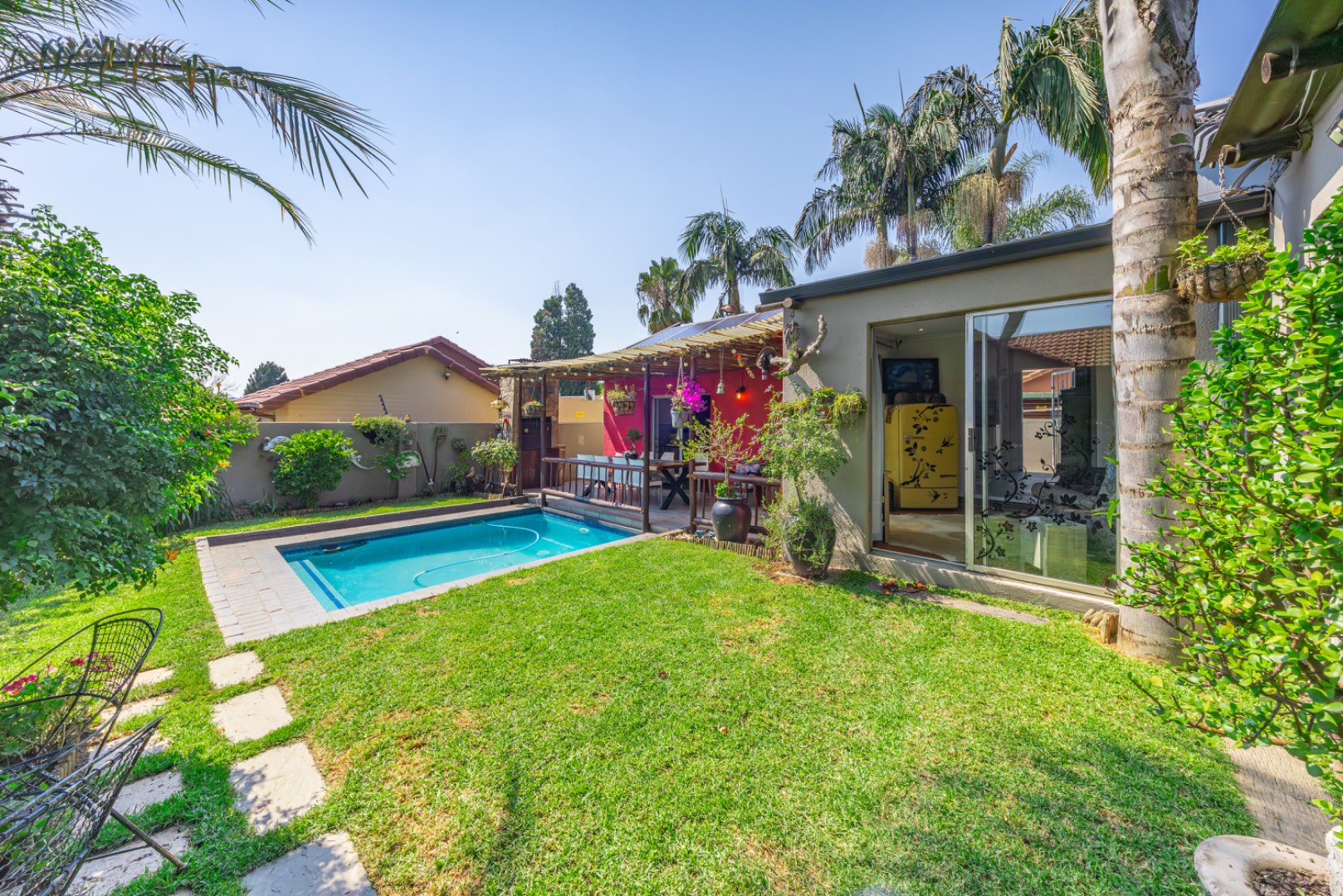 Step outside to enjoy a sparkling swimming pool, ideal for warm summer days and entertaining guests.