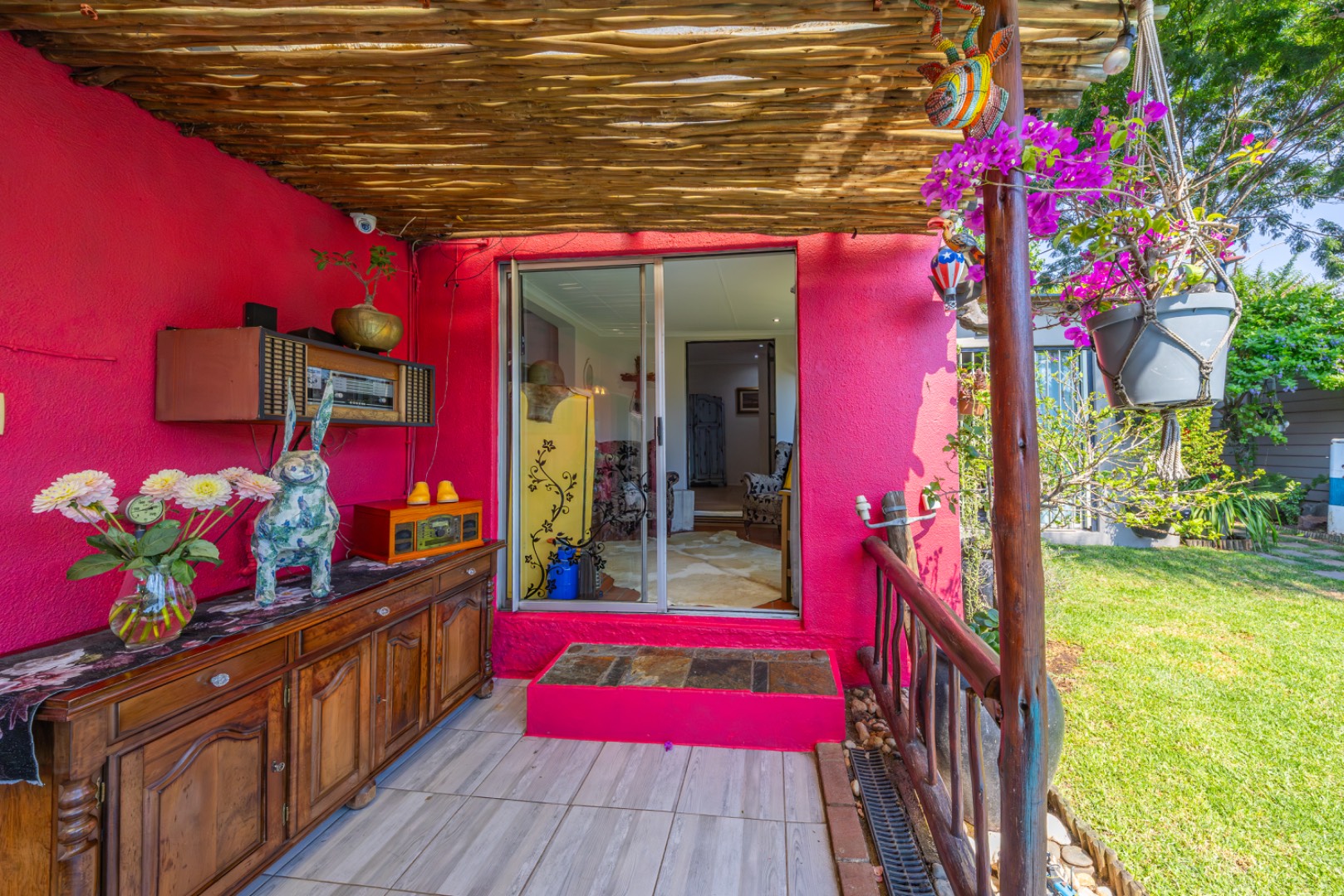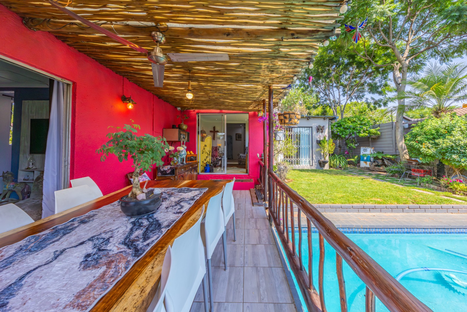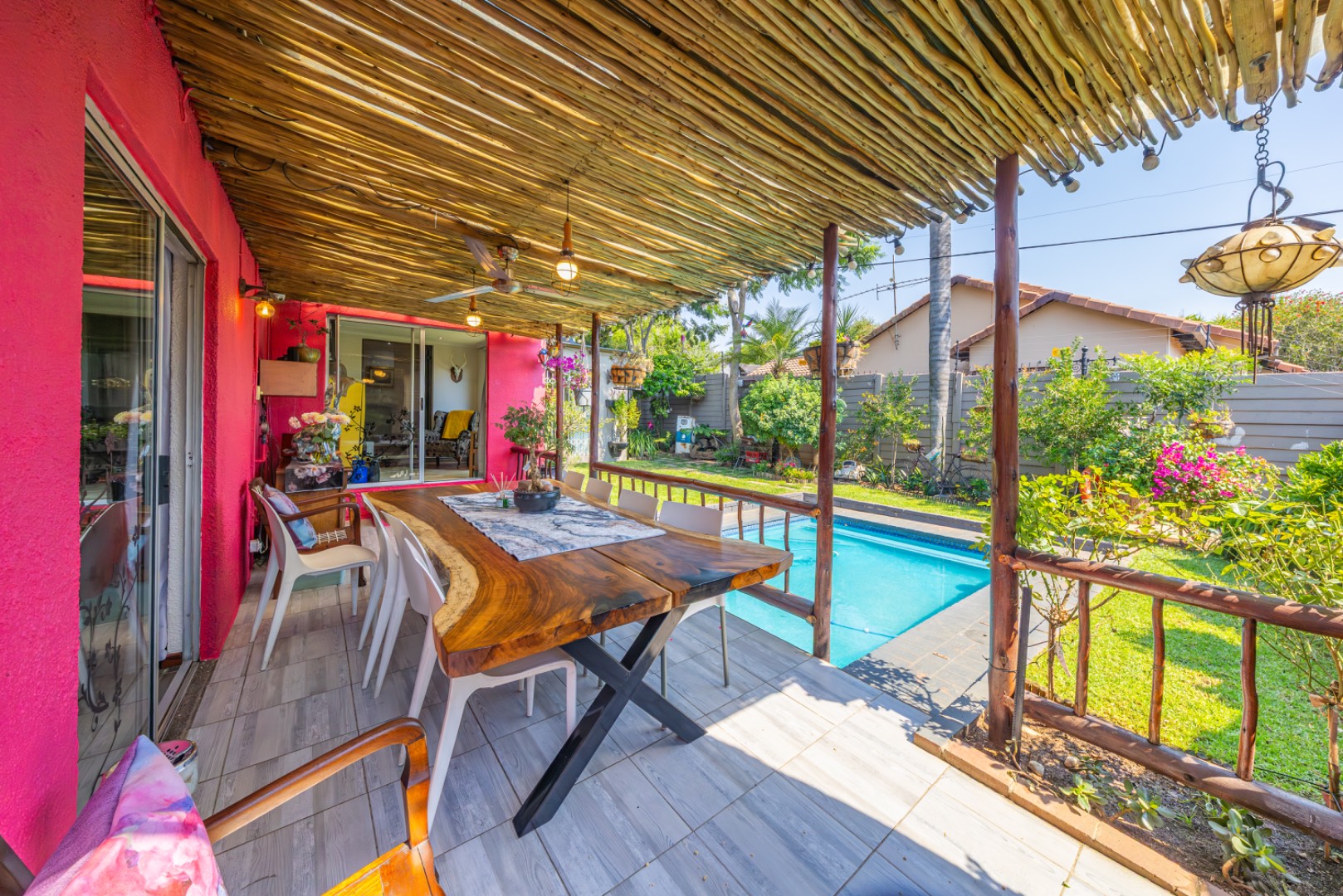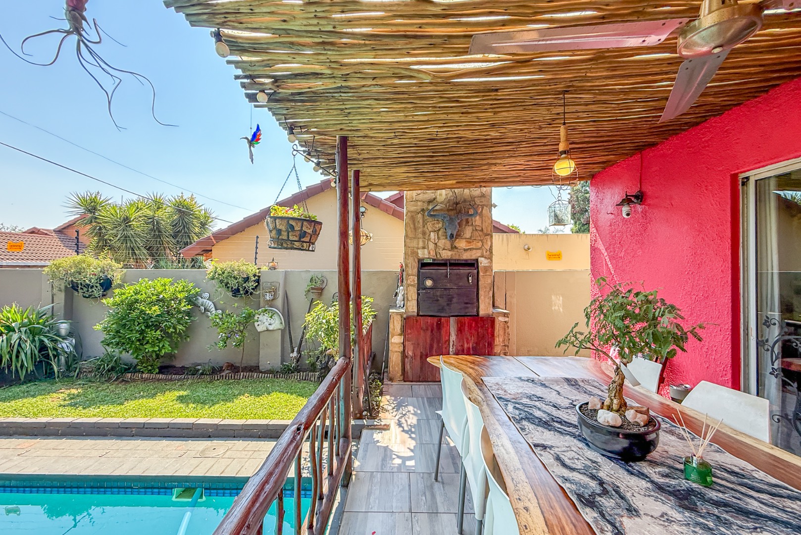 Step outside to enjoy a sparkling swimming pool, ideal for warm summer days and entertaining guests.