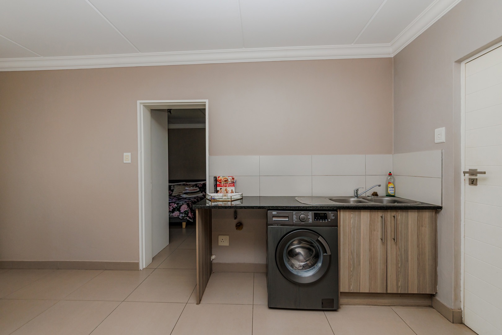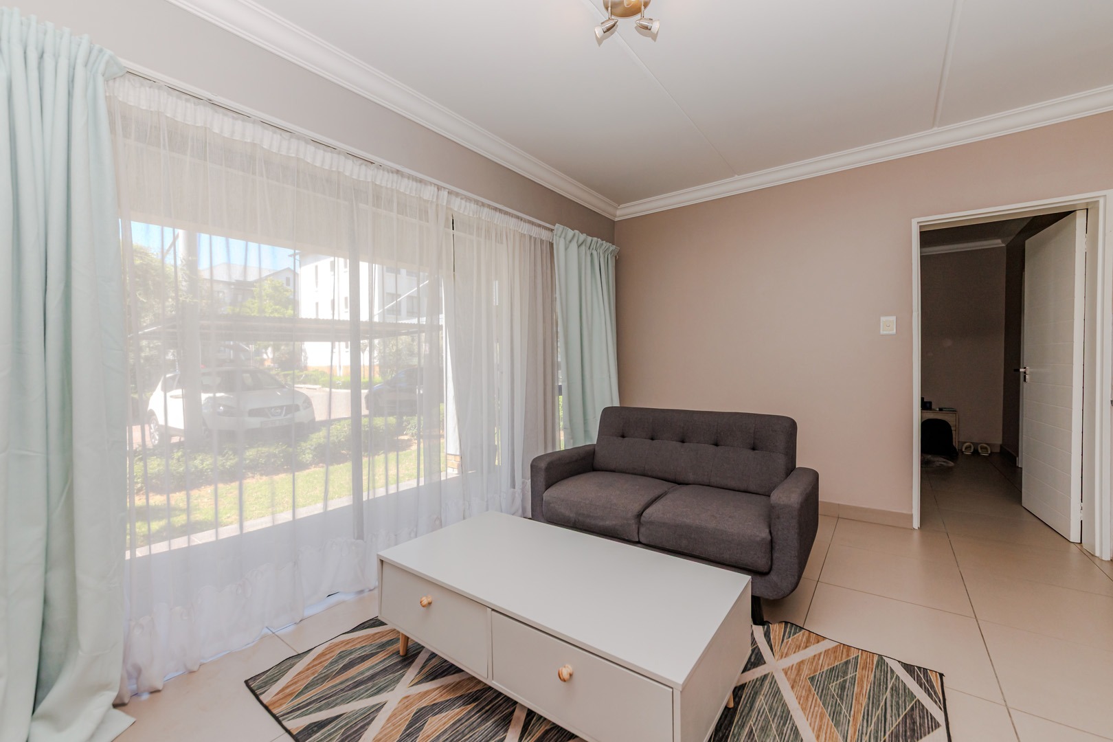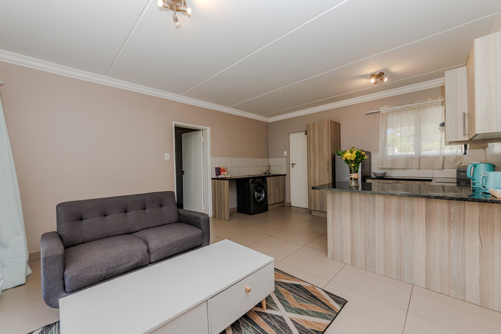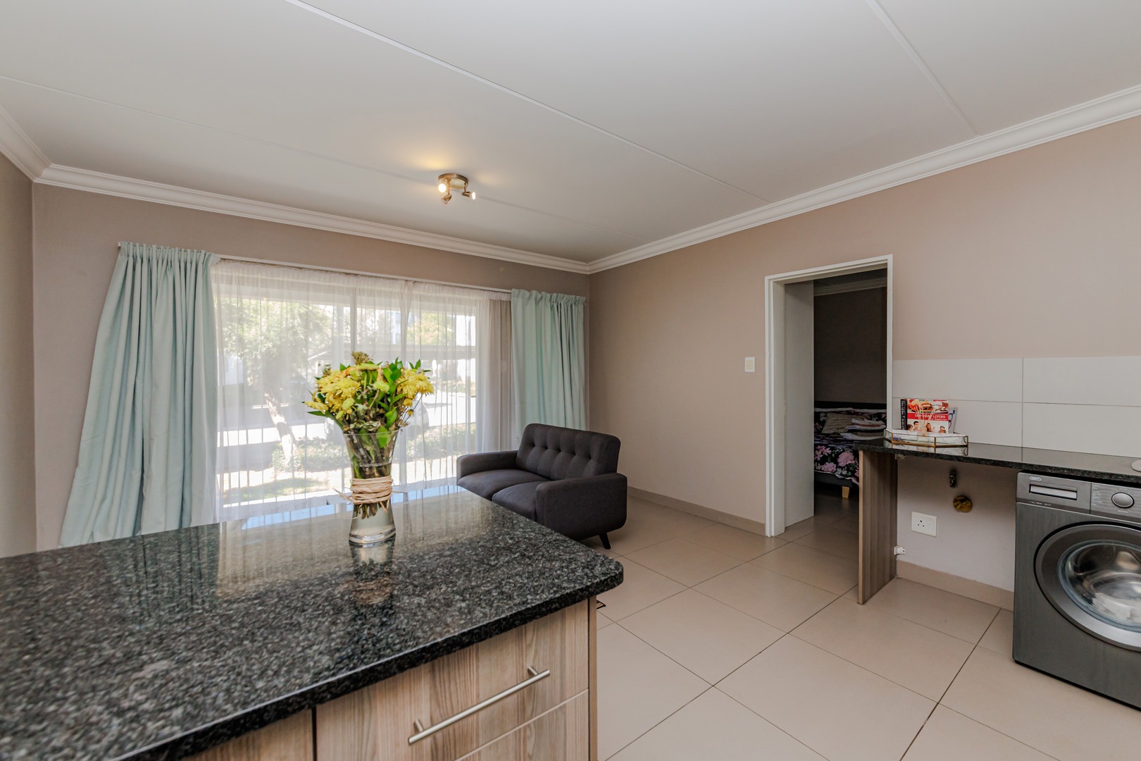 Step inside to discover a thoughtfully designed open-plan layout, where the sleek, modern kitchen seamlessly connects to the inviting lounge area. The kitchen boasts ample cabinetry, generous counter space, and contemporary fittings, making it a delight for both everyday meals and entertaining guests. The adjacent lounge, bathed in natural light, creates a warm and welcoming ambiance, enhanced by a large sliding glass door that opens to a private outdoor patio. This feature not only floods the interior with sunlight but also extends your living space, perfect for morning coffees, al fresco dining, or simply soaking in the serene surroundings.