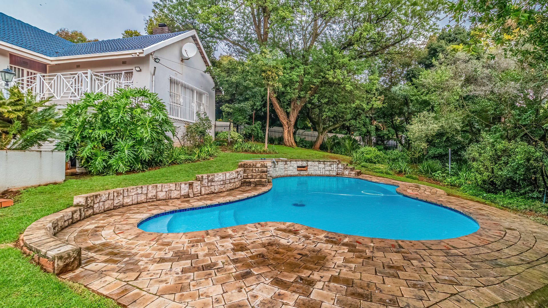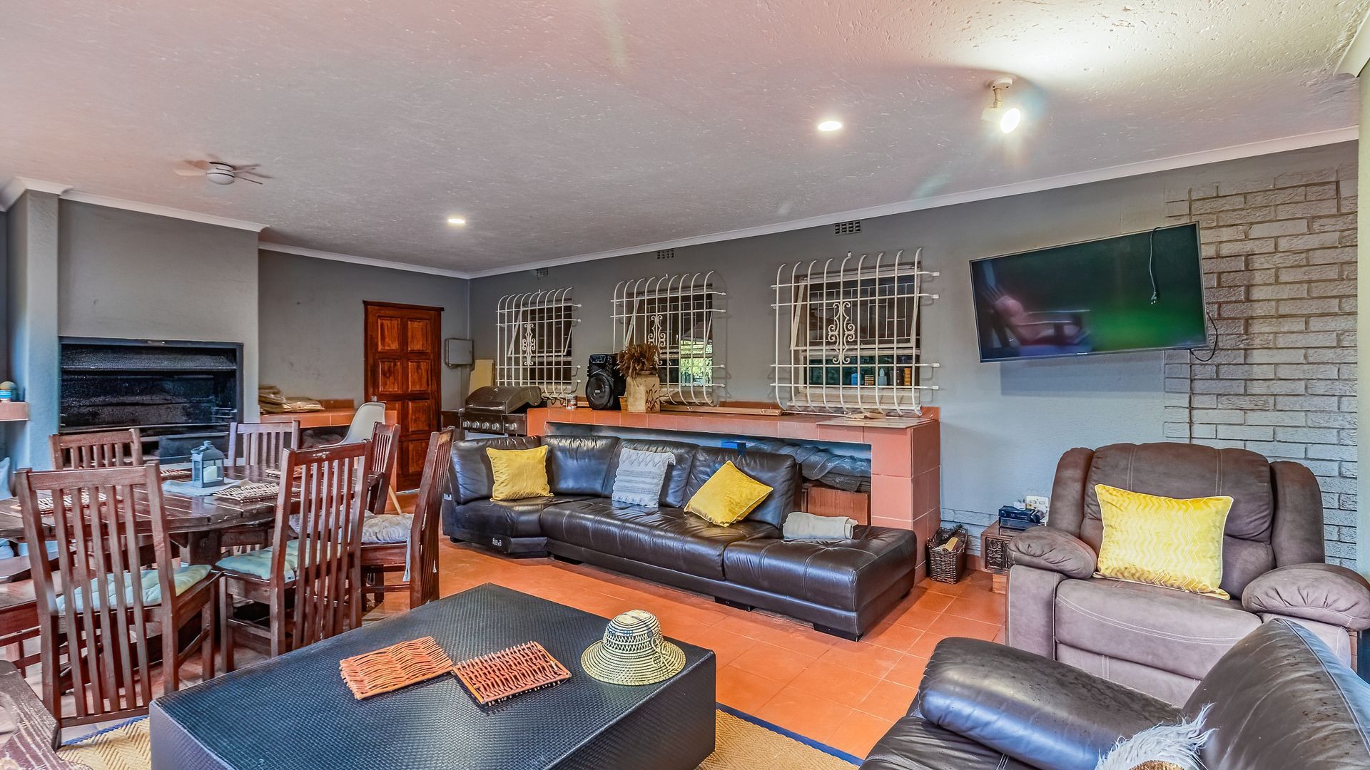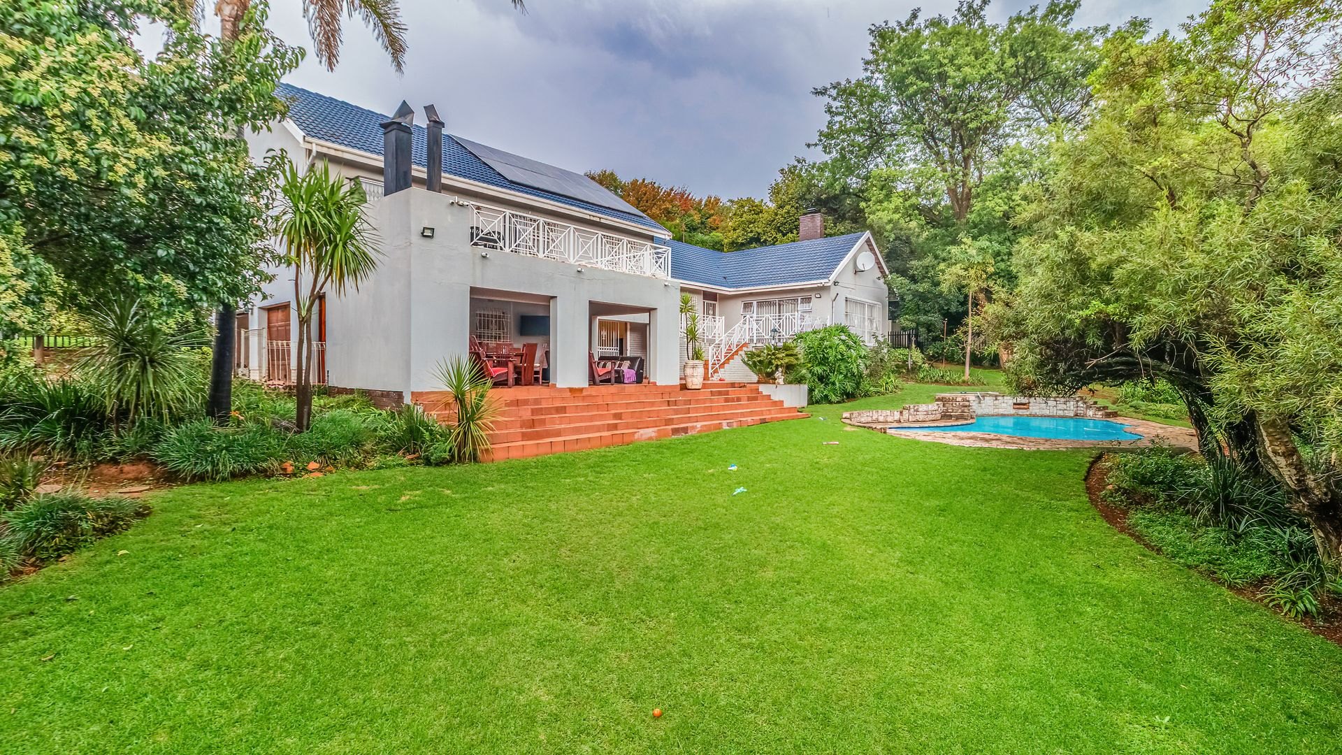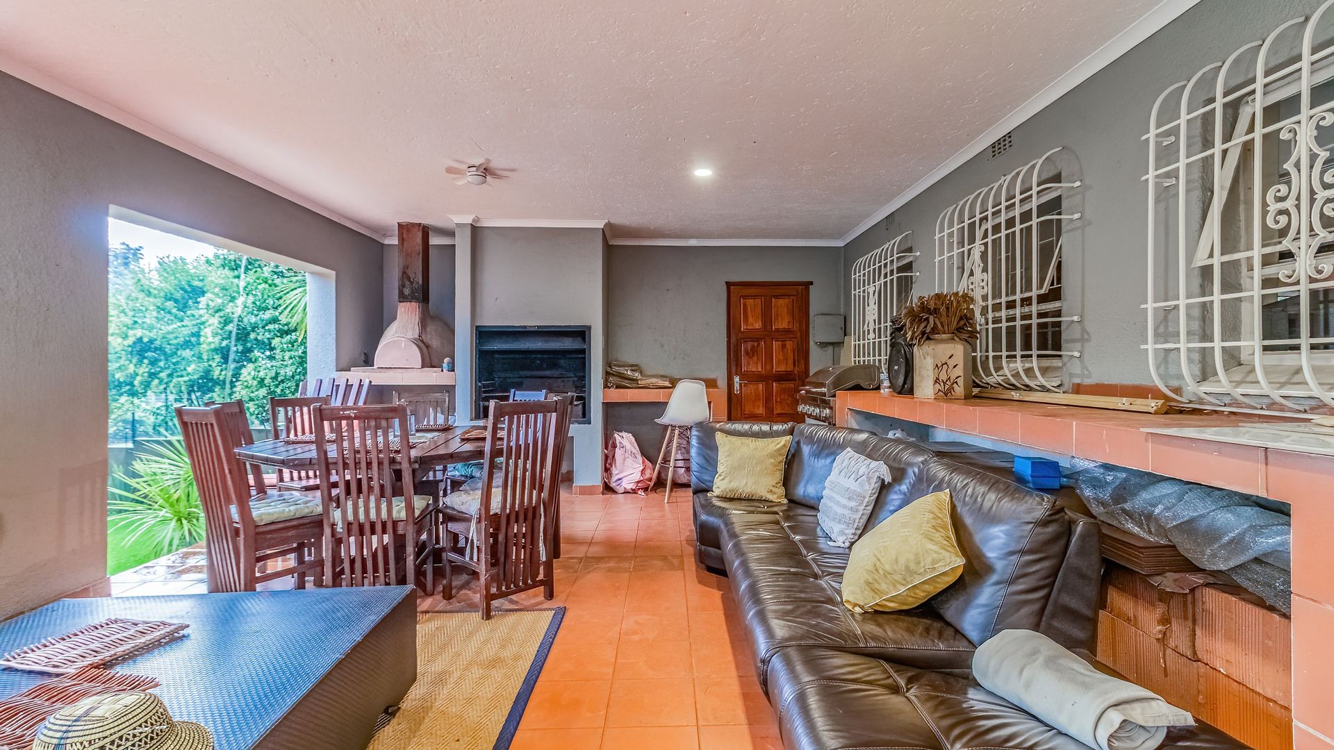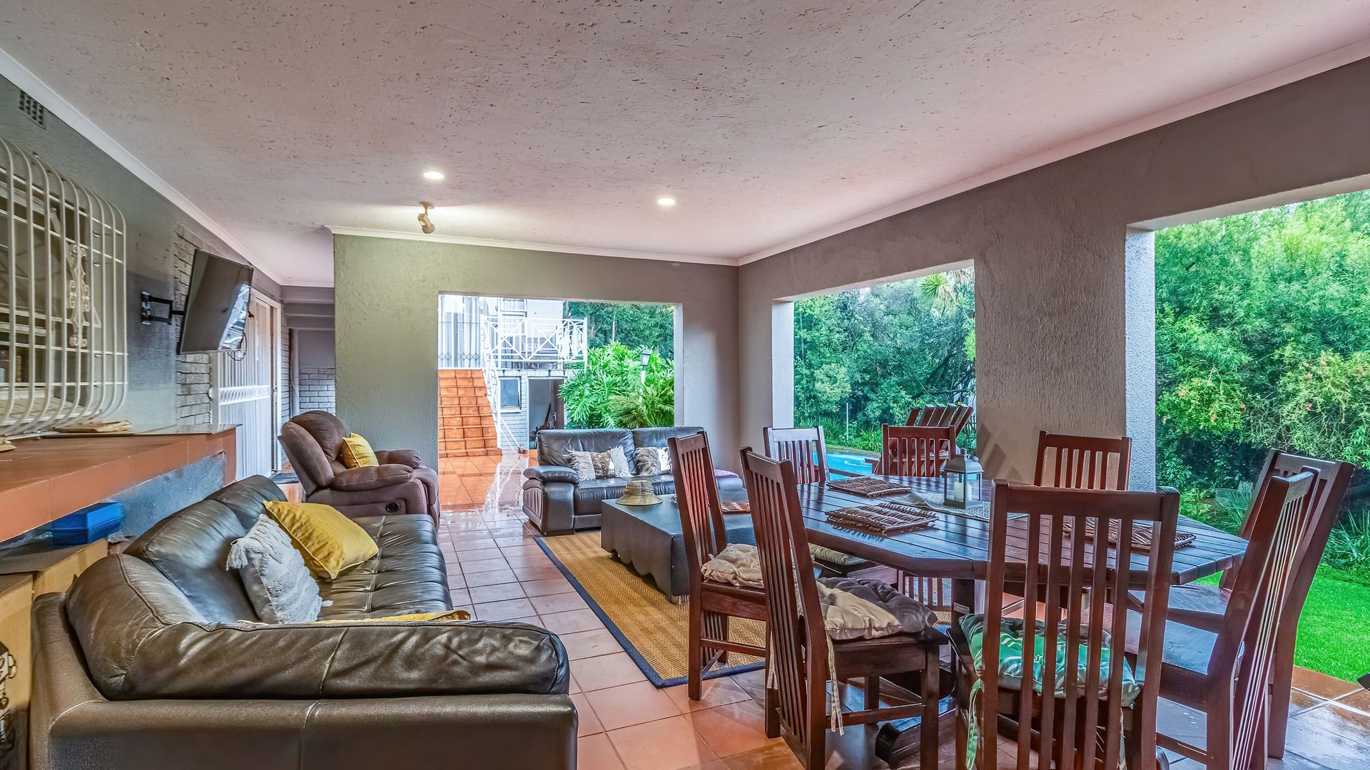 Step outside to an entertainer’s dream: a covered patio with a built-in braai and pizza oven, overlooking a sparkling, newly marbelited pool set within a beautifully maintained garden—perfect for gatherings all year round.