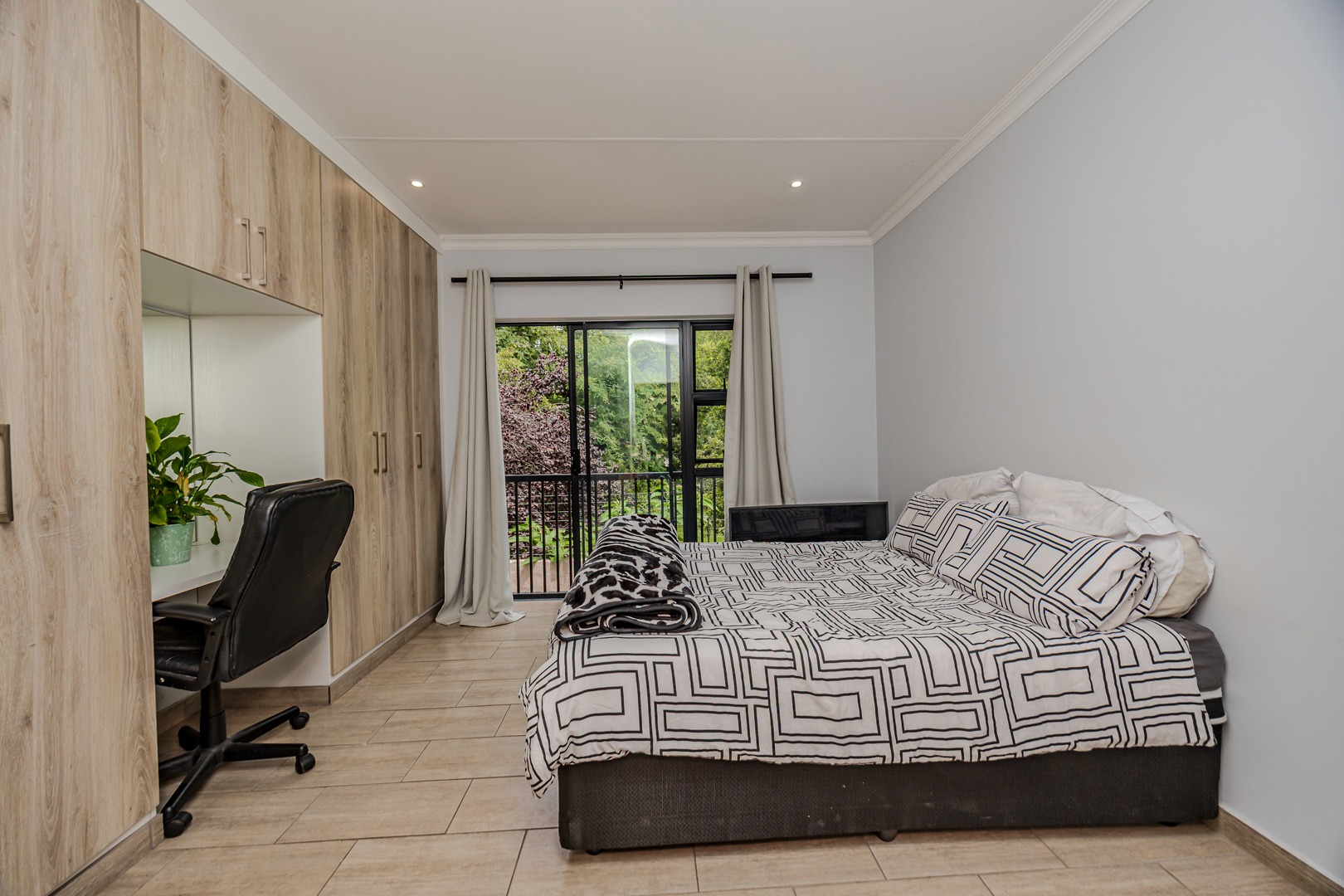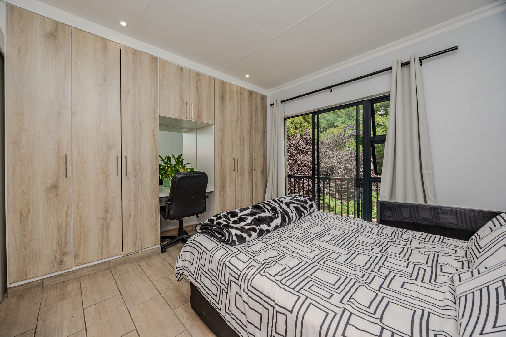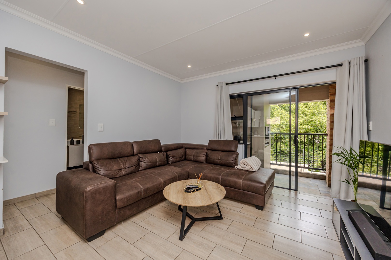 This immaculate unit offers a modern open-plan kitchen and TV lounge, designed for comfortable living and effortless entertaining. The living area flows seamlessly onto a private balcony complete with a built-in braai — ideal for relaxed evenings or hosting family and friends.