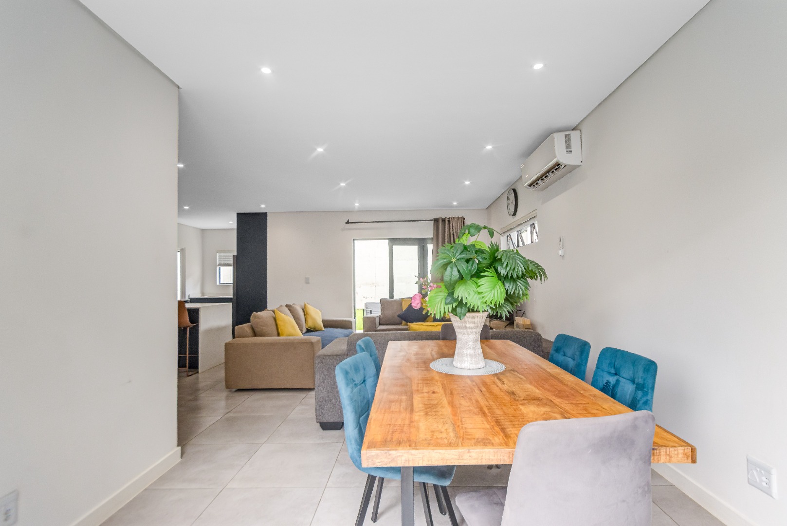 From the dining room, glass doors open out onto the garden, creating a seamless indoor-outdoor flow.
