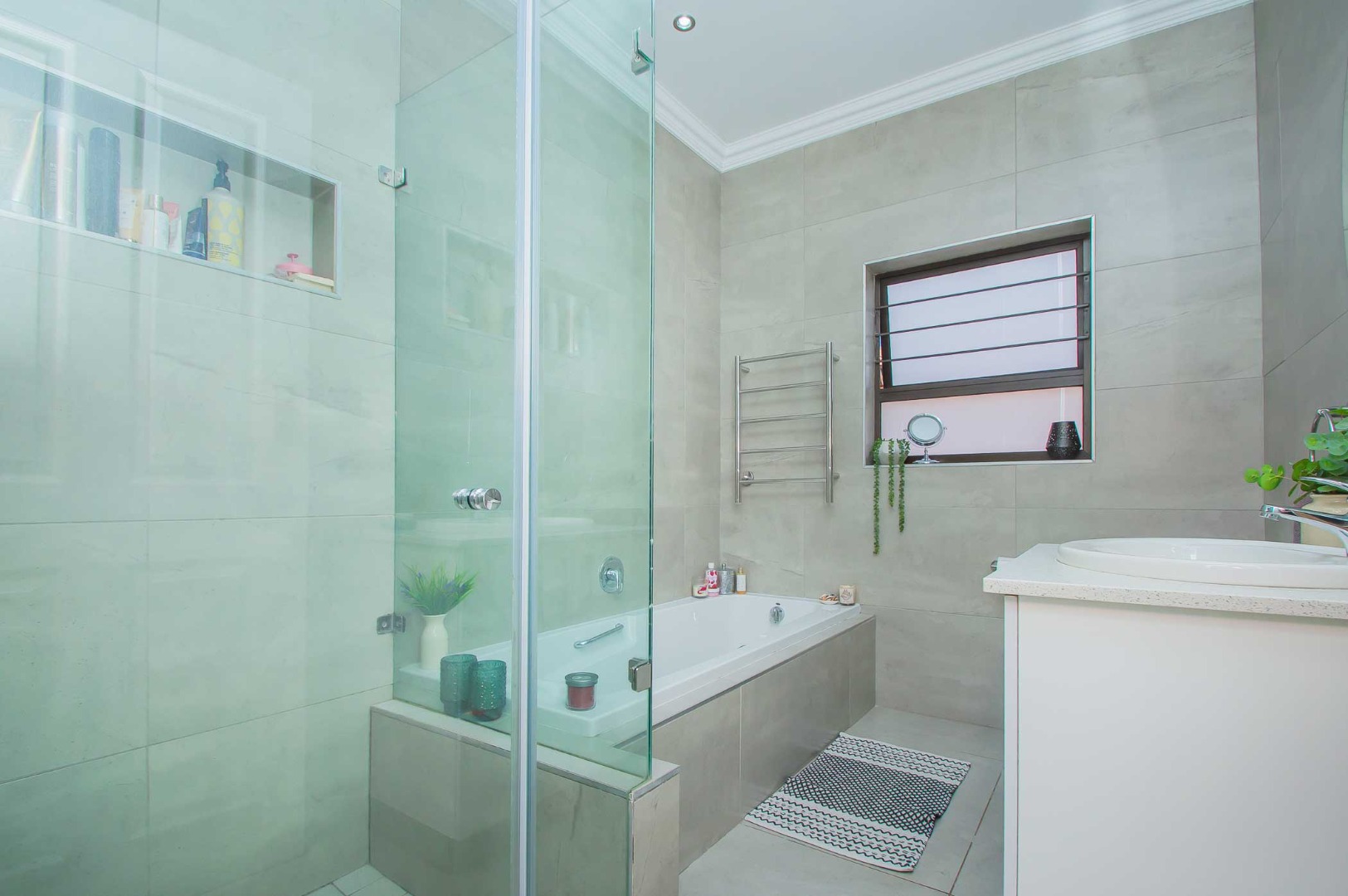 Three spacious and modern bedrooms that are airy and are completed with the finest details. The main bedroom is double volume in size, has a ceiling fan, a walk-in wardrobe and a modern en suite bathroom that is tiled to the roof and has a double sized shower, a heated towel rail, a toilet and a vanity with granite tops. The second and third bedrooms are large, both have ceiling fans, built-in cupboards and are complimented by the full modern second bathroom that has a shower, bathtub, vanity with granite tops, a toilet and a heated towel rail – the bathroom is tiled to the roof.