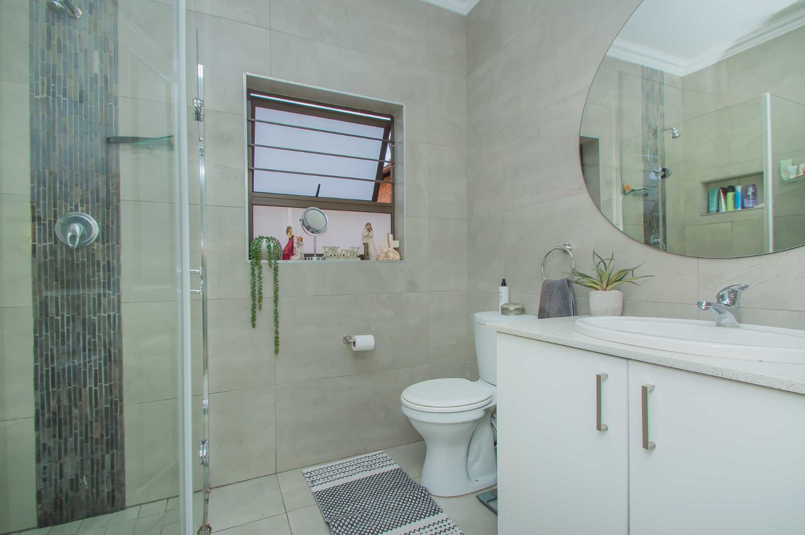 Three spacious and modern bedrooms that are airy and are completed with the finest details. The main bedroom is double volume in size, has a ceiling fan, a walk-in wardrobe and a modern en suite bathroom that is tiled to the roof and has a double sized shower, a heated towel rail, a toilet and a vanity with granite tops. The second and third bedrooms are large, both have ceiling fans, built-in cupboards and are complimented by the full modern second bathroom that has a shower, bathtub, vanity with granite tops, a toilet and a heated towel rail – the bathroom is tiled to the roof.