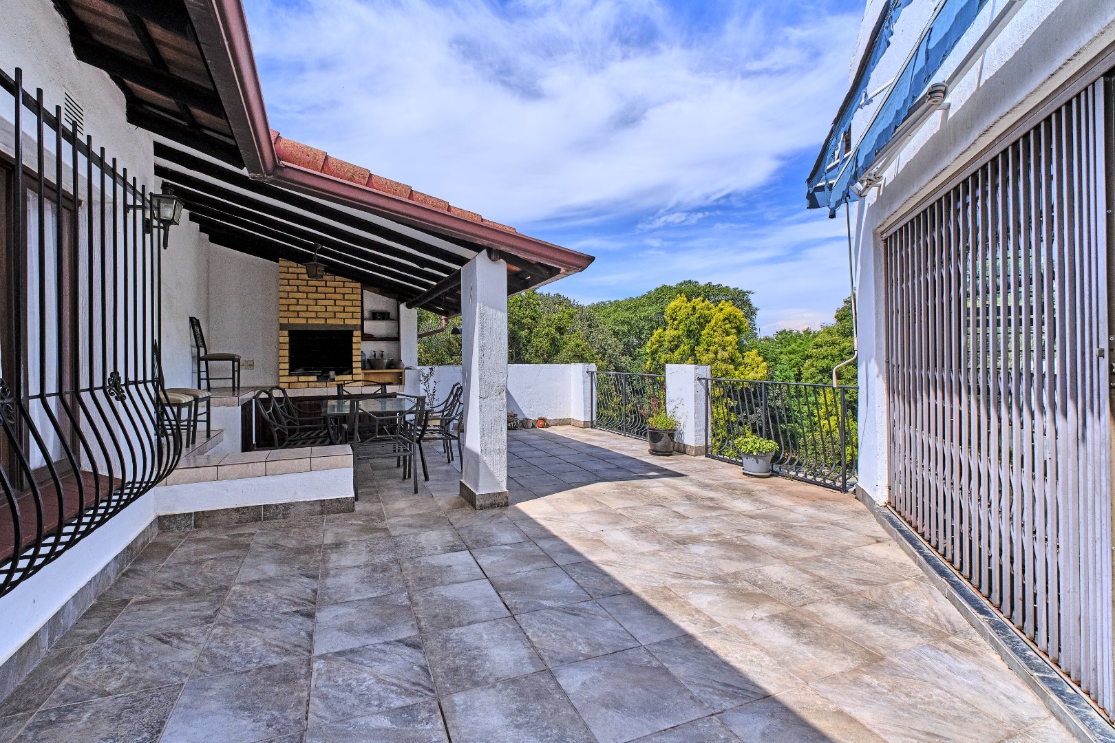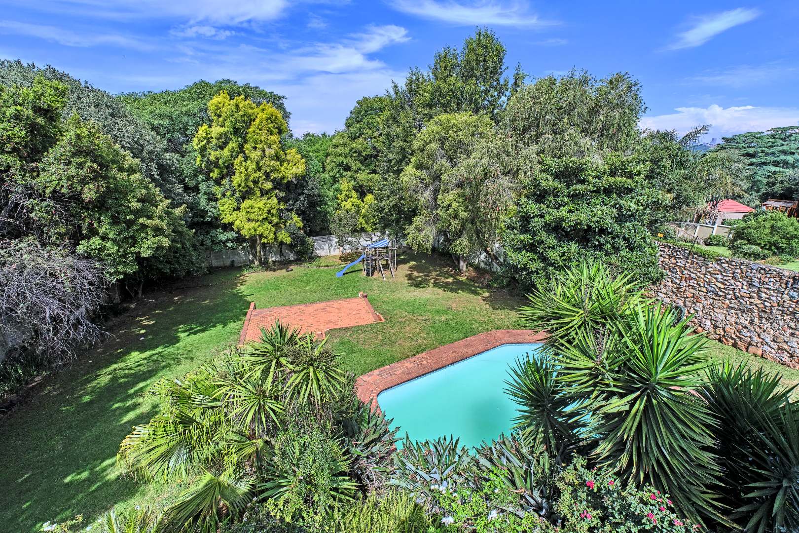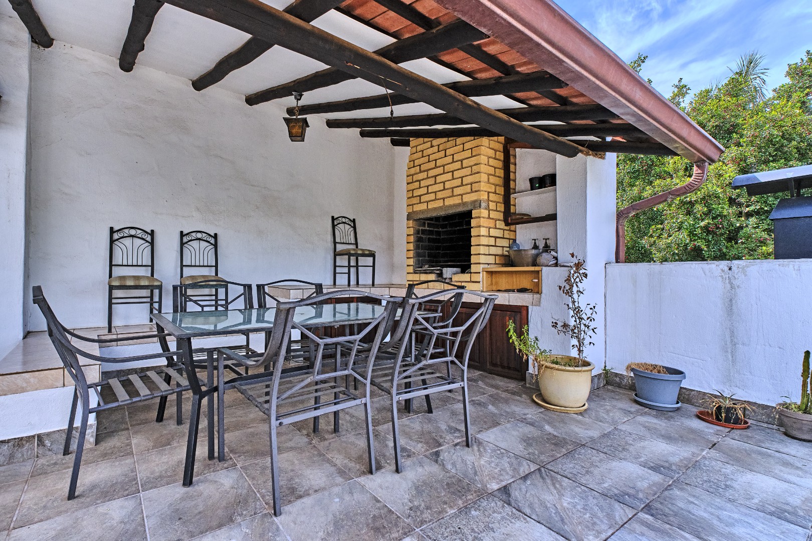 Outdoor living is a highlight, with a private swimming pool set within a verdant garden that also features a children's play area. On the upper level, a spacious tiled balcony, complete with a built-in braai and covered sections, provides an ideal setting for al fresco dining and entertaining while enjoying the scenic views. Practical amenities include two garages and eight additional parking spaces, ensuring ample accommodation for vehicles. Domestic rooms and outside toilets are also present.