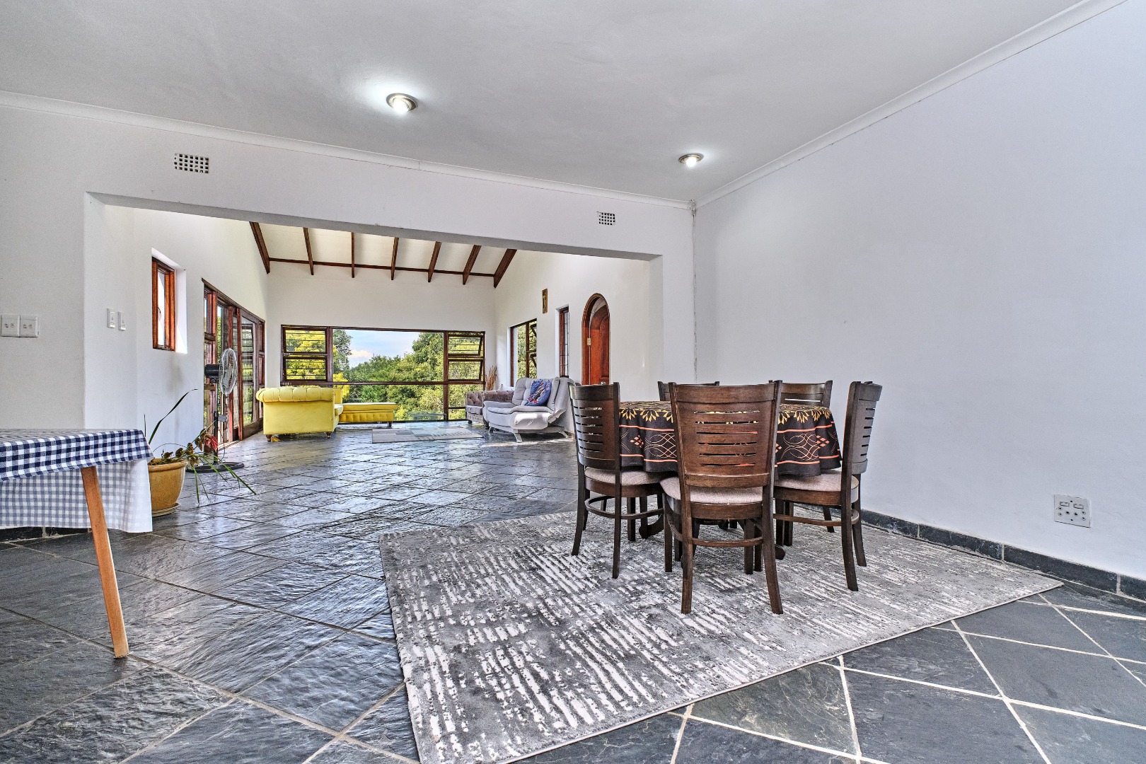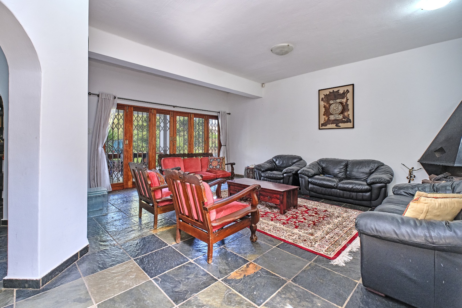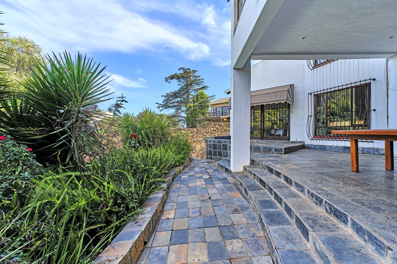 Outdoor living is a highlight, with a private swimming pool set within a verdant garden that also features a children's play area. On the upper level, a spacious tiled balcony, complete with a built-in braai and covered sections, provides an ideal setting for al fresco dining and entertaining while enjoying the scenic views. Practical amenities include two garages and eight additional parking spaces, ensuring ample accommodation for vehicles. Domestic rooms and outside toilets are also present.
