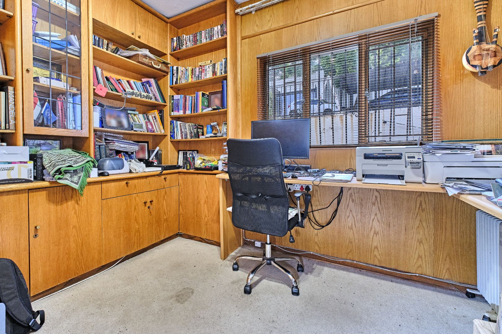Step inside to discover a thoughtfully laid-out interior featuring four distinct lounges and a dedicated dining room, providing ample space for both relaxation and entertaining. The large windows throughout ensure abundant natural light and frame picturesque views of lush greenery and a distant city skyline. High vaulted ceilings with exposed beams enhance the sense of spaciousness in key living areas, creating an airy and open atmosphere. The property includes a well-appointed kitchen, an entrance hall, and a study for added functionality.