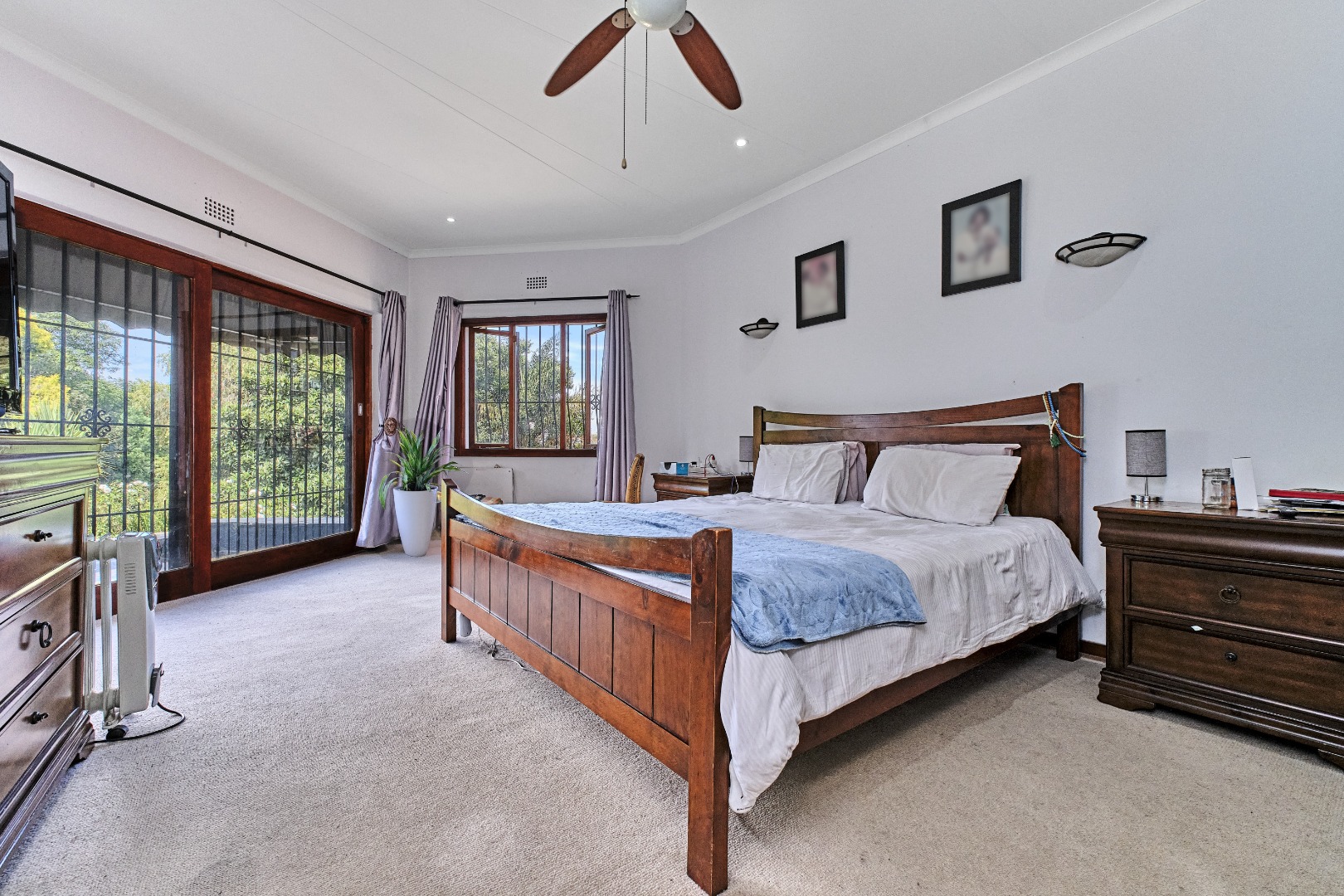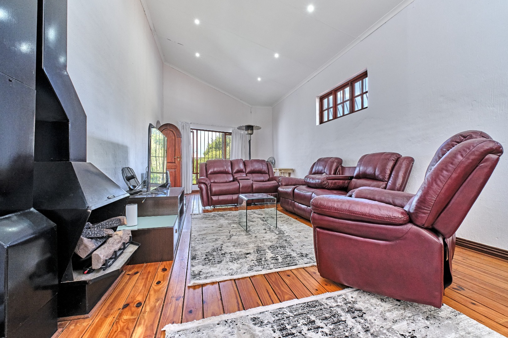 Outdoor living is a highlight, with a private swimming pool set within a verdant garden that also features a children's play area. On the upper level, a spacious tiled balcony, complete with a built-in braai and covered sections, provides an ideal setting for al fresco dining and entertaining while enjoying the scenic views. Practical amenities include two garages and eight additional parking spaces, ensuring ample accommodation for vehicles. Domestic rooms and outside toilets are also present.