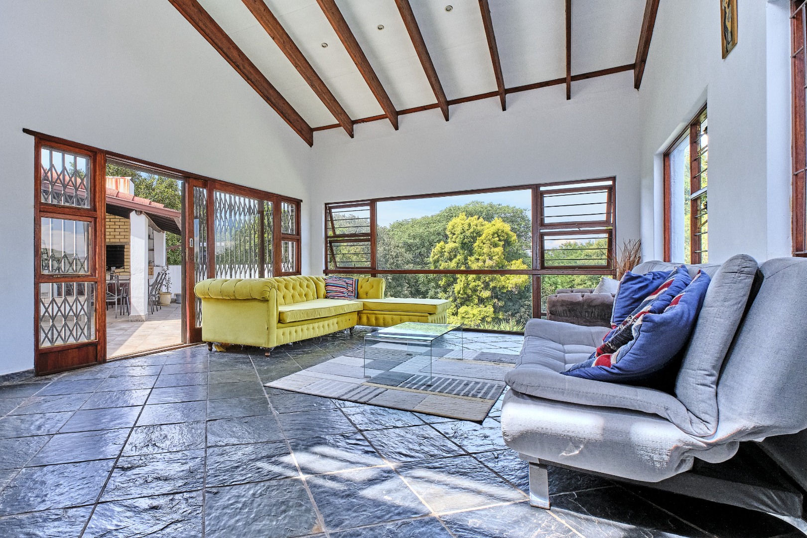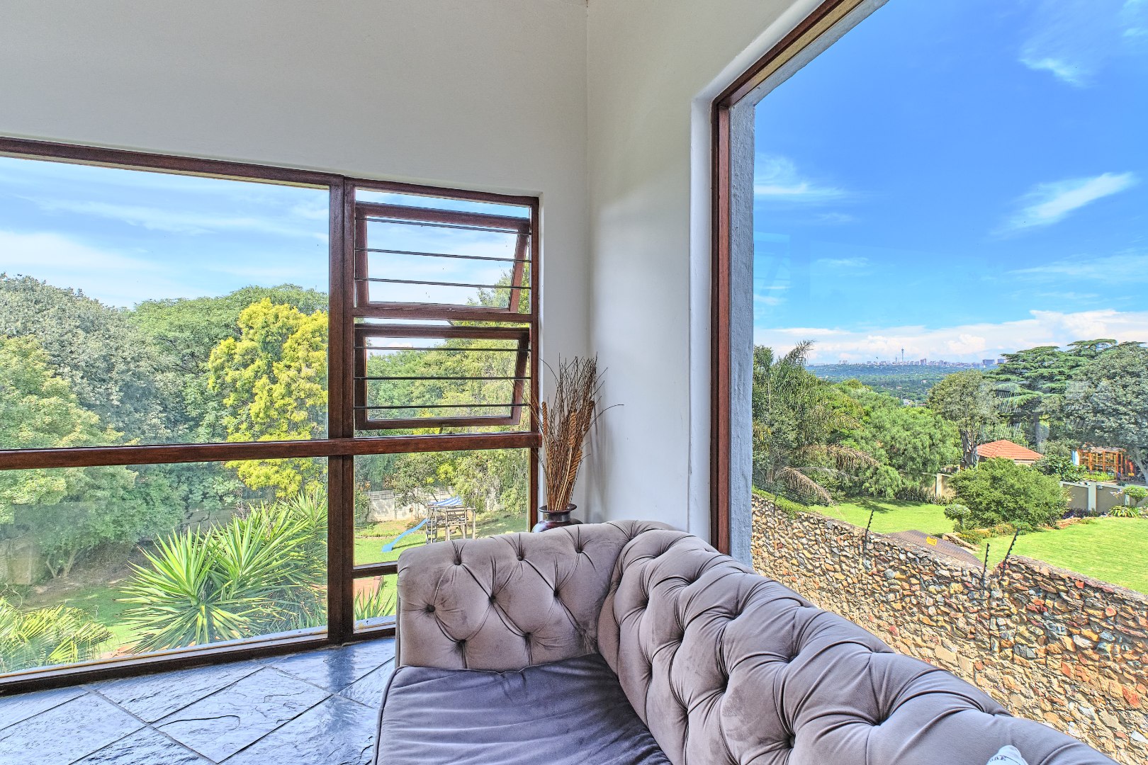 Step inside to discover a thoughtfully laid-out interior featuring four distinct lounges and a dedicated dining room, providing ample space for both relaxation and entertaining. The large windows throughout ensure abundant natural light and frame picturesque views of lush greenery and a distant city skyline. High vaulted ceilings with exposed beams enhance the sense of spaciousness in key living areas, creating an airy and open atmosphere. The property includes a well-appointed kitchen, an entrance hall, and a study for added functionality.