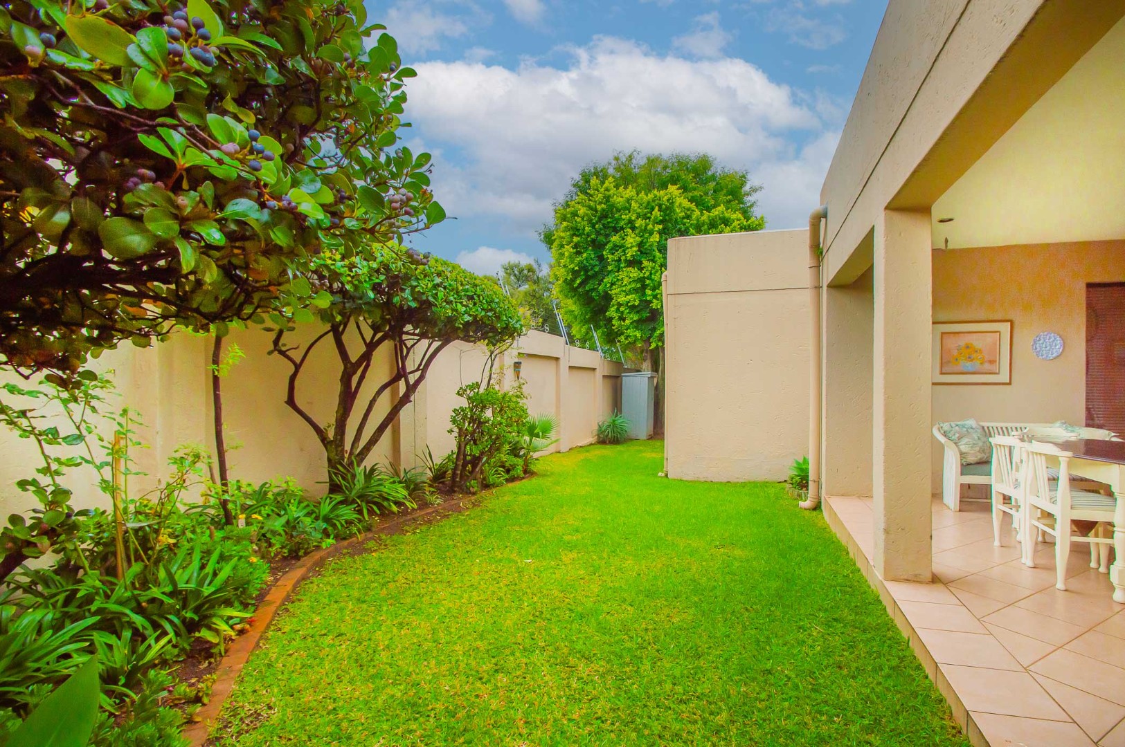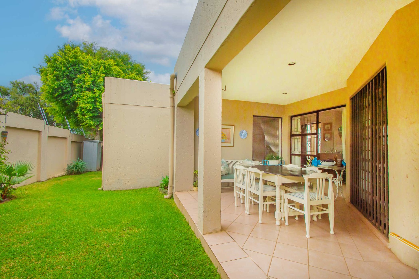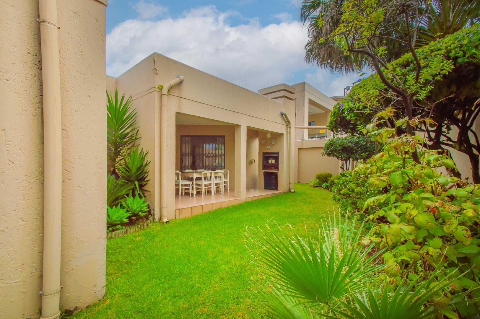 Enjoy outdoor dining and gatherings year-round on the covered patio, complete with a built-in braai, overlooking a neat and manageable garden.