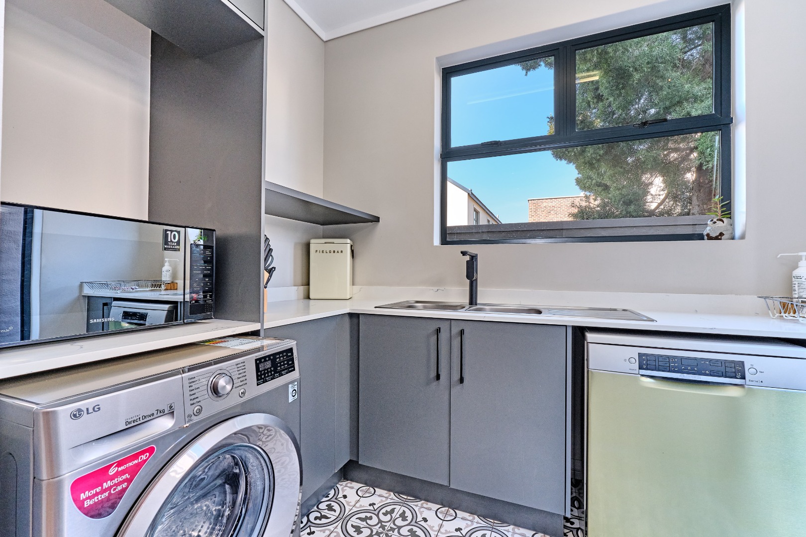 The stunning kitchen features Caesar stone countertops, ample storage space, a gas stove, and an electric oven. A separate scullery and laundry room are equipped to accommodate a washing machine, dishwasher, and tumble dryer.